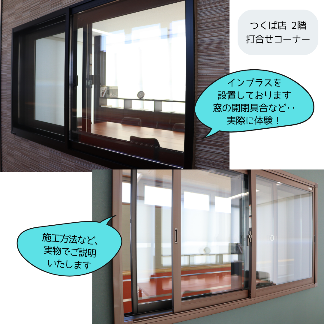 つくば店の2階にはインプラスを設置しており、二重窓の開閉具合を実際に体験できて、