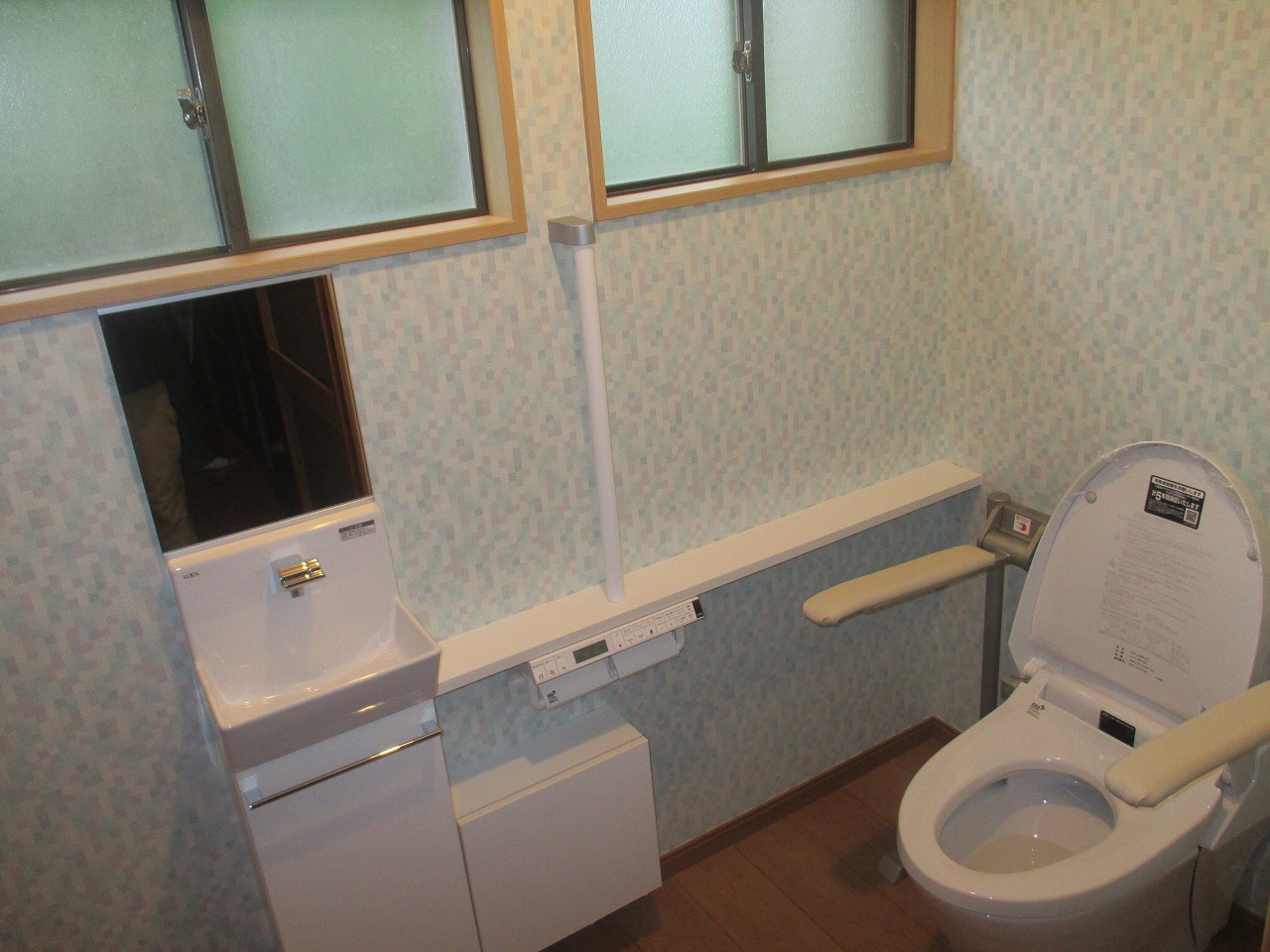 小便器と洋式で仕切られていた壁を撤去し、広いトイレへと変身、家族皆が安心して使えるトイレになりました。