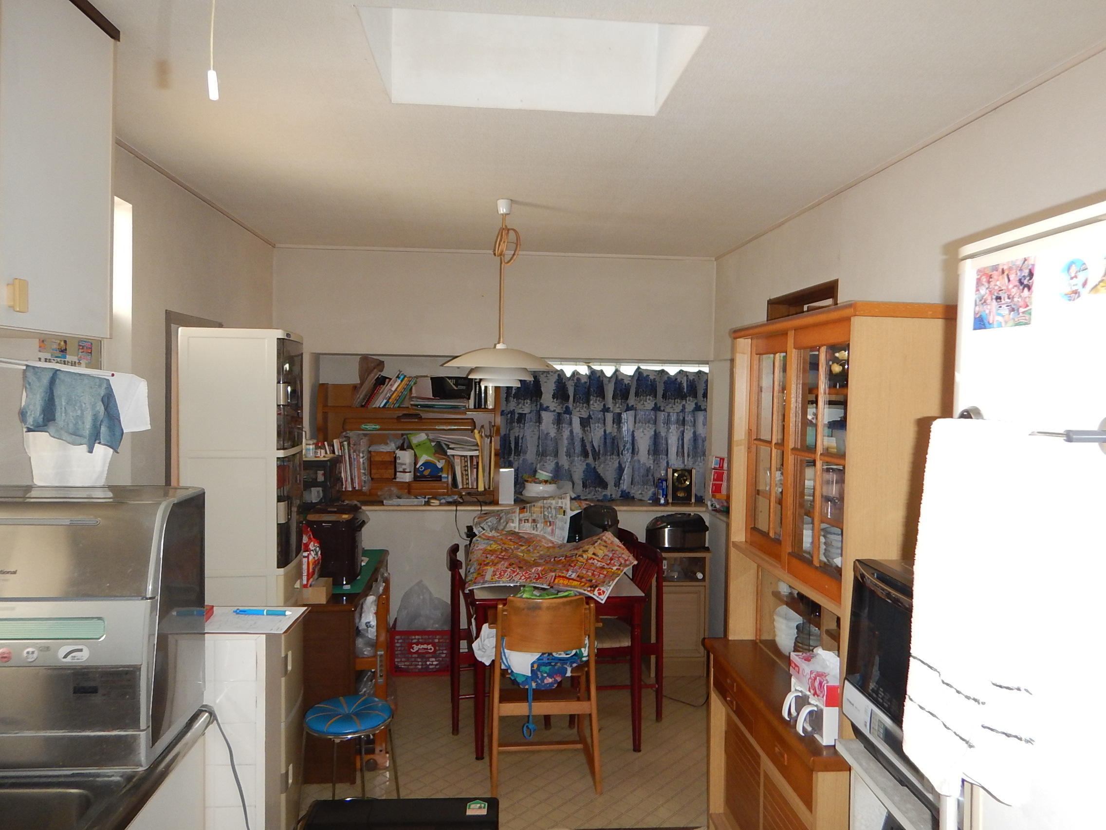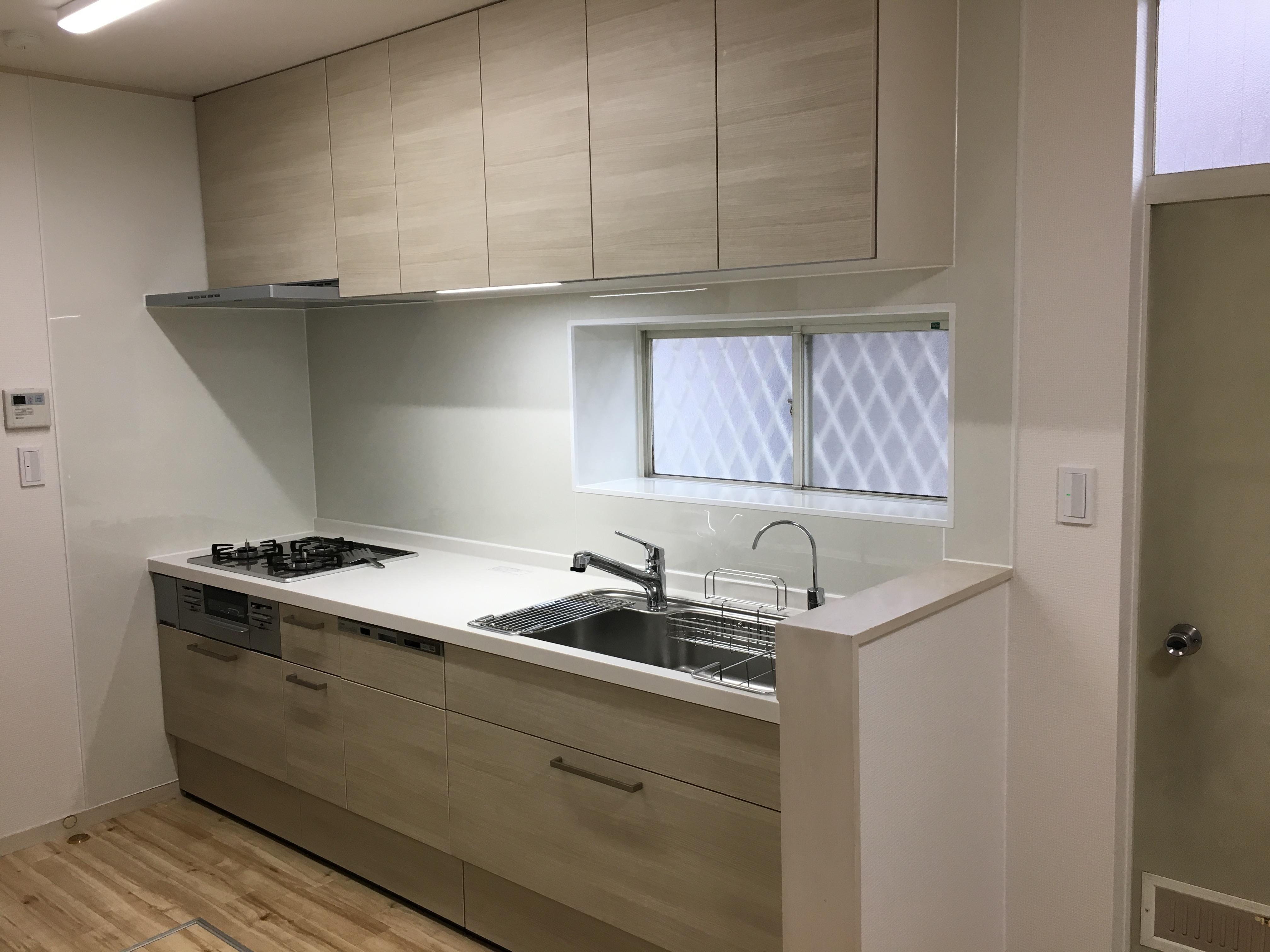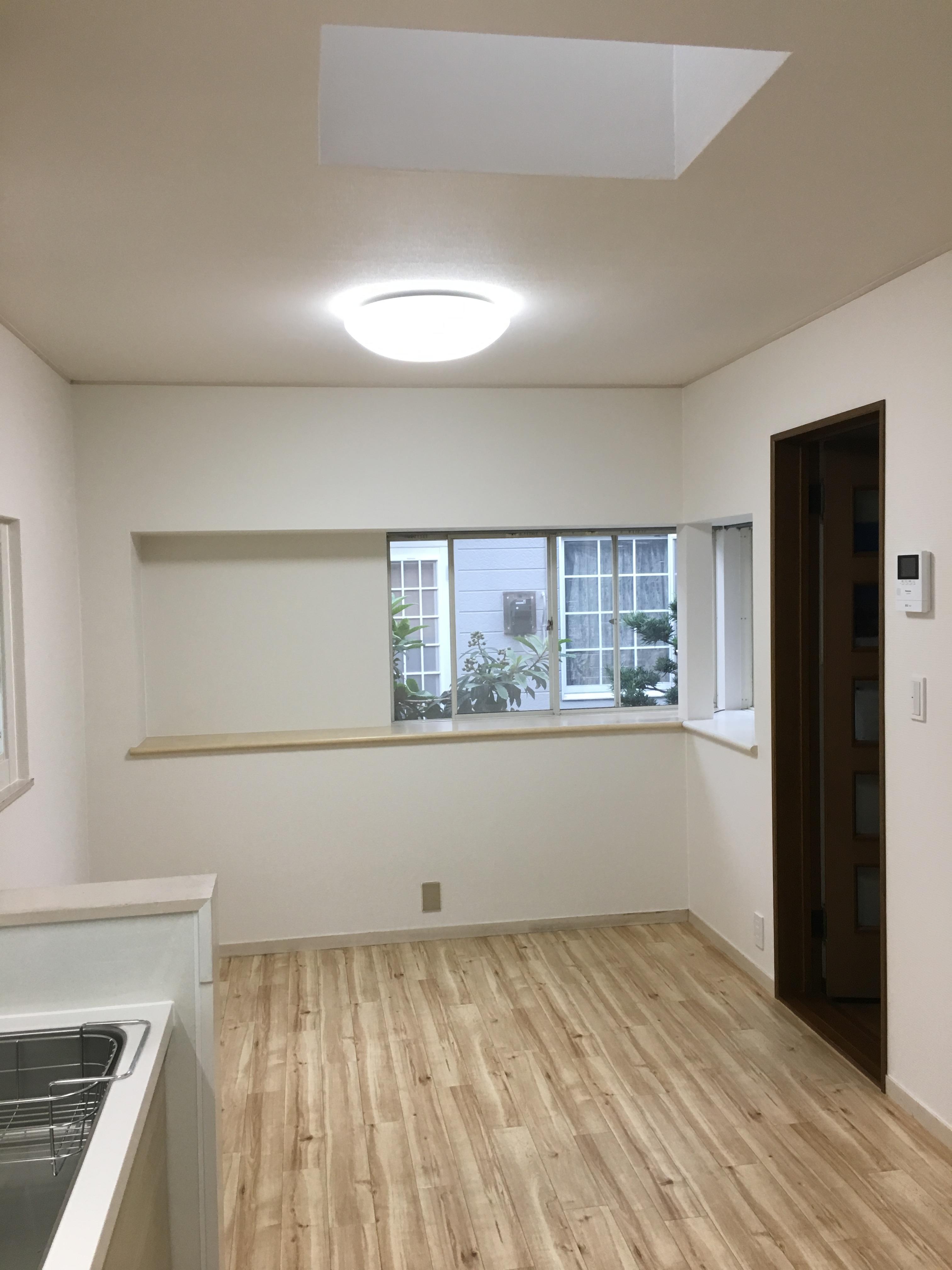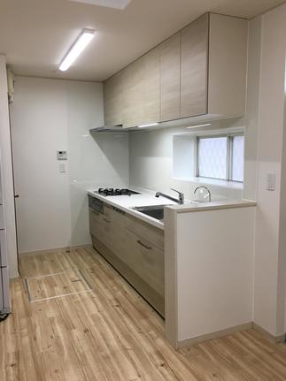 床はキッチンと同じ木目調のクッションフロアを使用しています。フローリングに見えますがフローリングよりもお手入れが楽ですよ