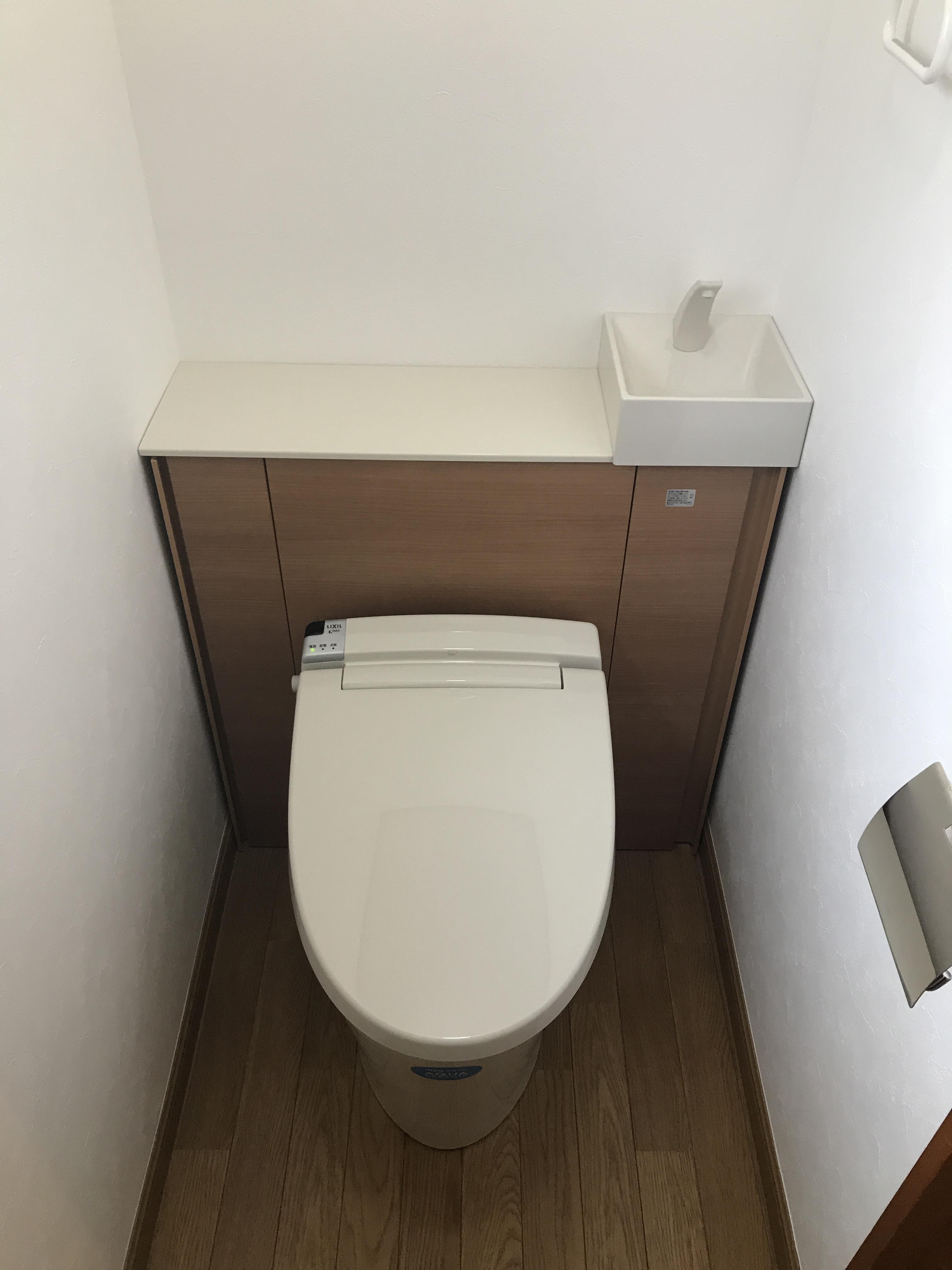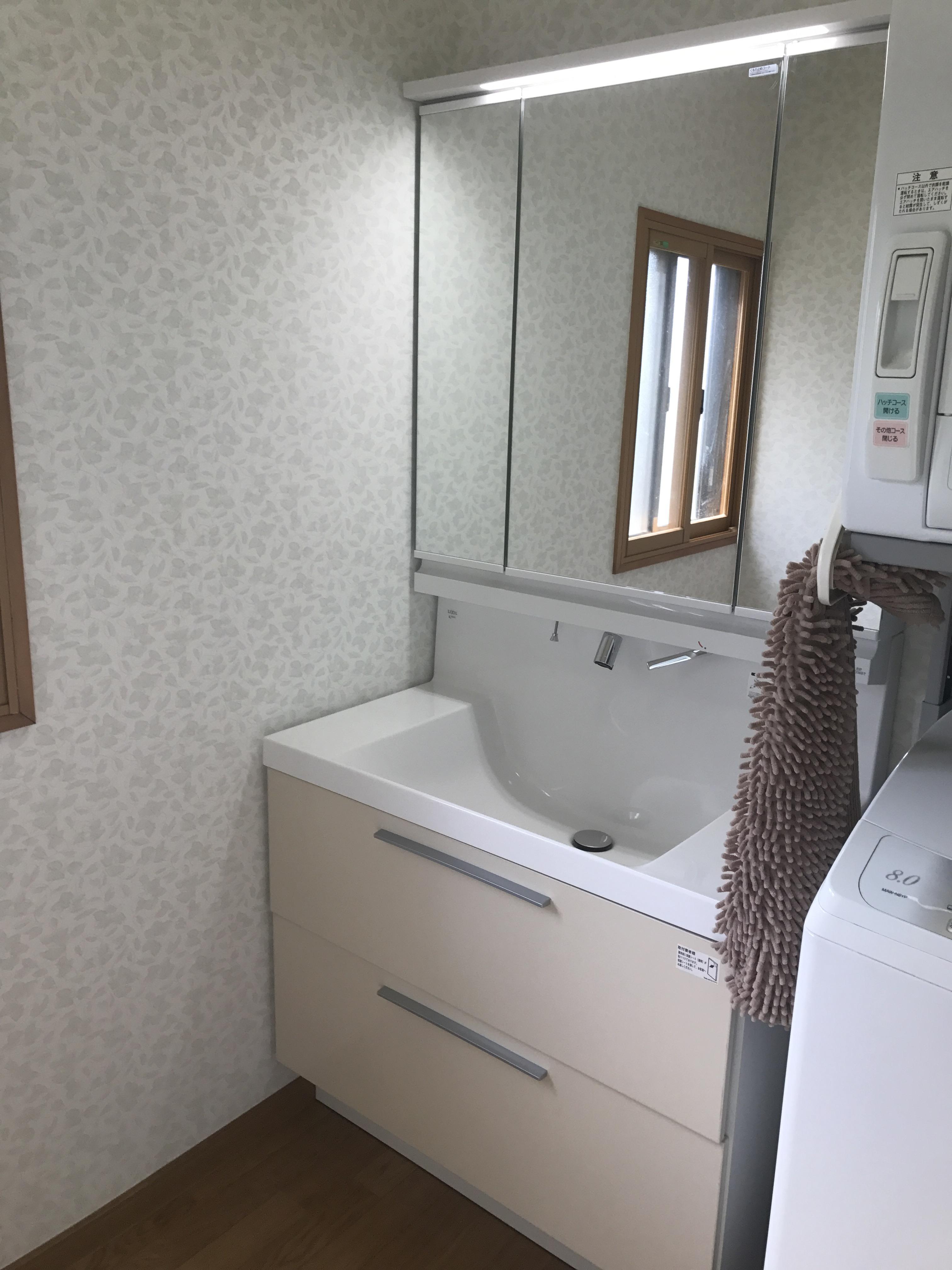 洗面化粧台の交換、壁、床、天井の貼り替えを行いました。洗面脱衣室は湿気が多く壁や床の傷みが目立つ場所です。内装がキレイなり洗面脱衣室が一新しました。
