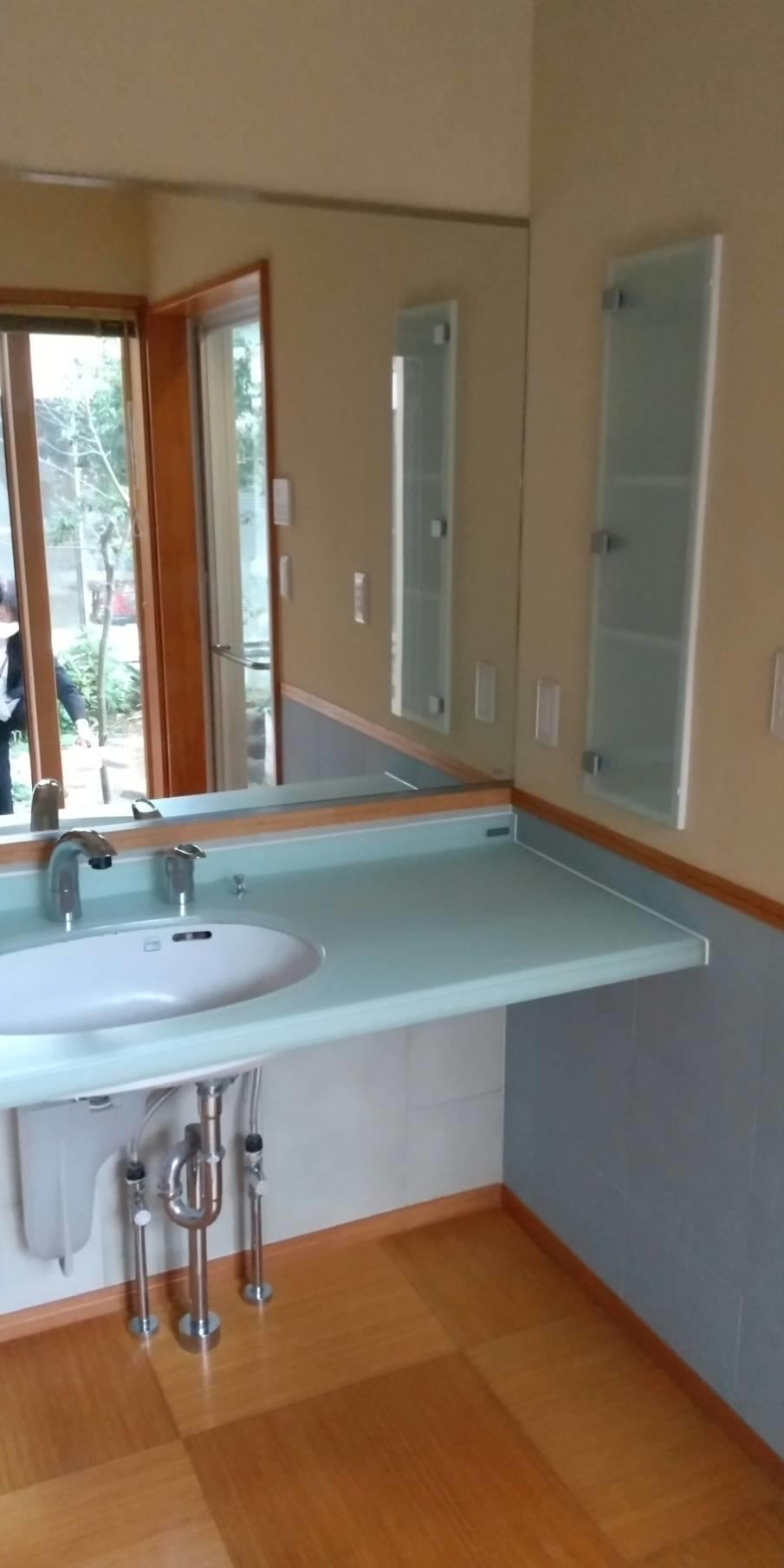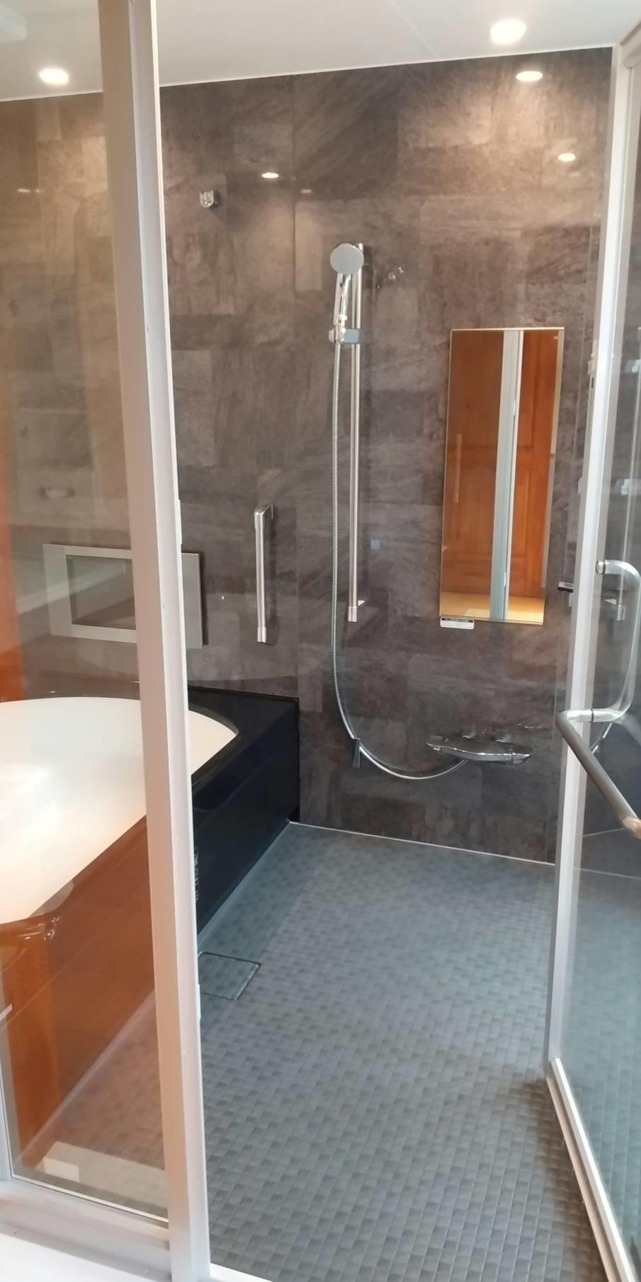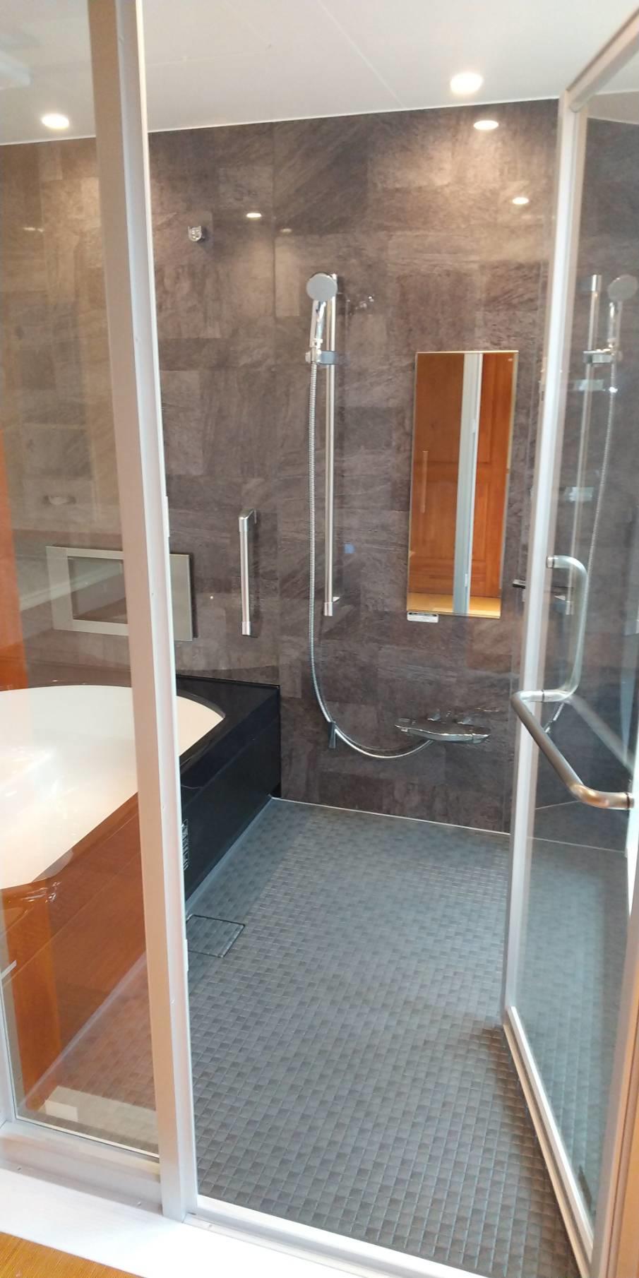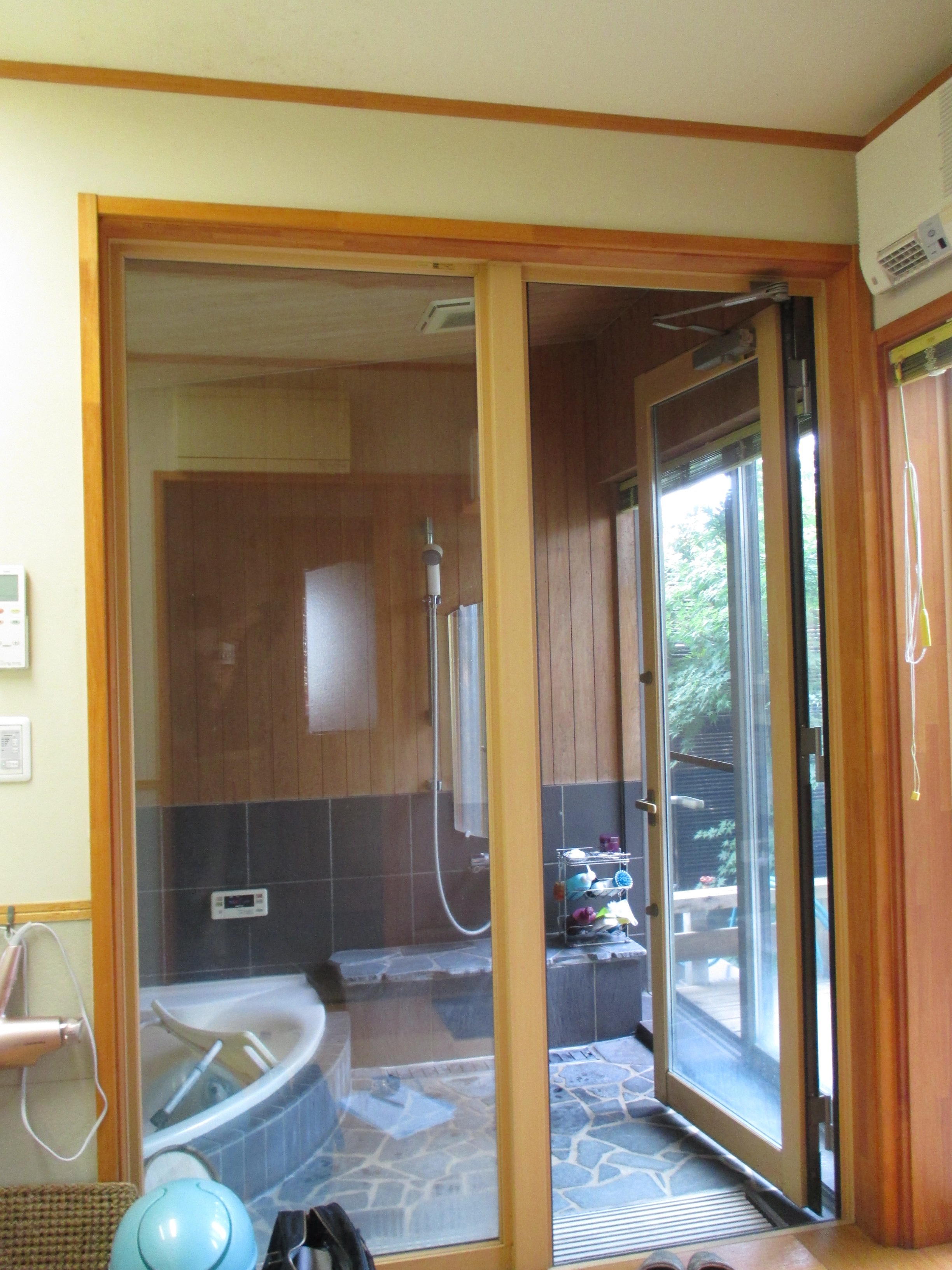 旅館のような素敵な浴室でしたが、水漏れが直らず ユニットバスに交換しました。 ユニットバスはLIXILのスパージュを採用しています。 また、浴室から中庭に出入りするテラスドアはLow-E複層ガラスの テラスドアを採用し遮熱、断熱にも考慮しました。