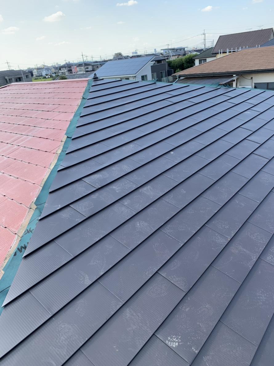 直射日光や風雨で劣化し傷んでしまった屋根の葺き替えです。棟材下地撤去後、既存屋根にルーフィングシートを下貼りし、その上に屋根材を葺いていきます。ルーフィングシートを下貼りるすことで防水性がアップし屋根材の寿命も伸びます。