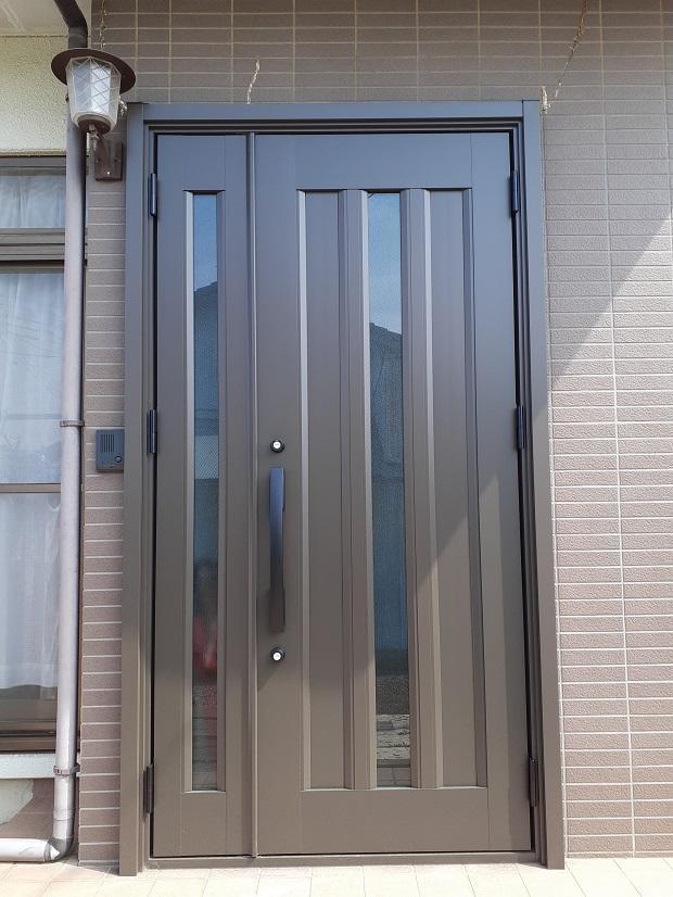 以前の玄関ドアは、ドアクローザーが壊れてしまい「バタン!!」と勢いよく閉まってしまうため、ドアのガラスの部分が割れてしまいました。 そのことがきっかけとなり玄関ドア交換のご依頼をいただきました。玄関ドアは1Dayリフォームのリシェント、親子ドアを採用しています。
