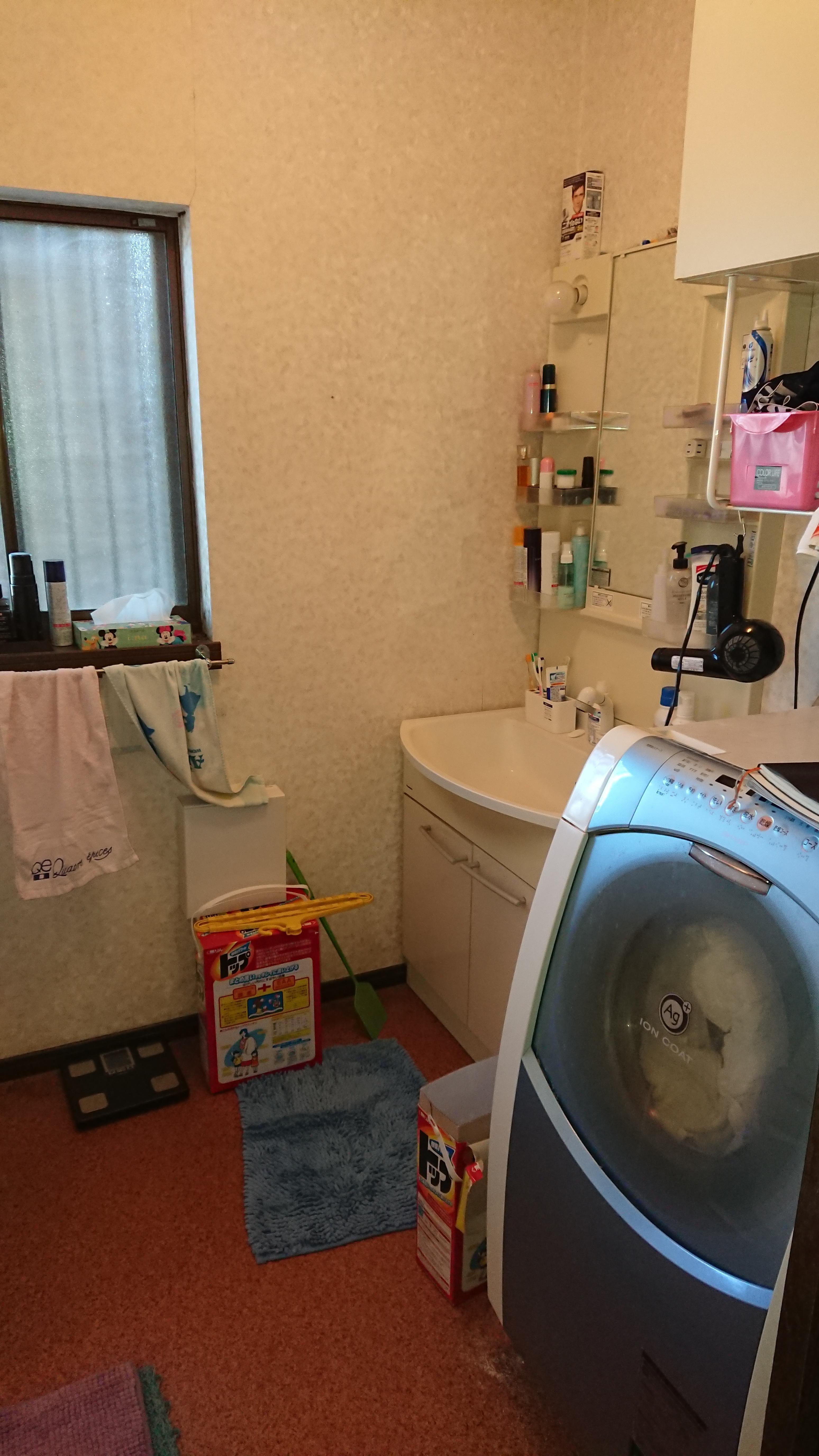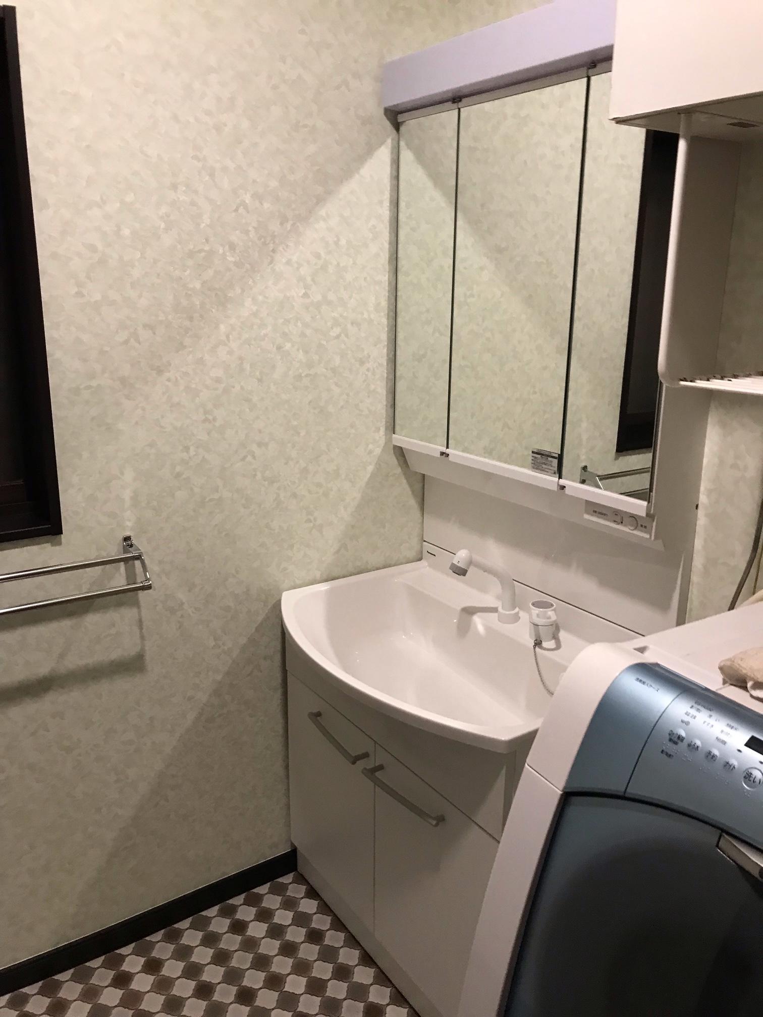 浴室と一緒に洗面脱衣室もキレイにしたいと洗面化粧台の交換と内装を貼替えました。なるべく予算を抑えたいとのご要望に応じて洗面化粧台はPanasonicのMラインを採用しました。シンプルな洗面化粧台がモダンな柄の床に映えておしゃれな空間が出来上がりました。
