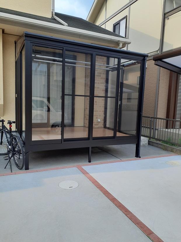 洗濯物を干せるスペースがご希望で「テラス囲い」LIXILのサニージュを設置しました。 本体の色はブラック、幅約2.8m×奥行2.7mのサイズです。 屋根材は日差しの熱を効果的にカットする熱戦吸収タイプのポリカーボネートで日射による室内温度の上昇を軽減してくれます。
