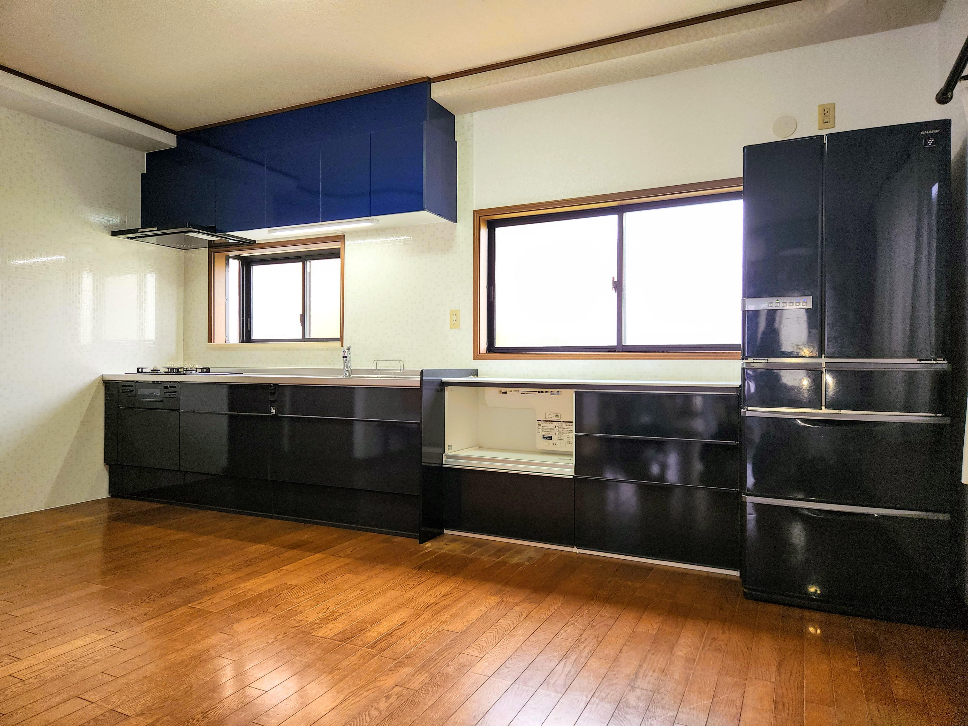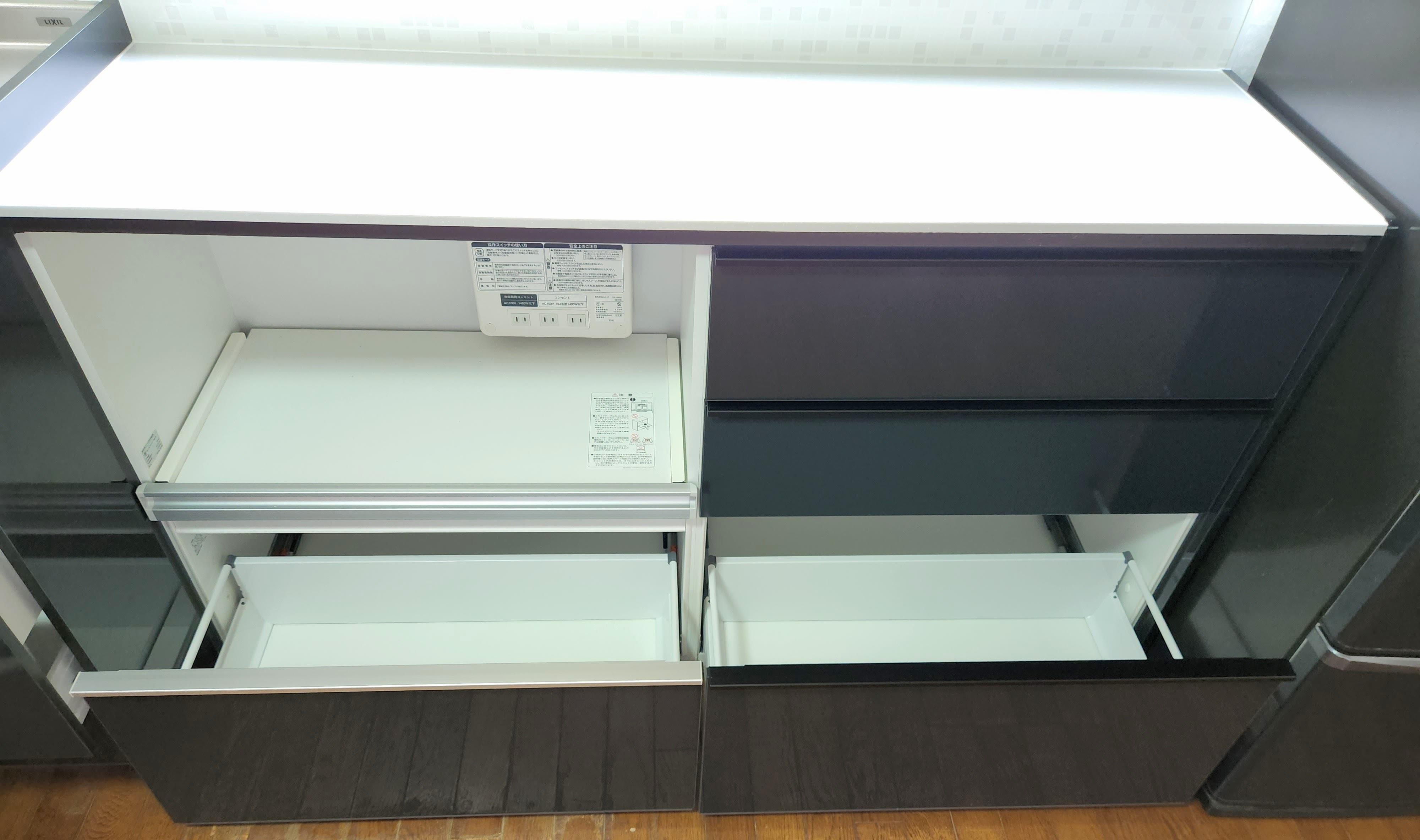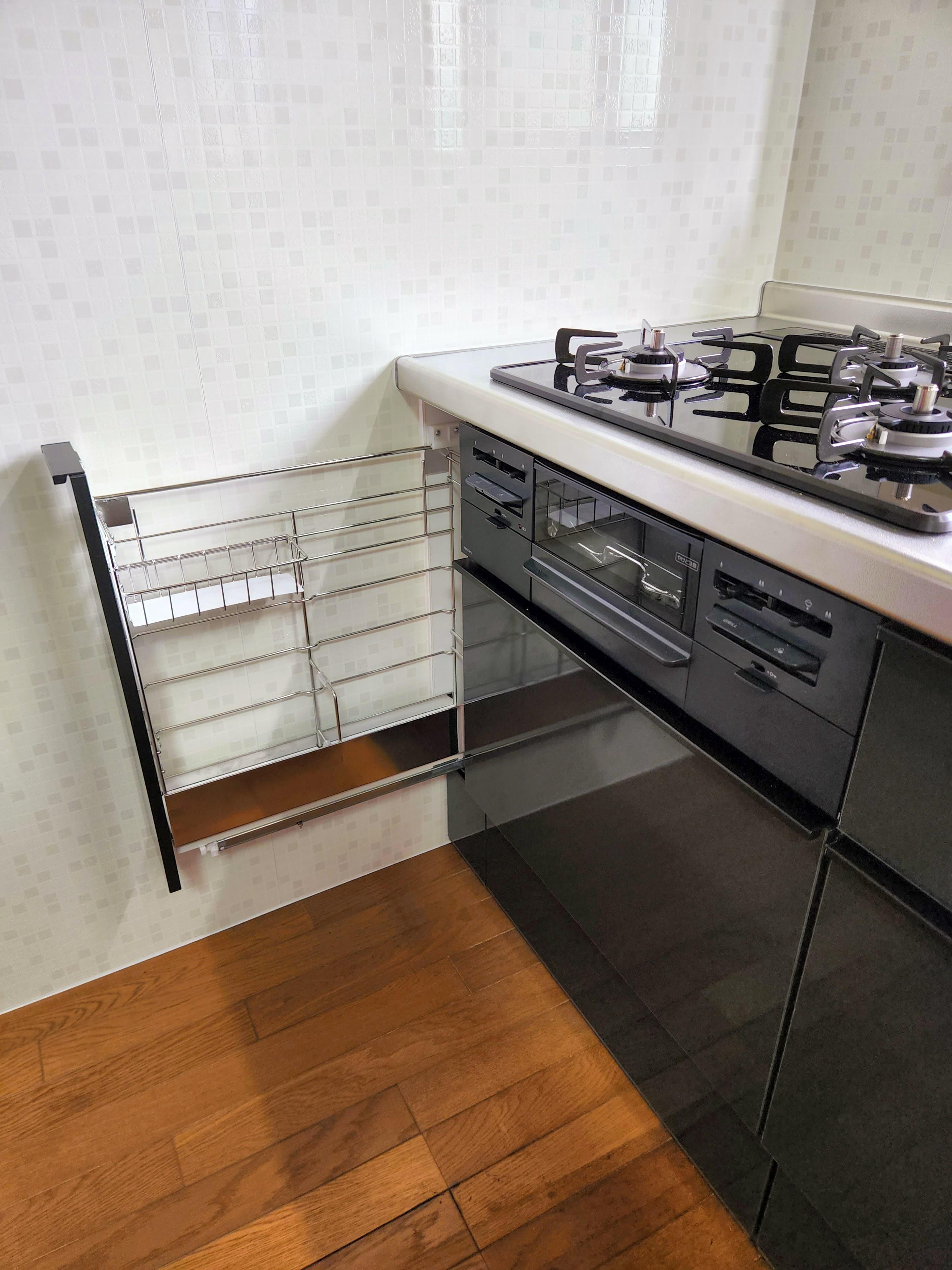 L型のキッチンからI形のキッチンへと交換しました。今までのキッチンで使いにくかった点は改善し、使いやすかった点はそのまま後継したお施主様カスタマイズのキッチンです。キッチンはLIXILのシエラをお選びいただきました。大きなお鍋がたくさんあり収納にお困りとのことなので、スライドストッカーはシェルフありとなしを組み合わせ、高さのあるお鍋もらくに収納できるようになりました。また、以前のキッチンは豪華な人造大理石の天板でしたが、熱いものを置くのに気を使っていたとのことで、天板は普段使いしやすいステンレスをお選びになりました。他にも、調味料を入れるのにちょうどいいスライドバスケットは以前のキッチンにもあり後継しました。そして、一番のご要望はキッチンにコンセントが欲しいとのこと。シエラにはシンクのキャビネットに2口のキッチンコンセントが付いているのでお施主様の一番にお応えすることができました。また、キッチンの隣には同じお色で揃えた家電収納を設置したので食器類もたくさん収納できます。お施主様にとって必要なもの好きなものだけで揃えた見た目も中身も男前なキッチンに仕上がりました。