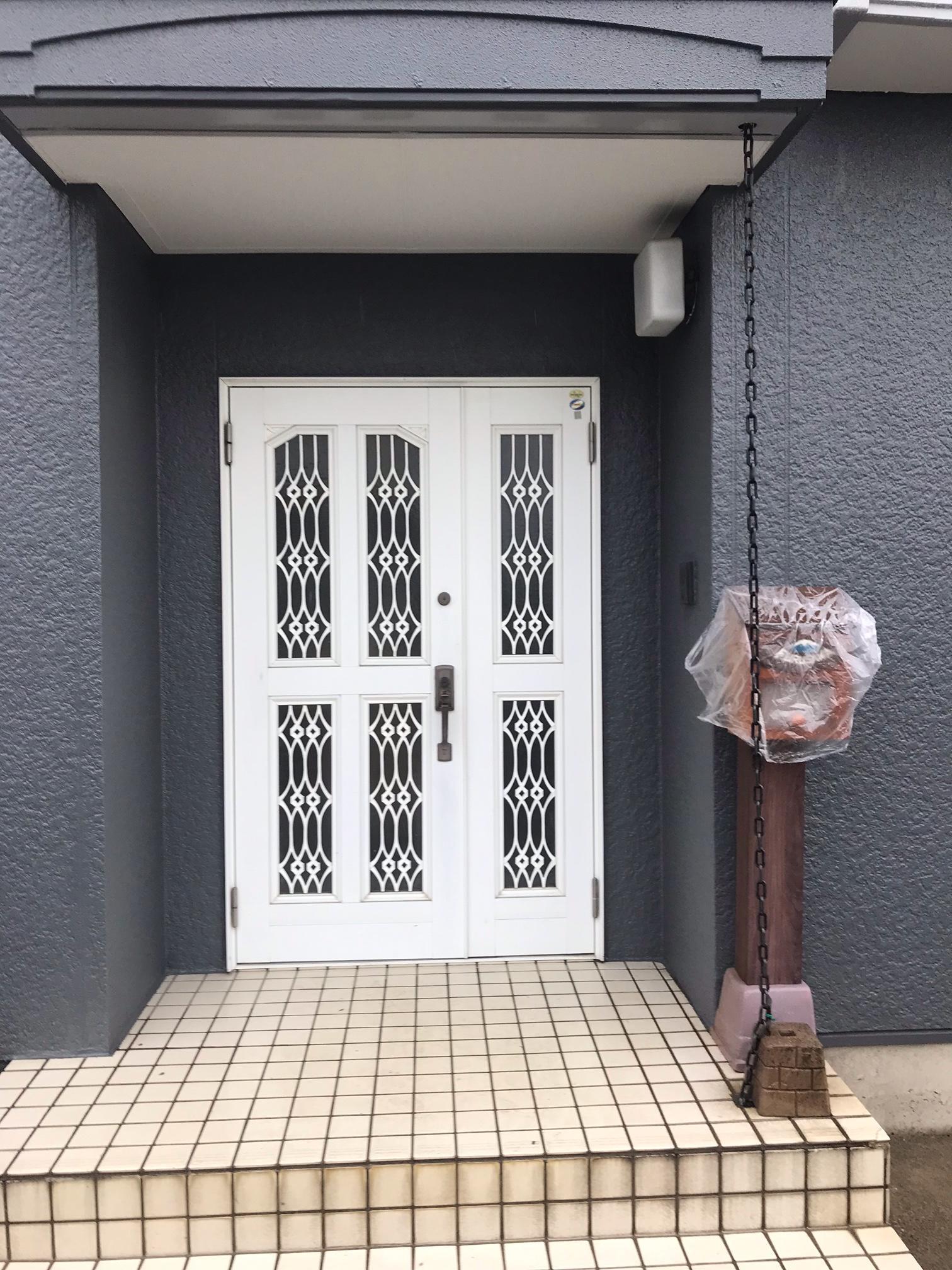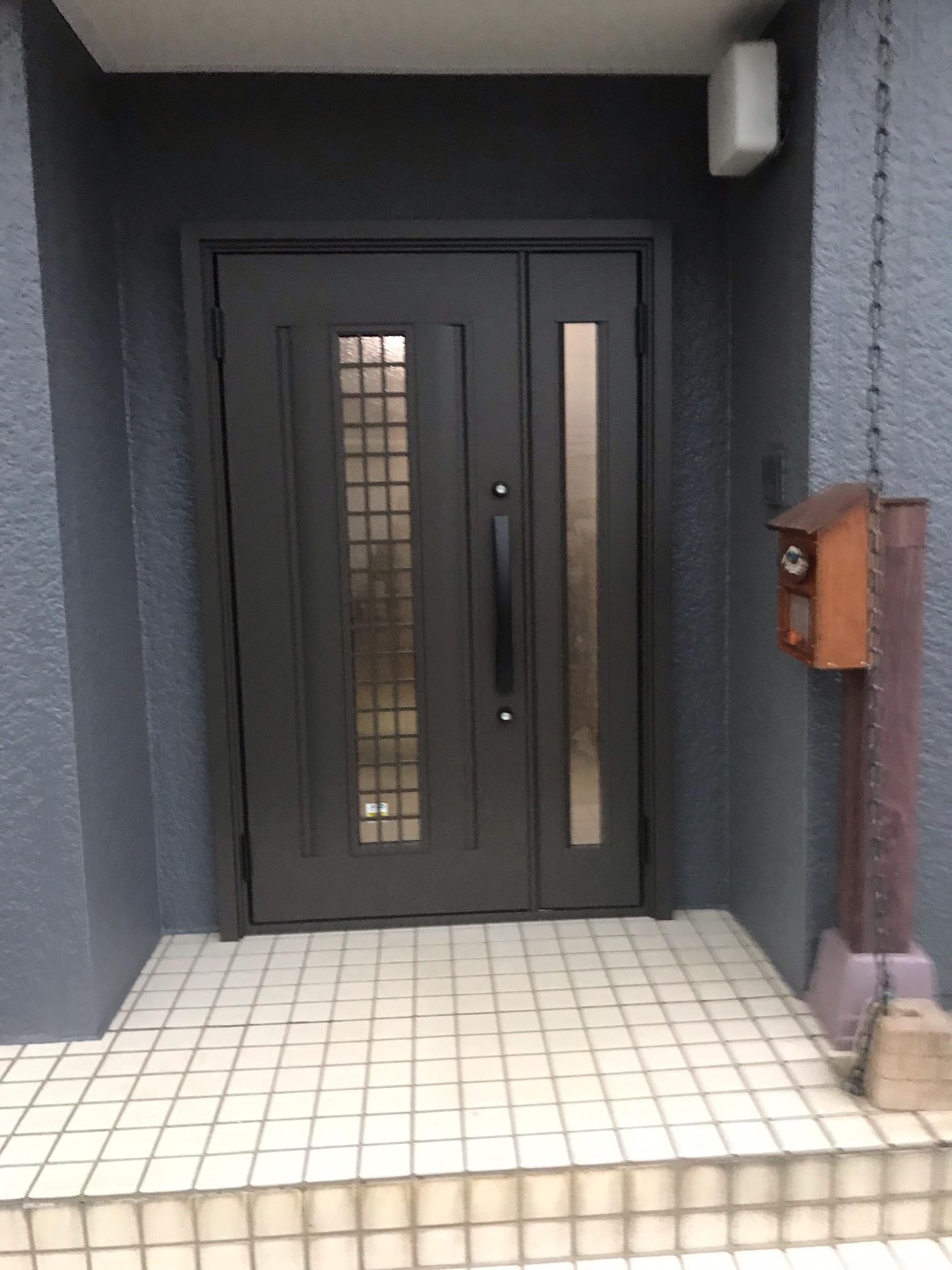 玄関のドアクローザーが壊れてしまったことがきっかけで玄関ドアを交換した築30年のお宅です。以前は白いドアでかわいらしいイメージでしたが、新しい玄関ドアは白とは対照的な「マッドブラック」をお選びいただき攻めた玄関にイメチェンしました。外壁のブルーグレーのお色ともお似合いの仕上がりです。