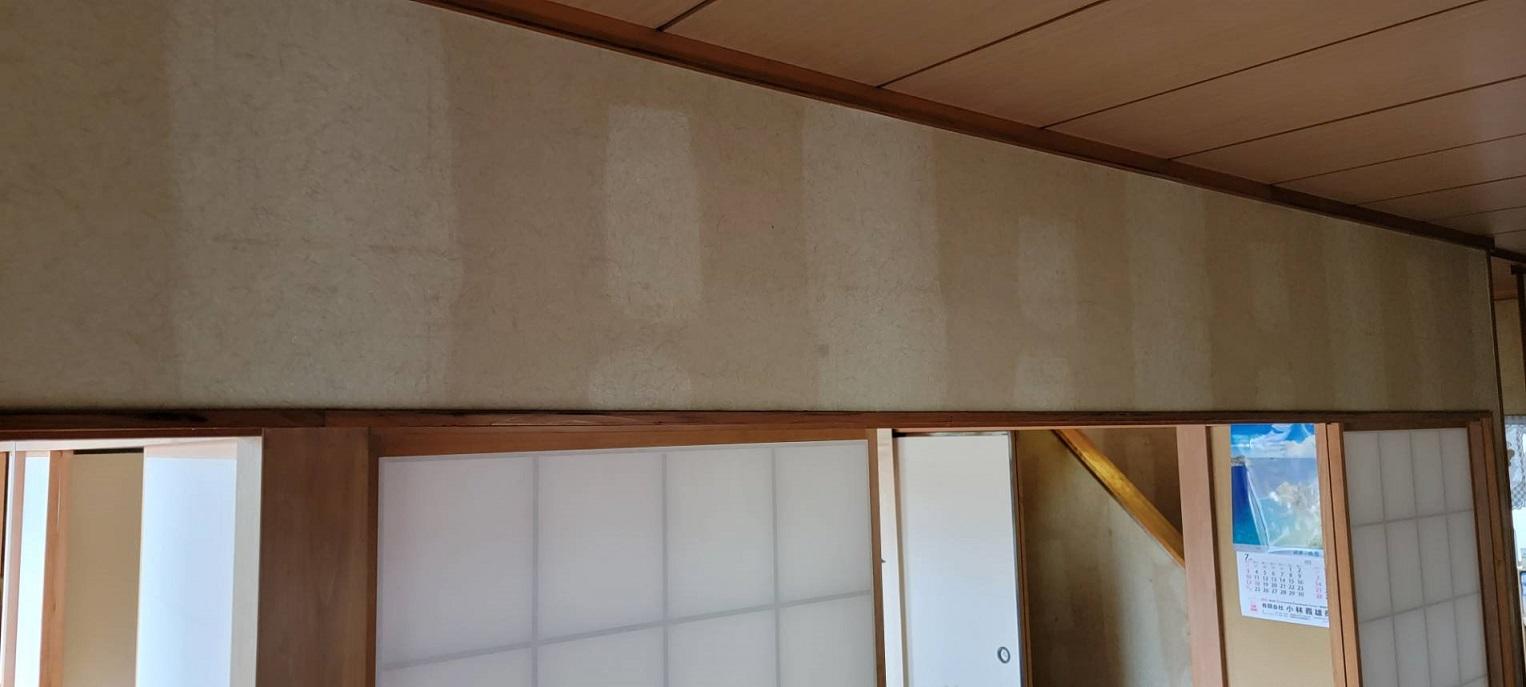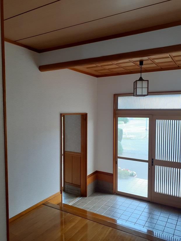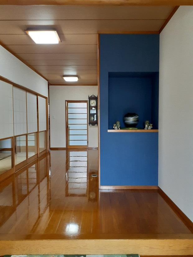 築30年のお宅のクロス貼替工事です。薄い和紙の壁紙が貼ってあったのですが、経年劣化で壁の下地が黒く出てきてしまい貼替えのご依頼をいただきました。玄関は金色が入った和文様のクロスを使用し、飾り棚は紺色のアクセントカラーで和モダンな玄関を演出しました。ベースには真っ白な漆喰柄を使用したので、今まで暗かった中廊下と階段がパッと明るくなりお施主様にとても喜んでいただけました。真っ白のクロスは反射して明るくなるのでお家の中の暗い場所にオススメです。