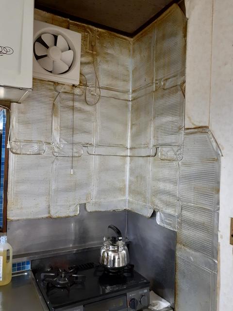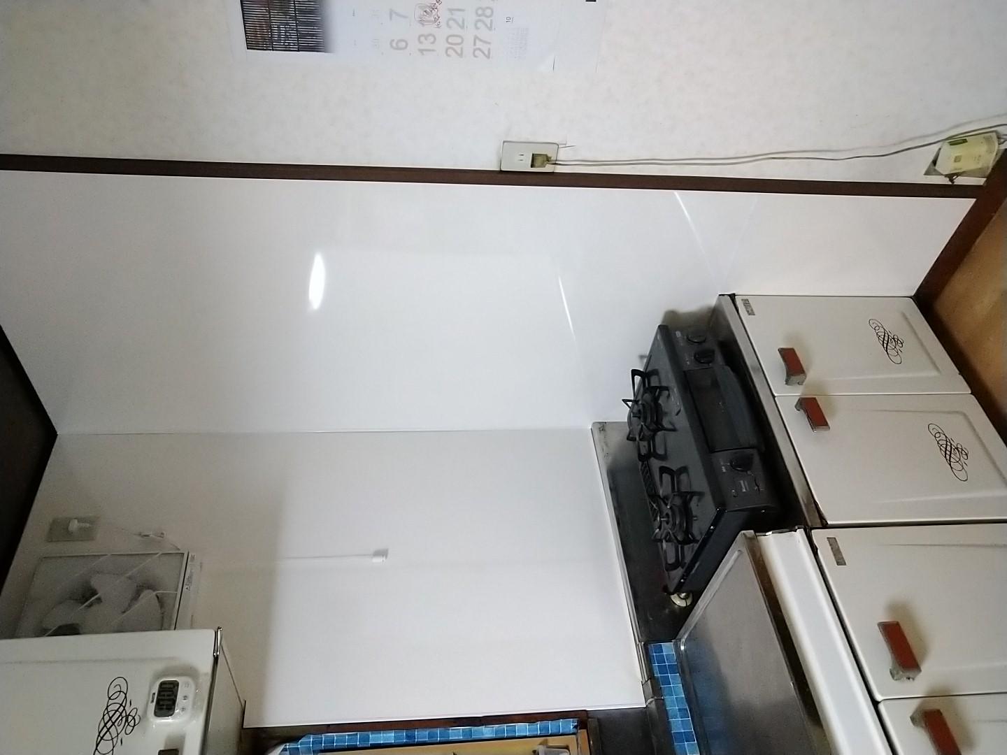 ずっとお悩みだった換気扇まわりの壁です。今まではお施主様がご自分で何枚もアルミのカバーを貼って油汚れと闘っていましたが、お手入れ簡単なキッチンパネルを貼ることで長年のお悩みが解消されました。キッチンパネルは拭くだけで汚れが落とせるので本当にお手入れがらくです。換気扇も新しくしたのでいっぺんに油汚れとさよならできました。