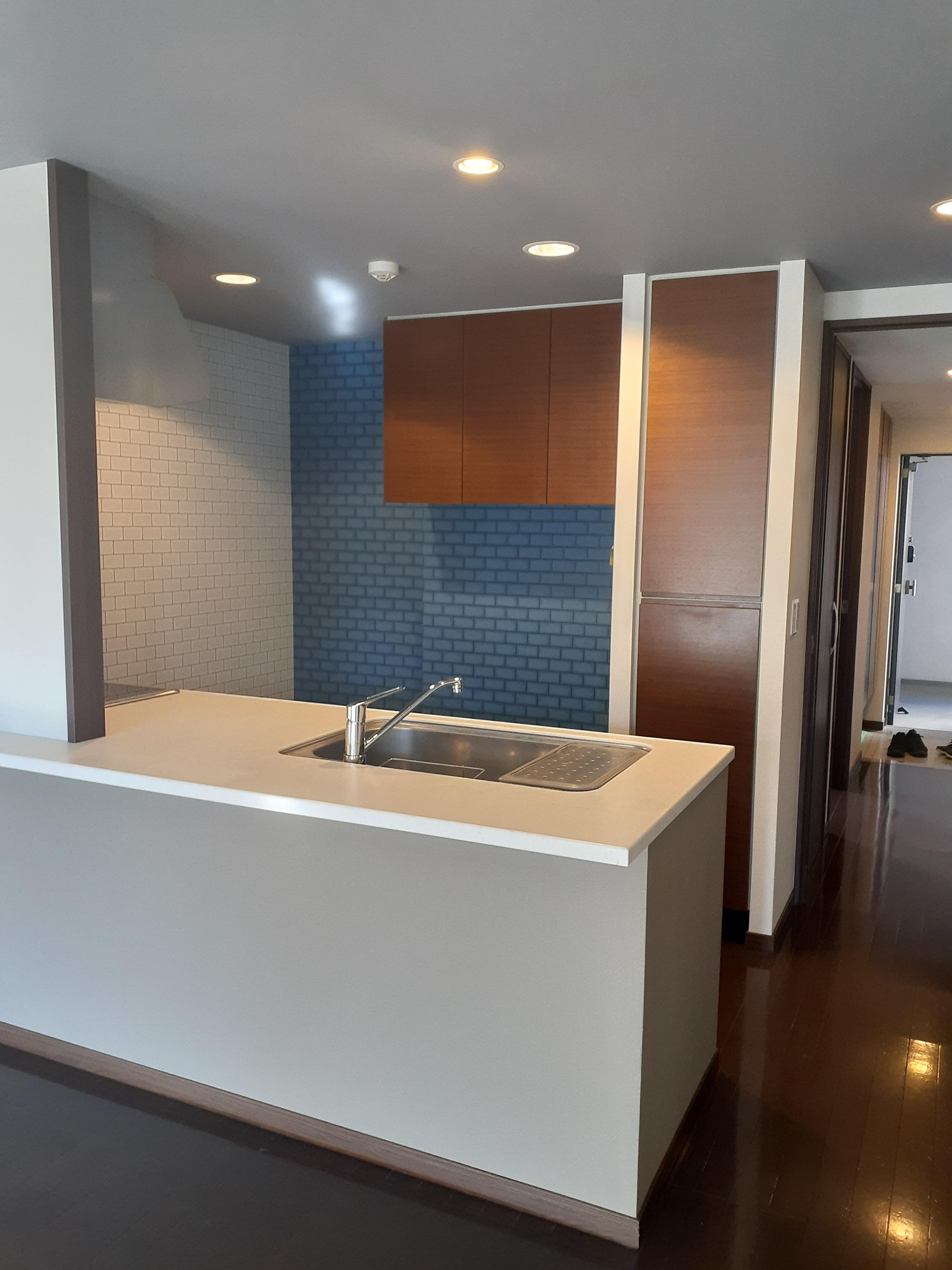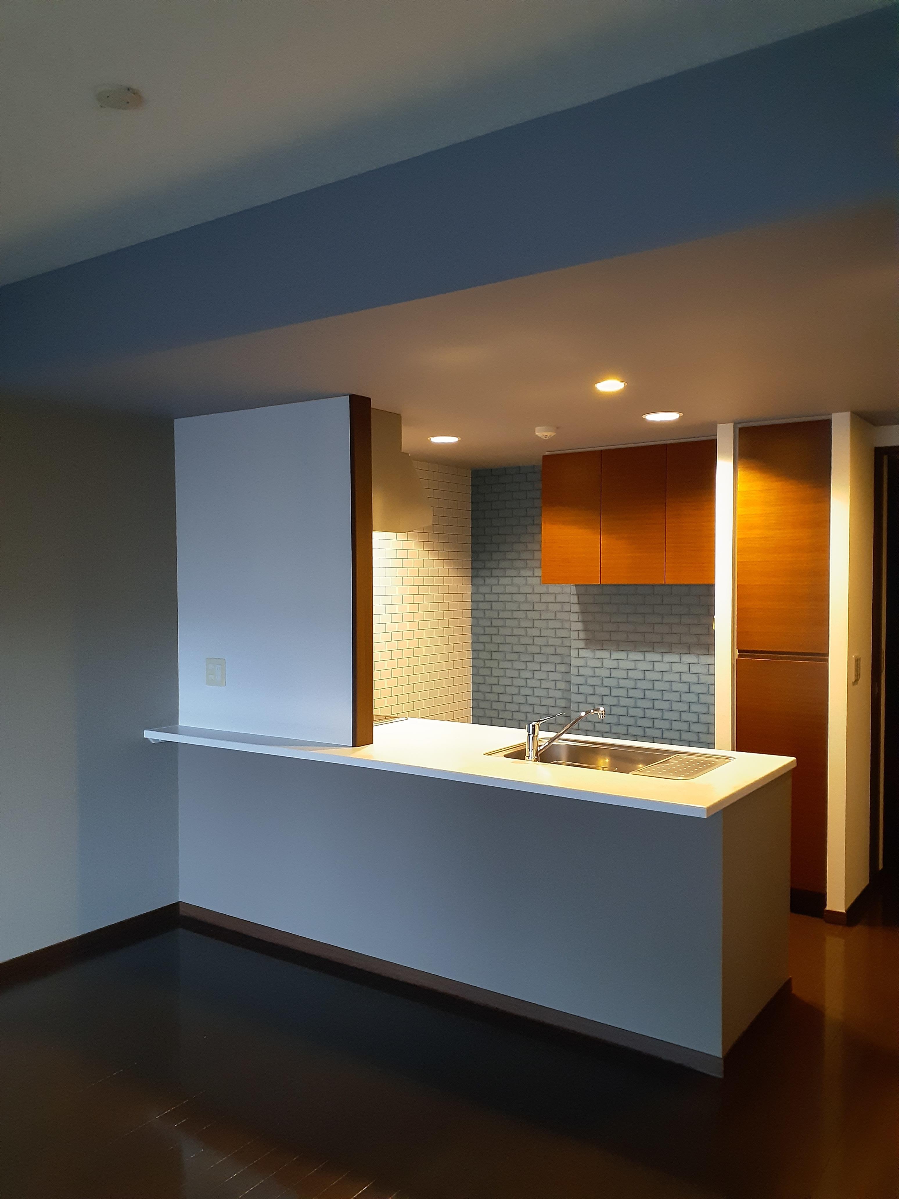 築14年のマンションの内装改修工事です。全室の壁、天井のクロスを貼替えて、防音断熱効果のある内窓のインプラスを設置しました。また、リビングから続きの和室は洋室にリフォームしリビングがより一層広くなり開放感ができました。キッチンとリビングの壁紙にはこだわりたいとのお施主様のご要望があり、カウンターとリビングの一面にはフローリングのお色と繋がるブラウン系のアクセントカラーを使用し、キッチン背面にはお施主様のお好きなお色のブルーを使用、側面はお色違いの白で背面が引き立つおしゃれな仕上がりになりました。また、キッチンの天井のみブルーグレーで壁とのトーンをそろえてリビングへグラデーションで繋がるようコーディネートしました。お施主様からは「モデルルームになったみたい!大満足の仕上がりです!」とのお言葉をいただき嬉しいかぎりです。