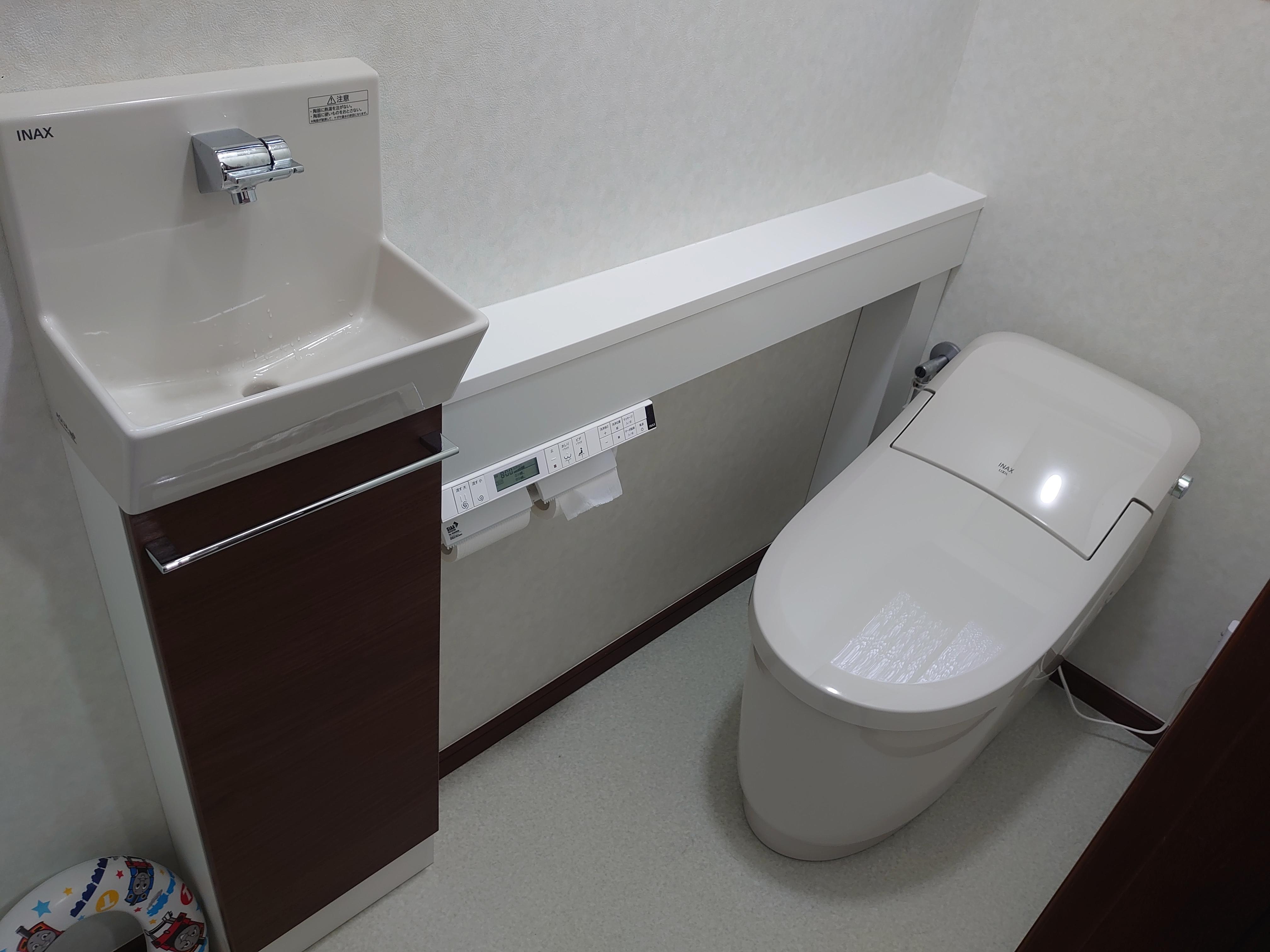 手洗付タンクのトイレから手洗カウンター付トイレにリフォームしました。LIXILのプレアスLSタイプ手洗カウンター付は給排水の増設や大がかりな床・壁工事の必要がなく 簡単施工でトイレと手洗のリフォームが可能です。タンクレストイレのような見た目とお掃除ラクラクな手洗ボウル、コンパクトでもしっかり収納のキャビネットと、使いやすくオシャレで洗練されたトイレ空間に大変身しました。