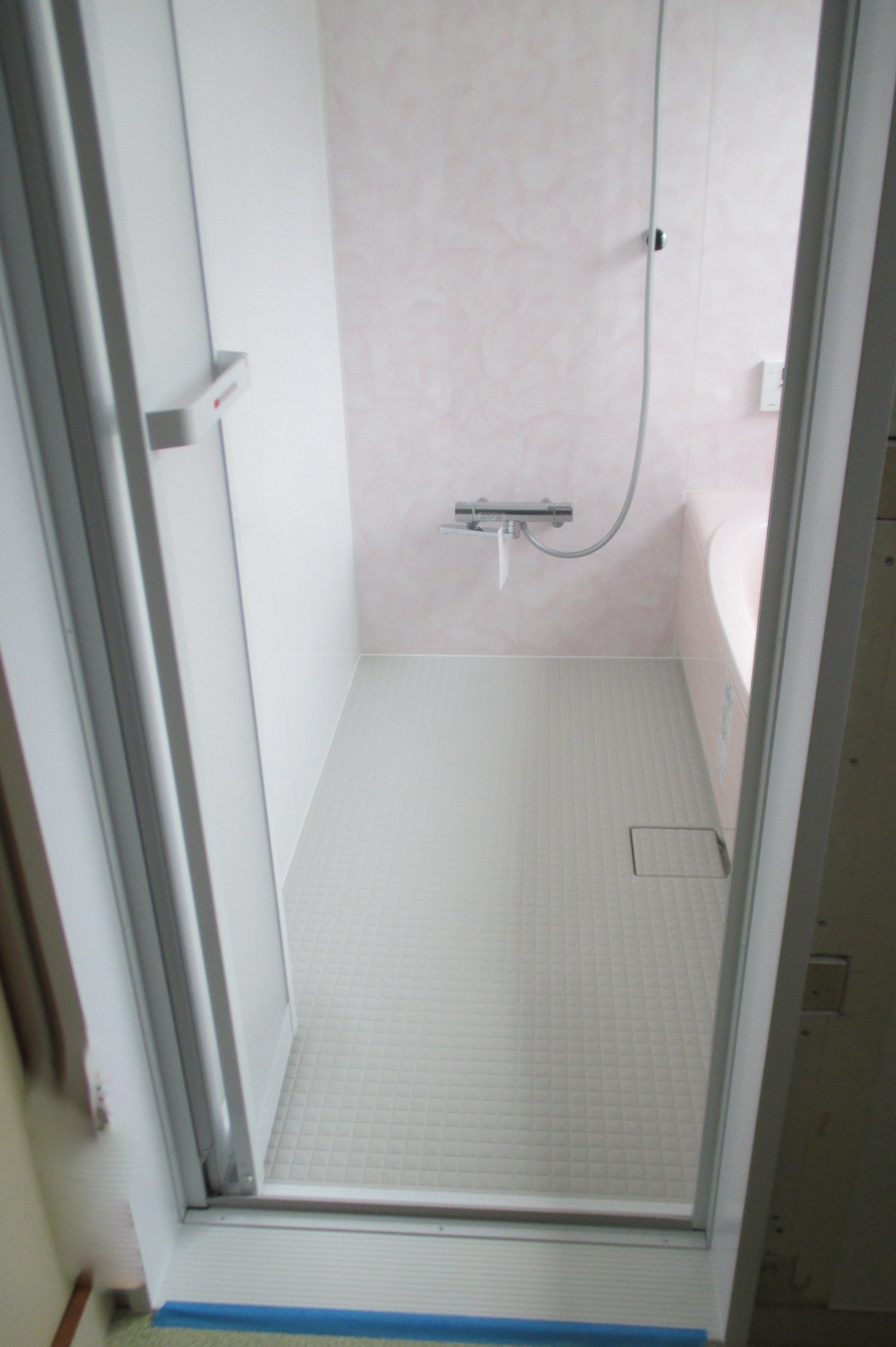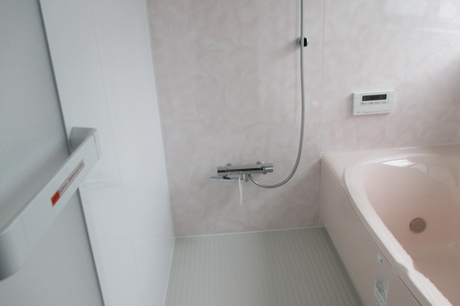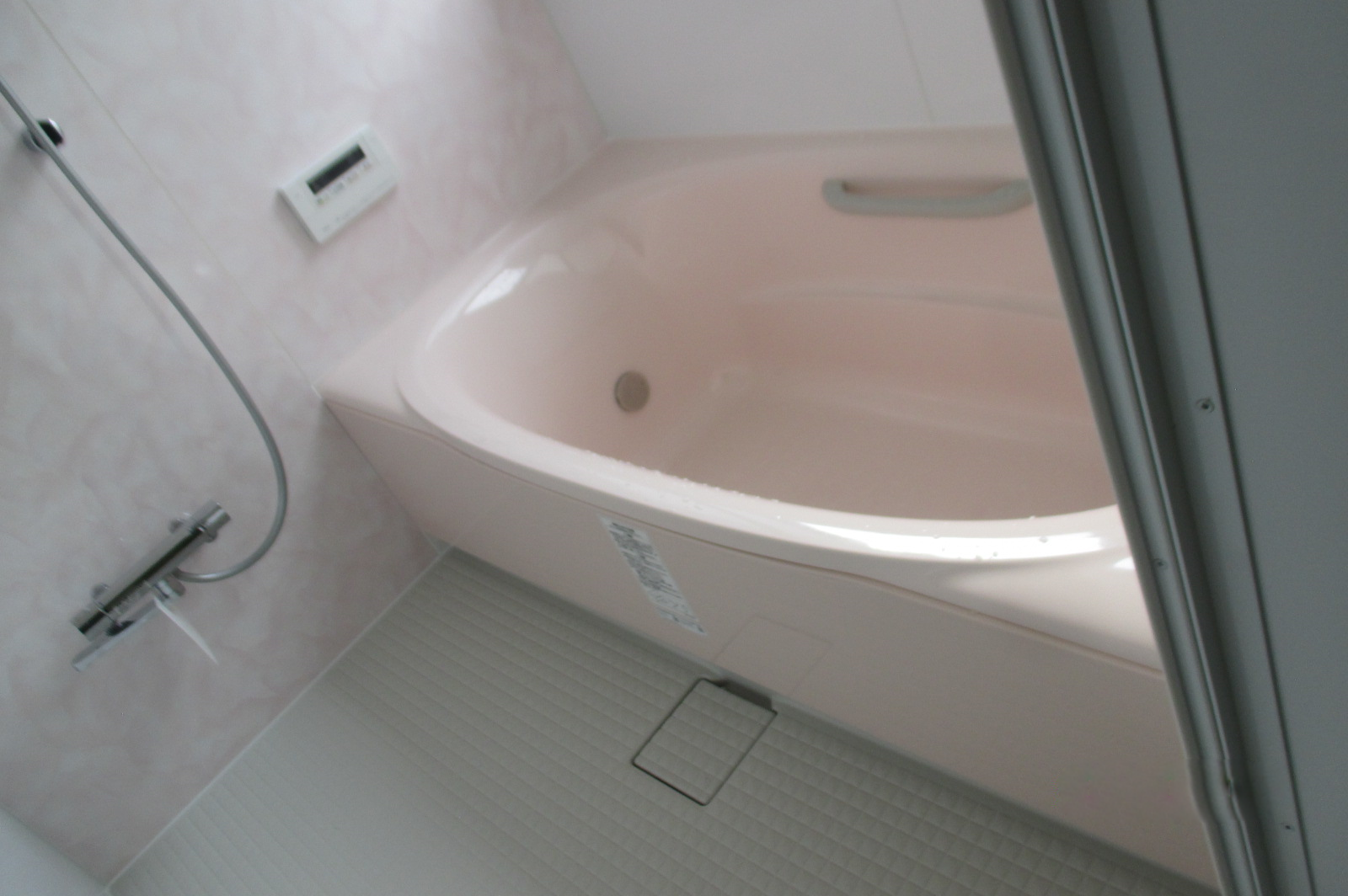 モノトーンの渋い浴室から淡いピンクのかわいらしい浴室にリフォームしました。かわいらしい見た目ですが、鏡やカウンターなどは付けない男前な浴室です。シンプルですが壁パネルには鏡面ホワイトをお選びになり控え目だけど豪華な仕上がりになりました。余計なものがないのでお掃除もしやすくシンプルイズベストな浴室です。他にもトイレの交換をしたので水廻りが一新しました。
