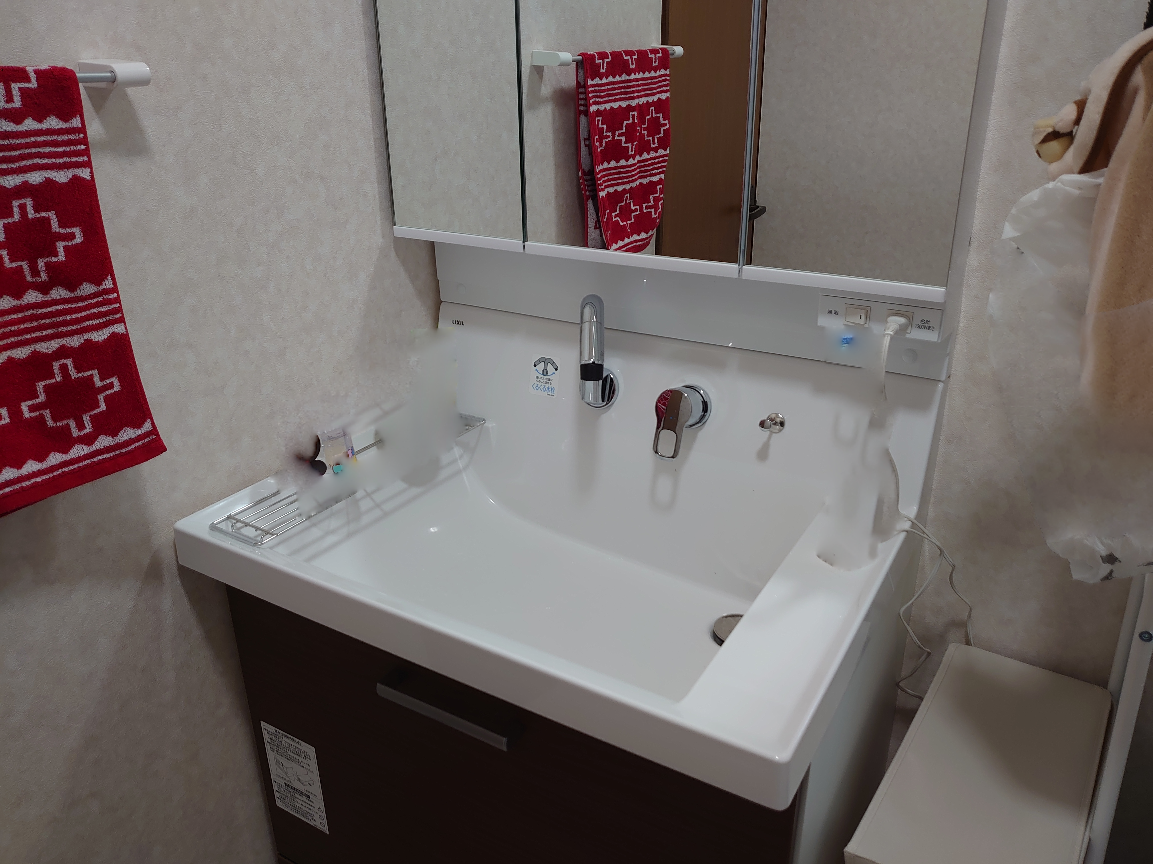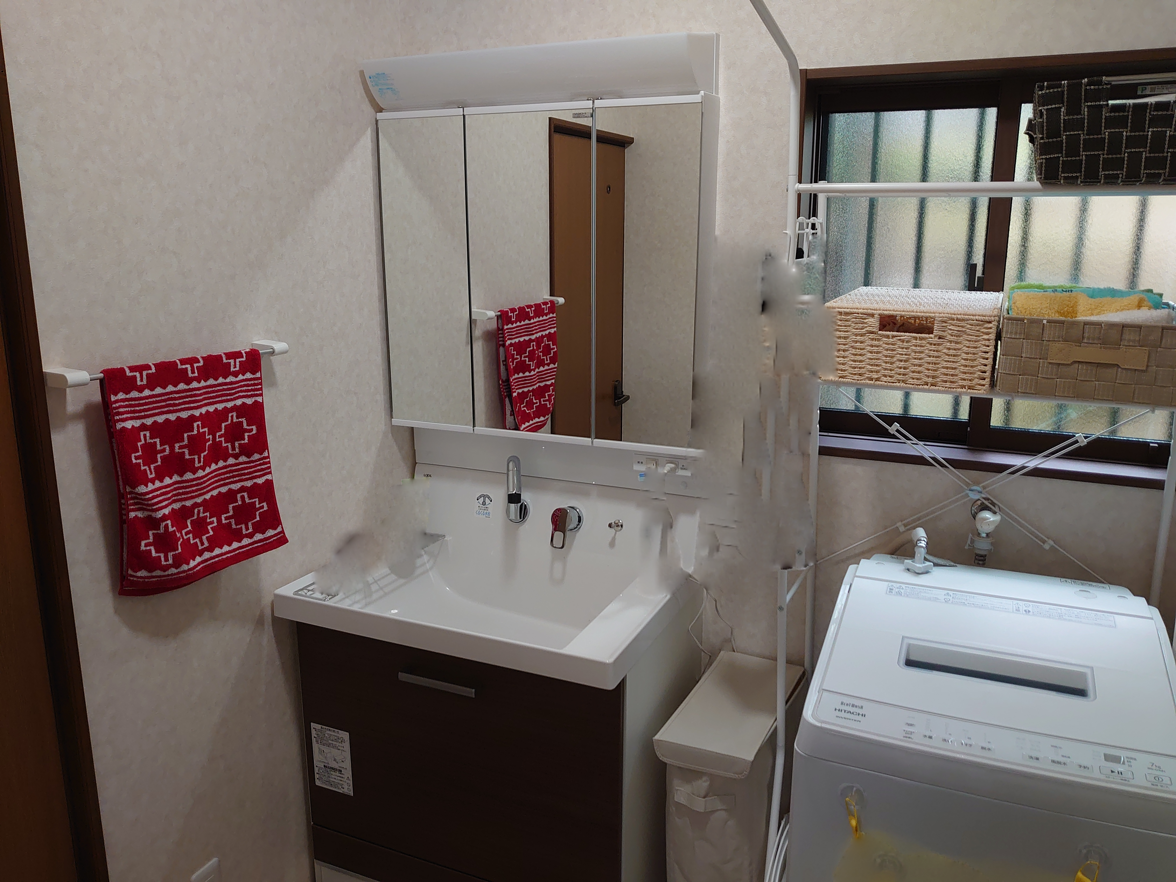 洗面室まるごとリフォームです。洗面室の壁、床、天井を張替えて、洗面化粧台を交換しました。洗面化粧台はLIXILのピアラを採用。ピアラは底が広く大容量の「ひろびろボウル」なので、バケツを入れても深さがあり作業しやすく、使いたい位置にくるりと回せる「くるくる水栓」も便利です。また、三面鏡を開くと入れるものの高さに合わせて位置を変えられるトレイと、ドライヤーもすっきり収納できる扉裏ポケットも付いています。LEDライトが鏡を明るく照らしてくれるので、メイクをするのも楽しく美人度がアップします。
