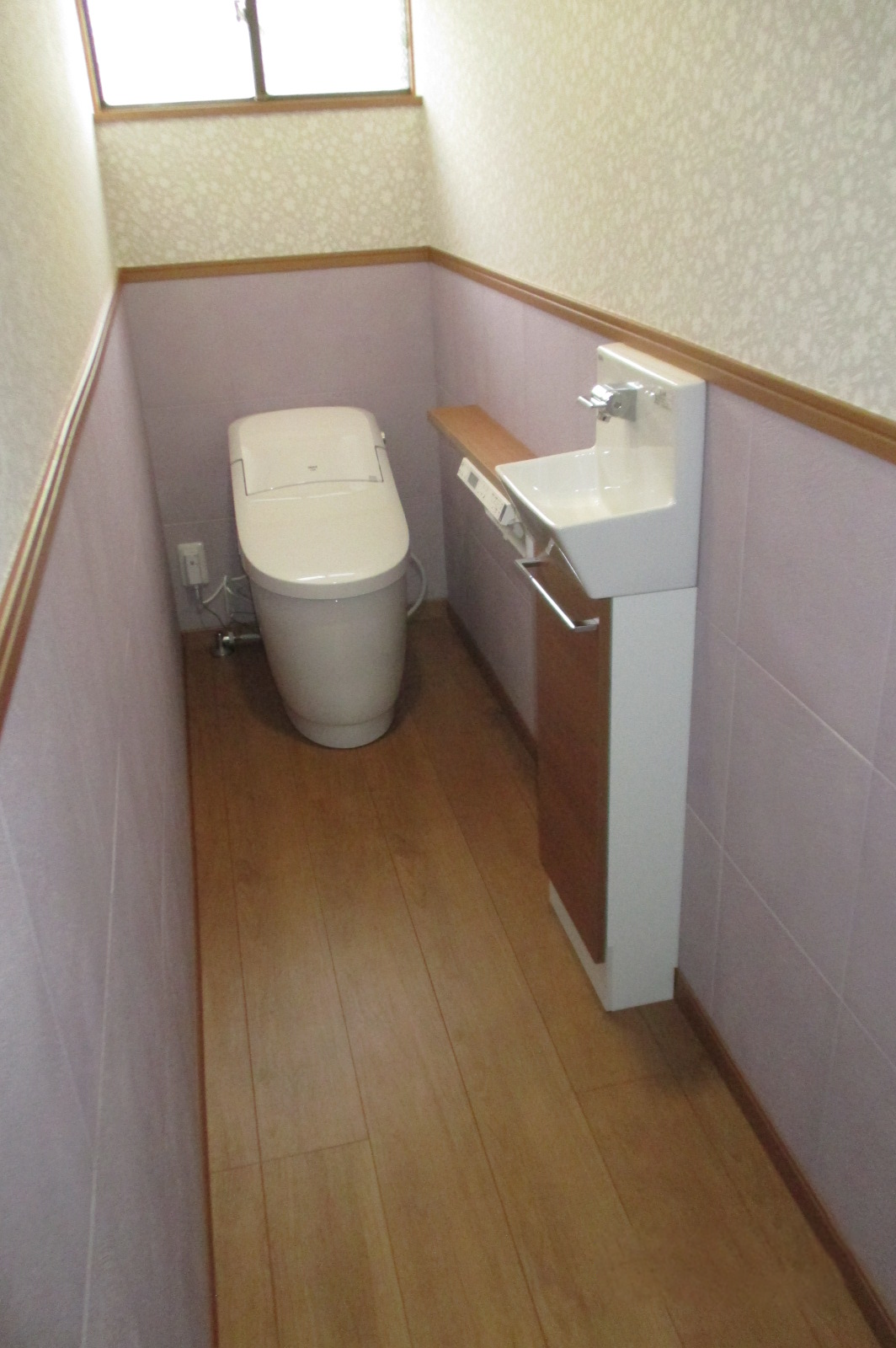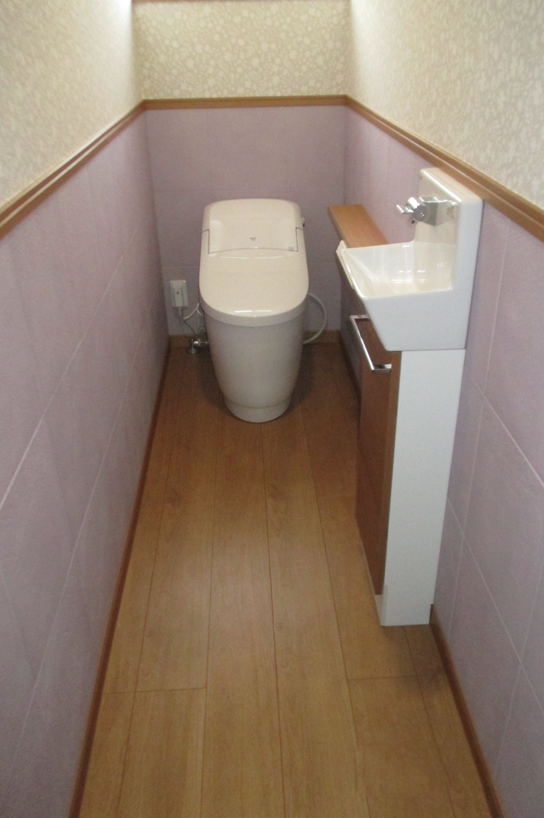 築40年のお宅のトイレリフォームです。以前は手洗い場とトイレがドアで仕切られていましたが、手洗い場とトイレを1つの空間に仕上げました。トイレは手洗カウンター付のLIXILプレアスを採用。給排水の増設工事なしでトイレと手洗のリフォームができるので人気の商品です。また、今までタイル張りだった腰壁にはLIXILのエコカラットを貼り湿気と臭い対策をしました。お掃除もしやく機能性も充実しているけど、無駄なものがなくスッキリとコンパクトにまとめたトイレ空間の完成です。