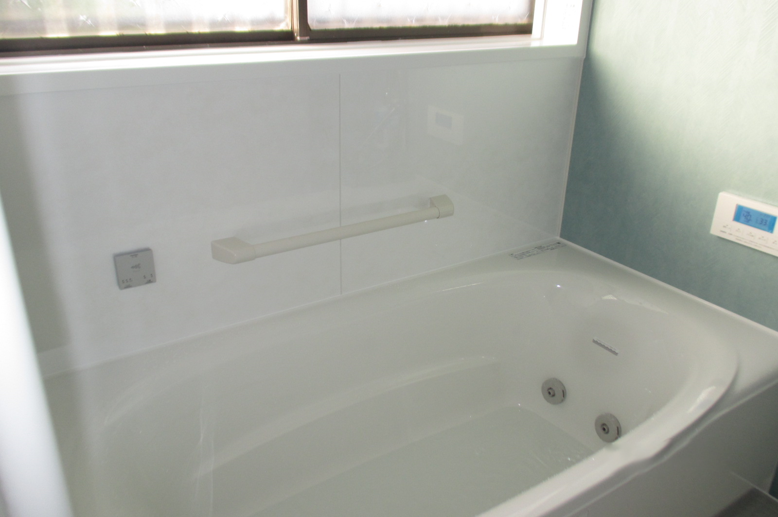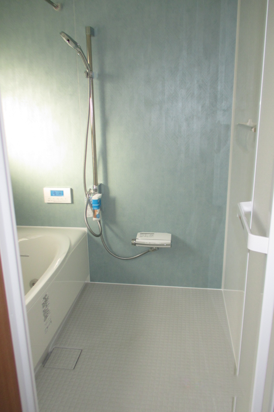 今流行りの鏡なし、棚なし、カウンターなしのお風呂です。ウロコ汚れになりやすい鏡、とても大変なカウンター裏の掃除の必要がなく、お手入れがラクラクです。また、壁パネルも明るめの薄いお色を選ばれたのでカルキ汚れも目立ちません。余計なものを潔く省いたのでシンプルでキレイが長続きするお風呂に仕上がりました。
