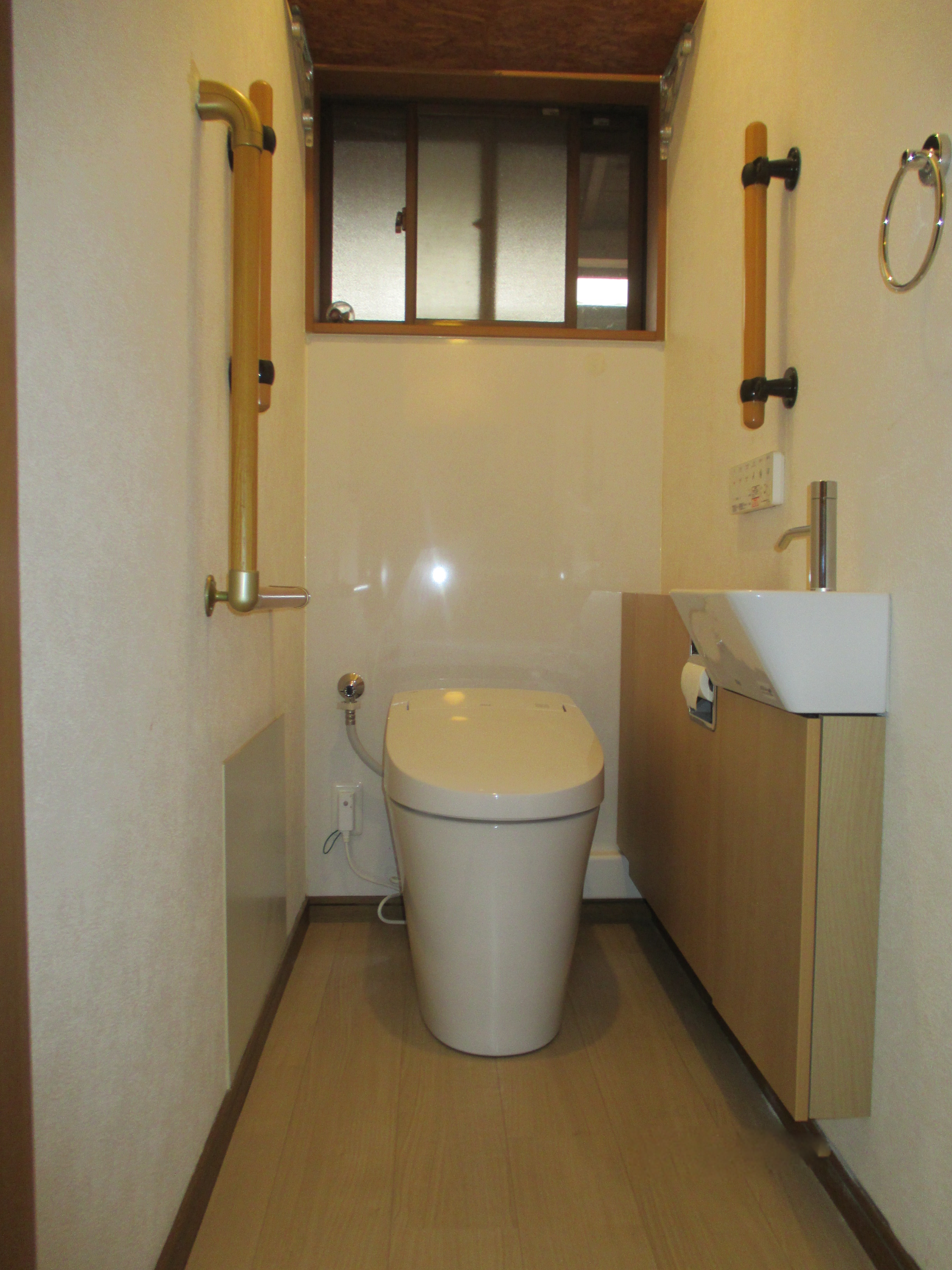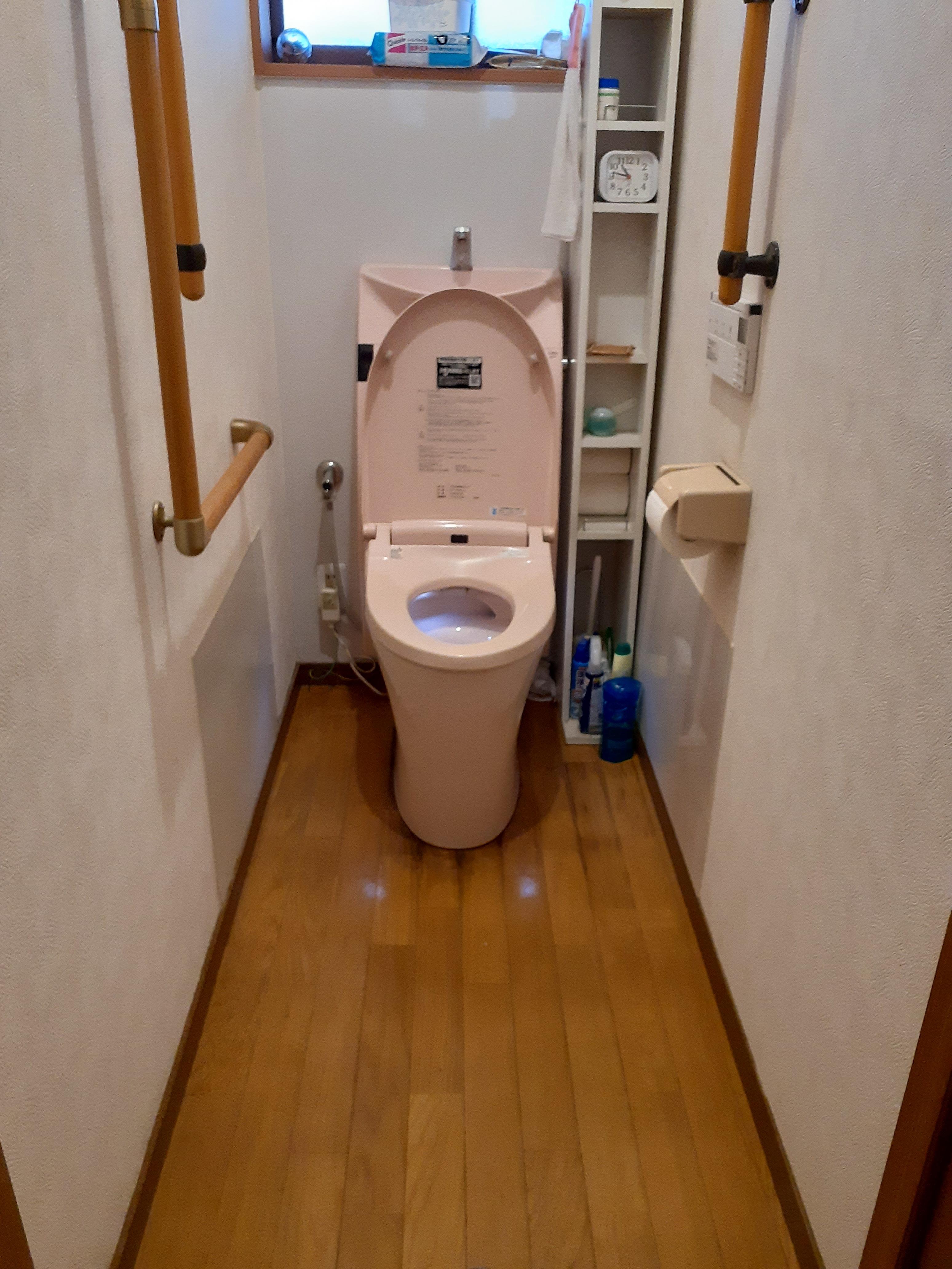 ご使用から10年の「お知らせ」ランプが点灯したのと、シャワートイレからの水漏れをきっかけに手洗い器付のタンクレストイレに交換しました。スリムデザインの手洗い器カウンターで動作スペースはゆったりしているので、以前のように振り返って手を洗わずにすみスムーズな動線ができました。また、水漏れで傷んでしまった床もフローリング調のクッションフロアを上張りし、優しい色味のワントーンの空間に仕上がりました。お施主様からも「トイレだけ新築になったみたいで嬉しい」と喜んでいただけました。