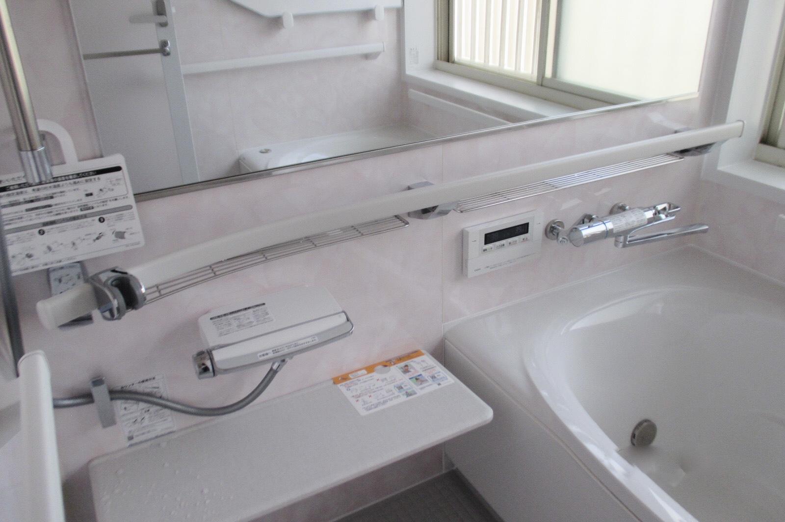 大人気の浴室、LIXILリデアBタイプの1坪サイズです。 淡いピンクの壁パネルは奥様がお選びに なりました。 手すりもつき、ドアの段差も低くなりましたので、 体への負担も少なく、安心して入浴が出来ることと思います。