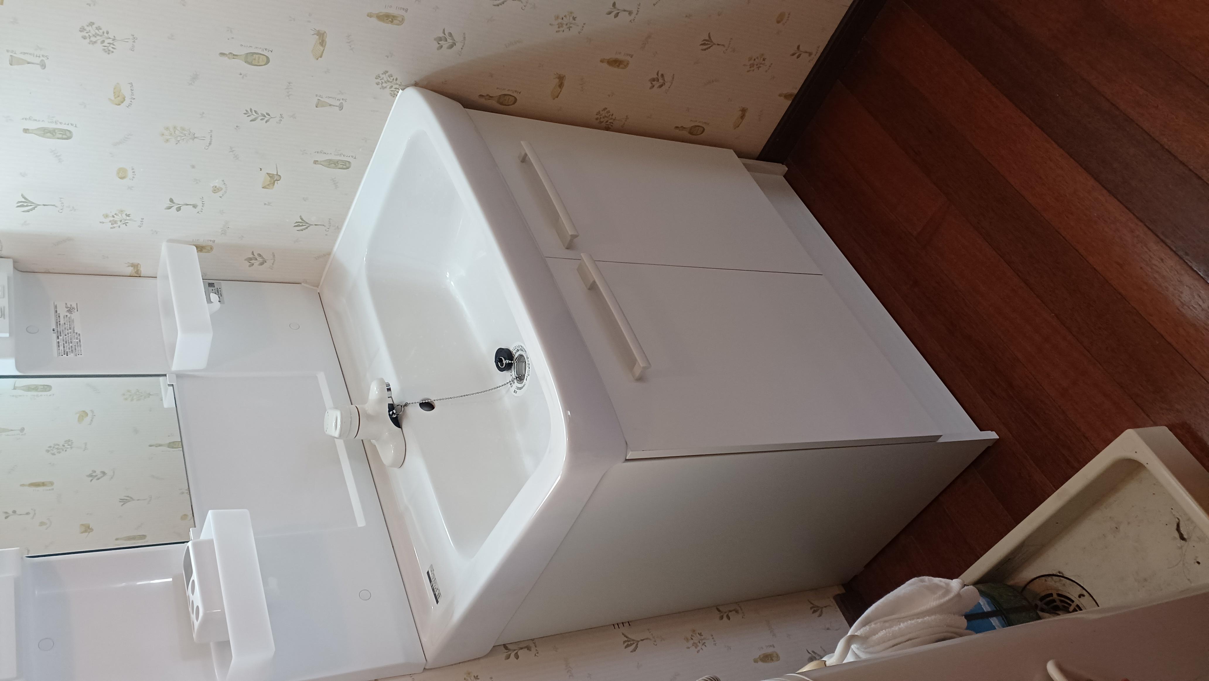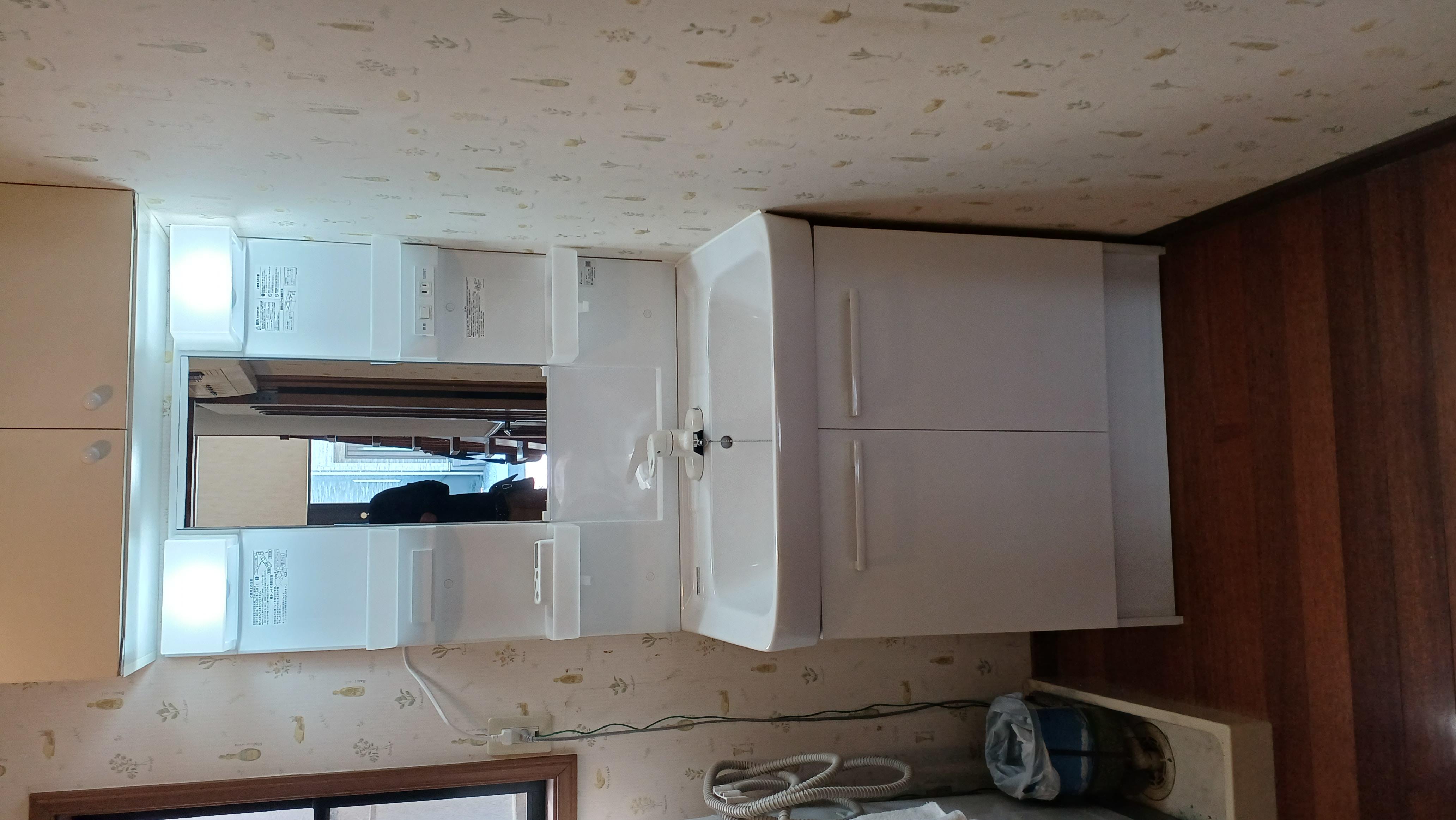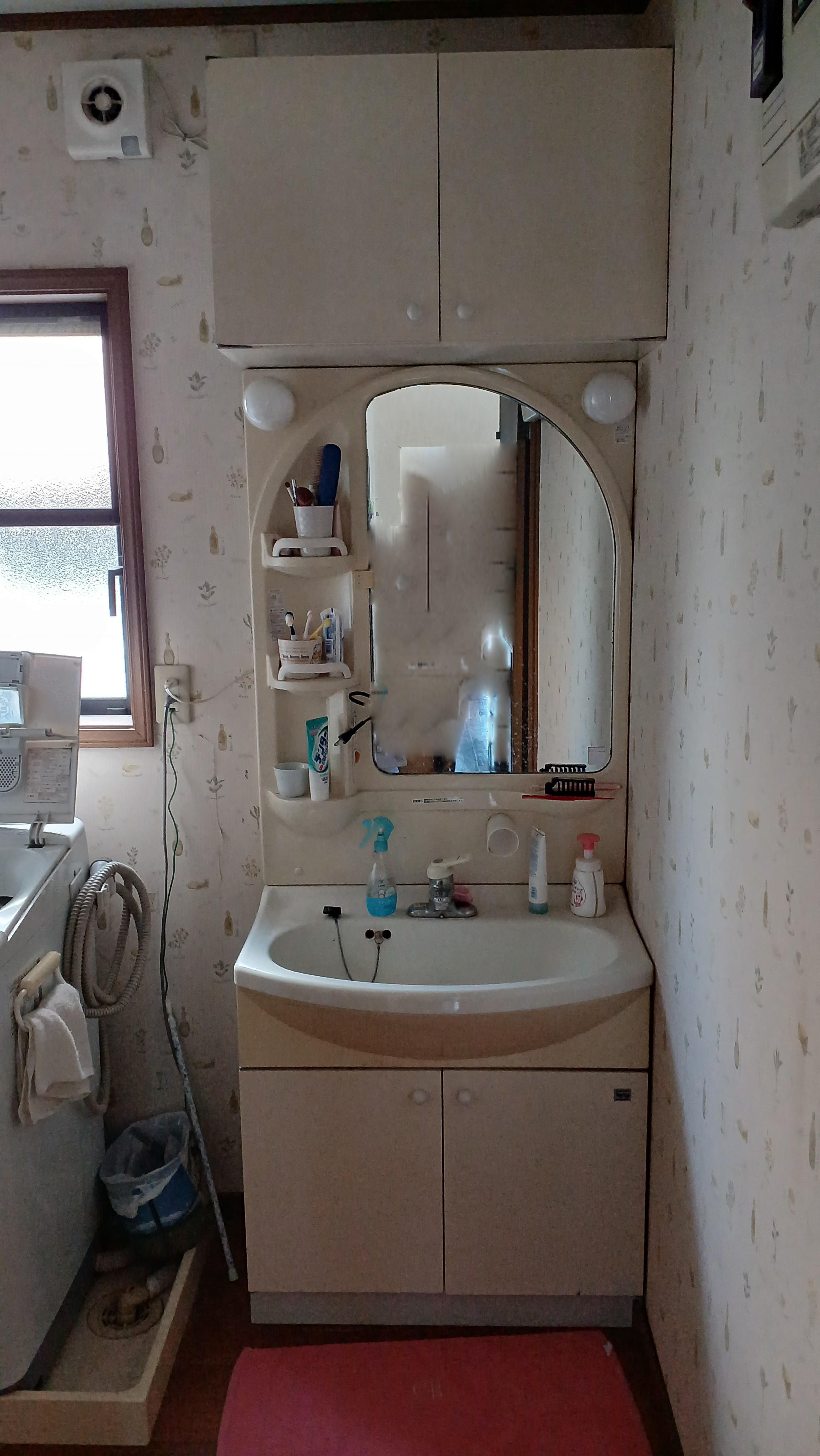 水の出が悪くなってしまった洗面化粧台ですが、長年お使いだったので給排水設備工事するにあたり、一緒に交換しました。LED照明が明るく、収納もたっぷりで「今まで入っていたものを収納してもまだ収納スペースがあいている」と、とても喜んでいただけました。あと数年でお年頃になるお嬢様がいらっしゃるので、あいている収納スペースはお嬢様専用のドライヤーやヘアアイロンなどの収納スペースになりそうです。