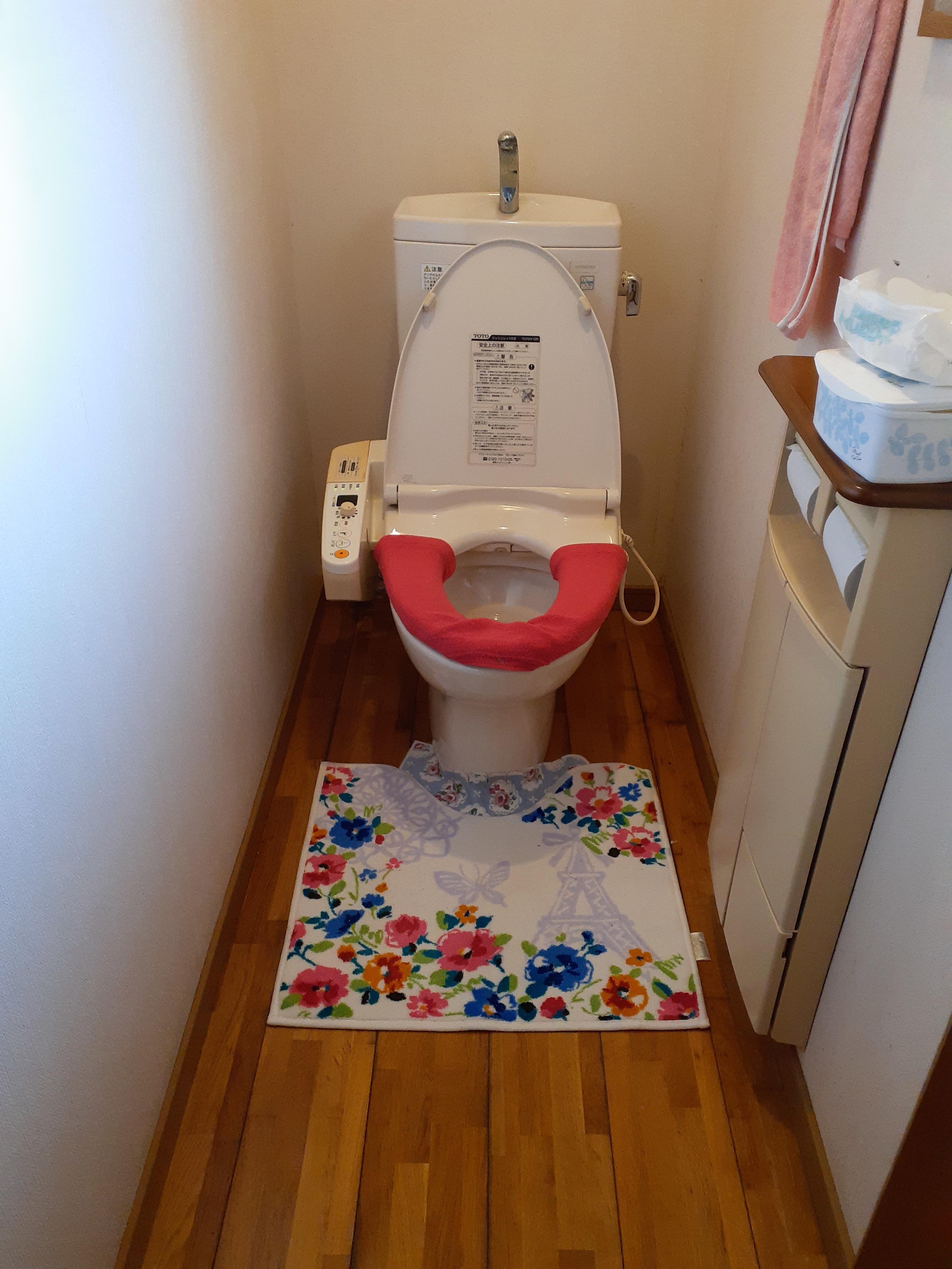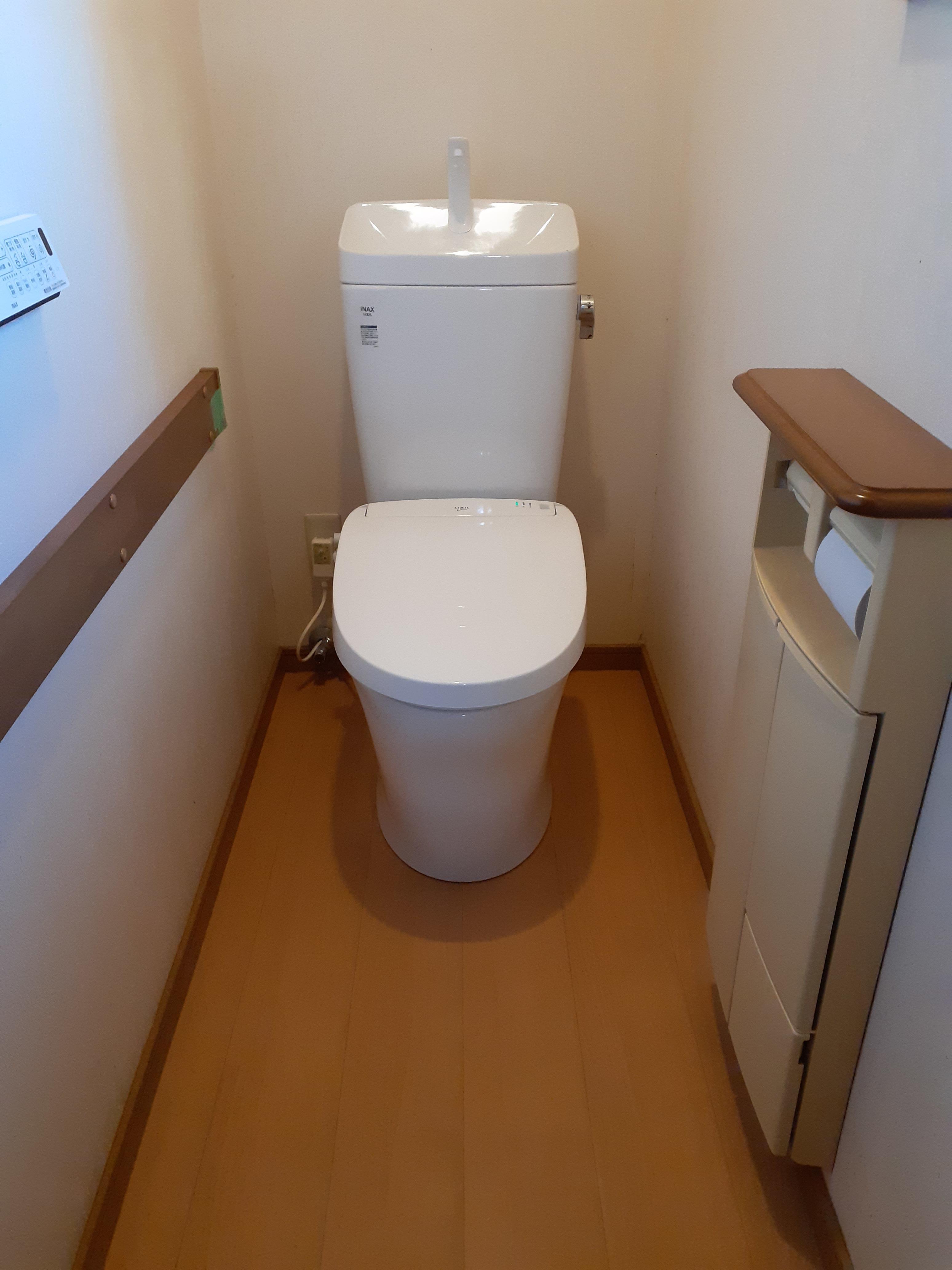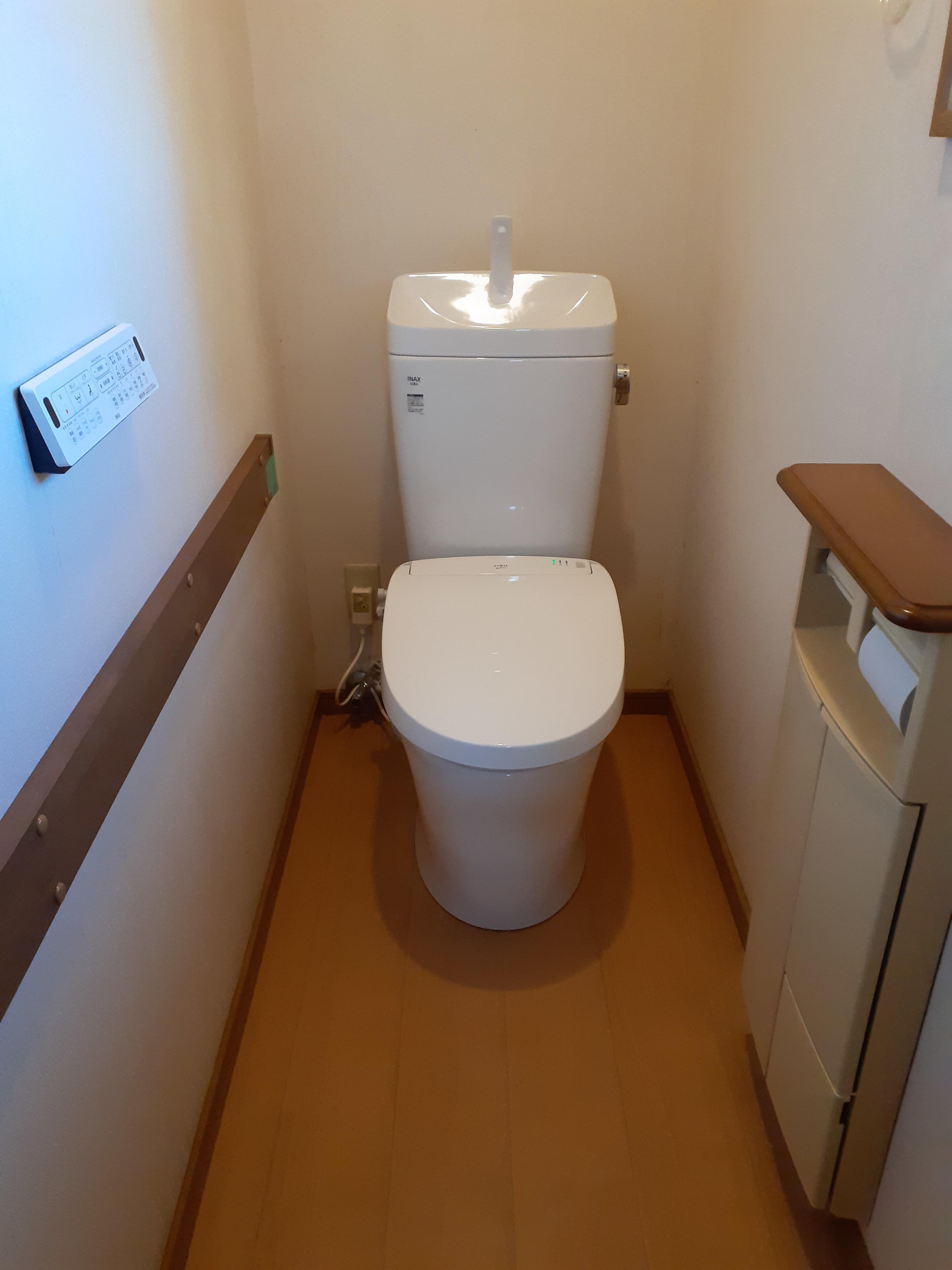 要介護のご主人のために、使いやすいトイレにリフォームしました。便器の洗浄、蓋の開け閉めもフルオートで、鉢内の脱臭除菌もおこないます。また、お掃除リフトアップ機能もついているので便座と便器の隙間もラクラクお掃除でき、清潔なトイレ空間が保てます。動作がゆっくりになってしまったご主人でも使いやすく安全なトイレに仕上がりました。