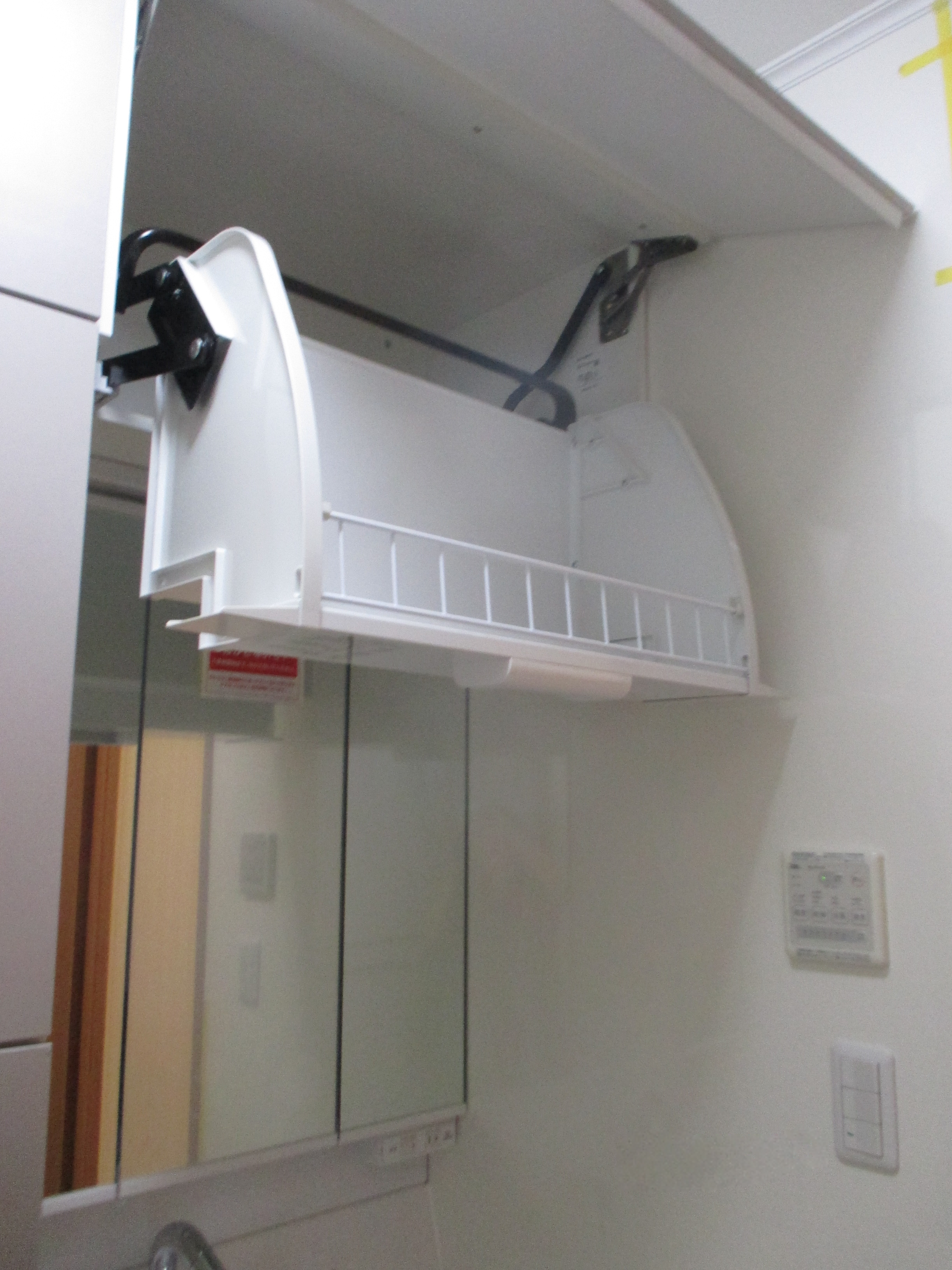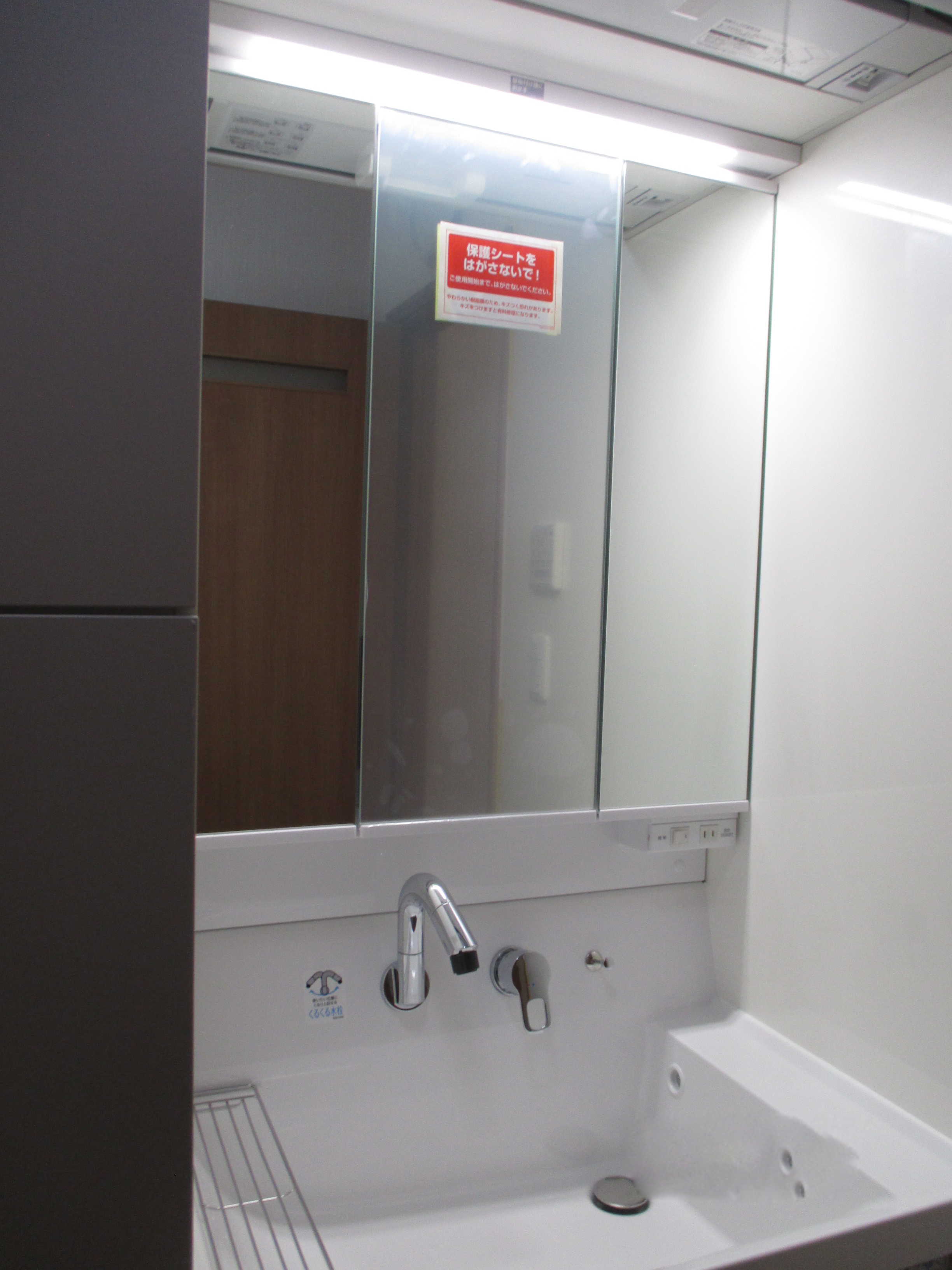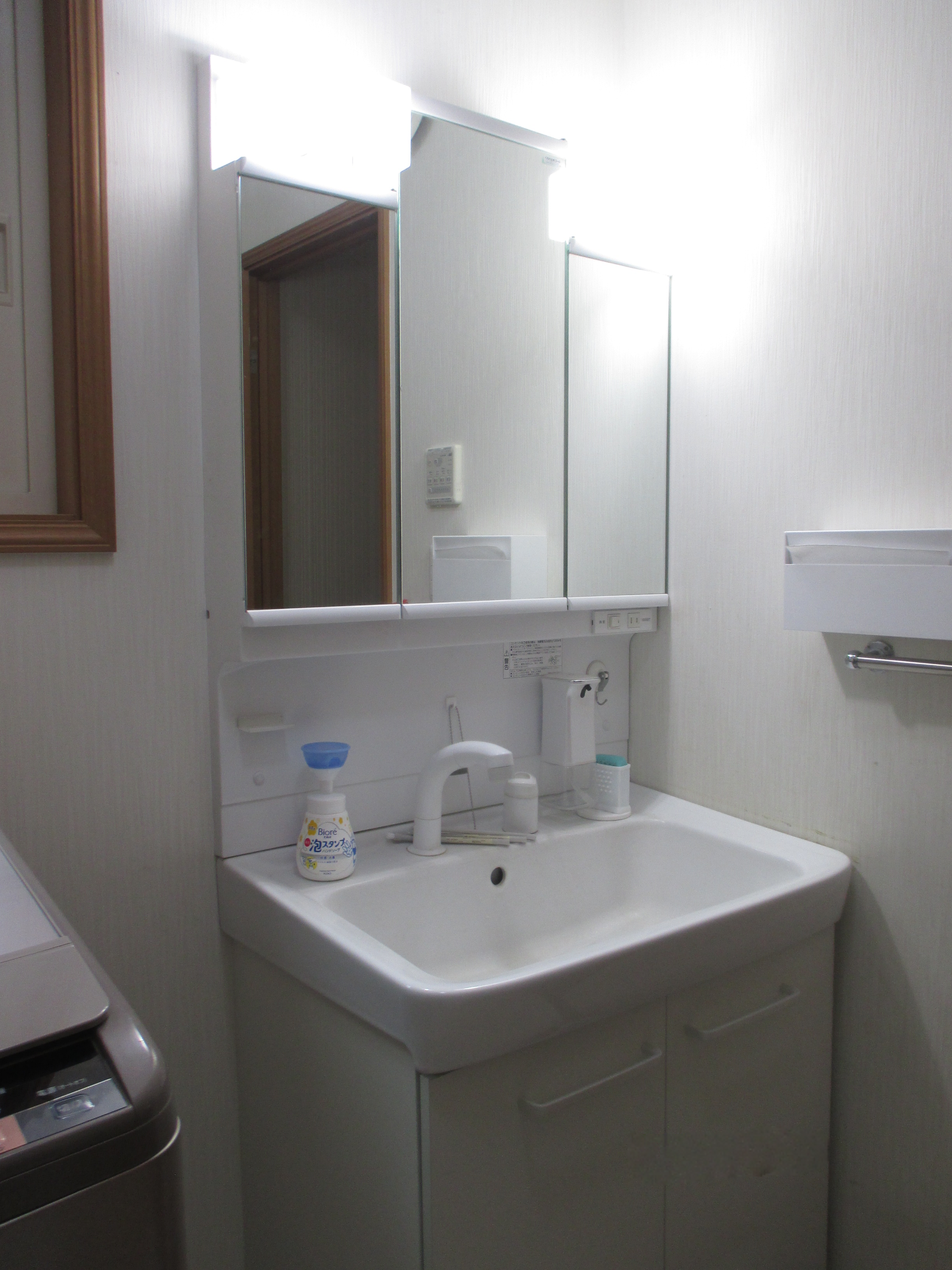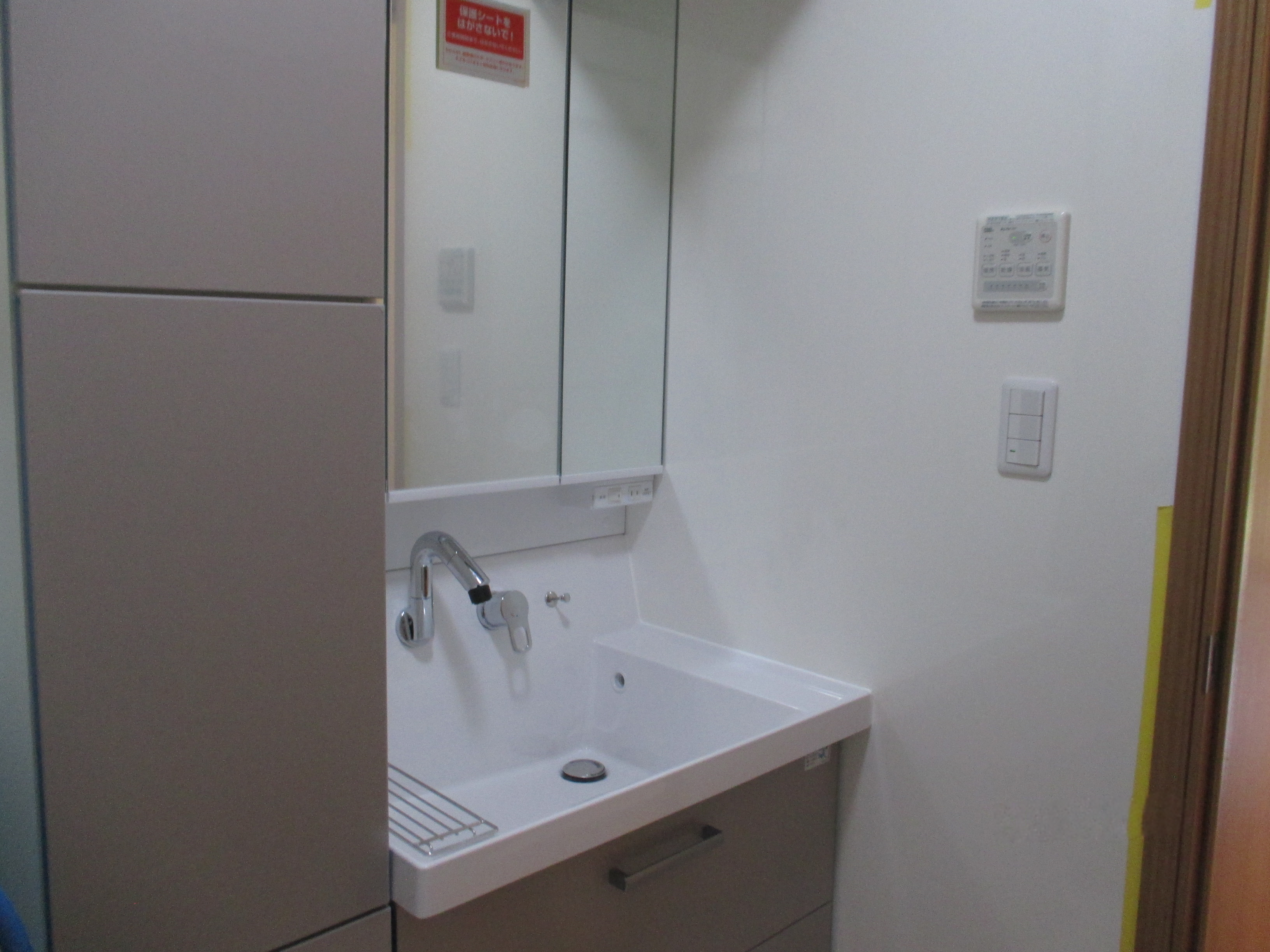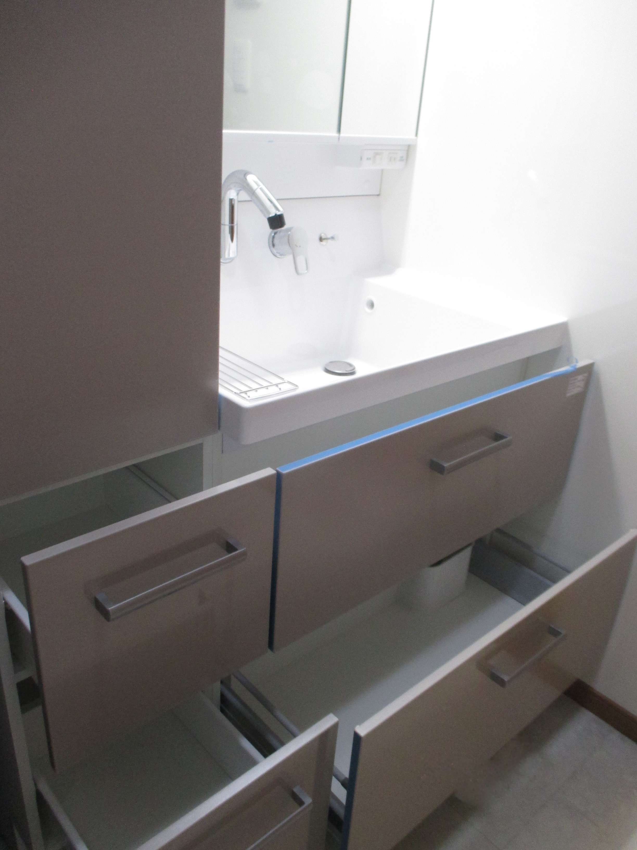 3人のお子様がいらっしゃるお施主様。お子様の成長とともに物も増えていくので収納たっぷりの洗面化粧台にリフォームしました。洗面化粧台はLIXILのピアラを採用。上下段とも奥までしっかり収納でき、ものの出し入れもラクラクのフルスライドタイプの引き出しと、ダウン機能付きのアッパーキャビネットで天井までのスペースも収納として有効活用できました。また、隣にはタオルやストック品の収納に便利なトールキャビネットも付けたのでスッキリとした見た目でも大容量の収納庫ができました。壁にはお施主様たってのご希望だったキッチンパネル貼りに仕上げ収まり良くお手入れがラクな洗面化粧室が完成しました。
