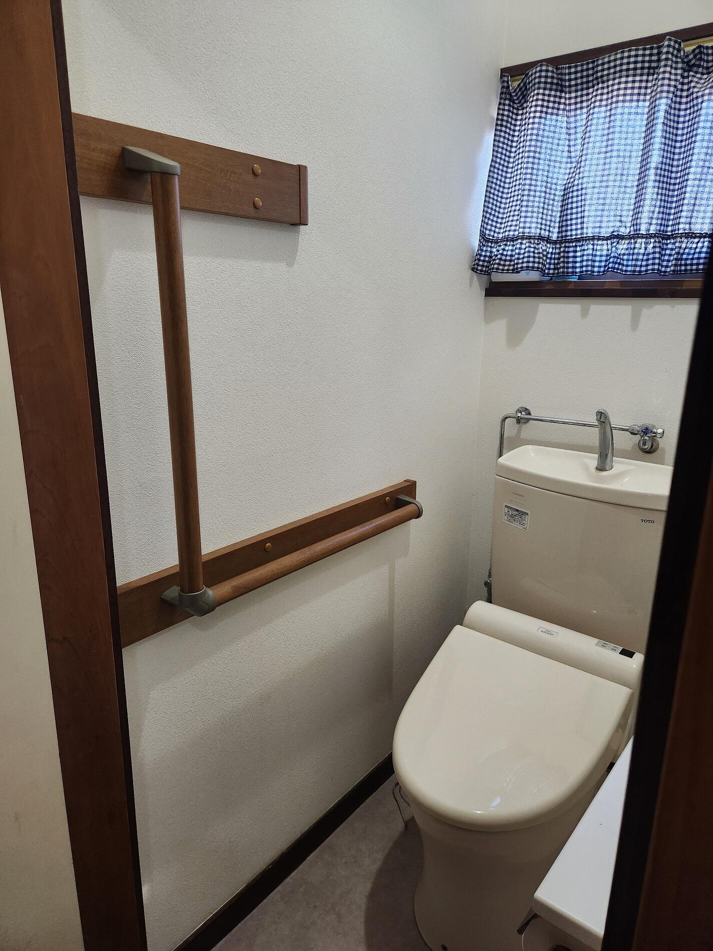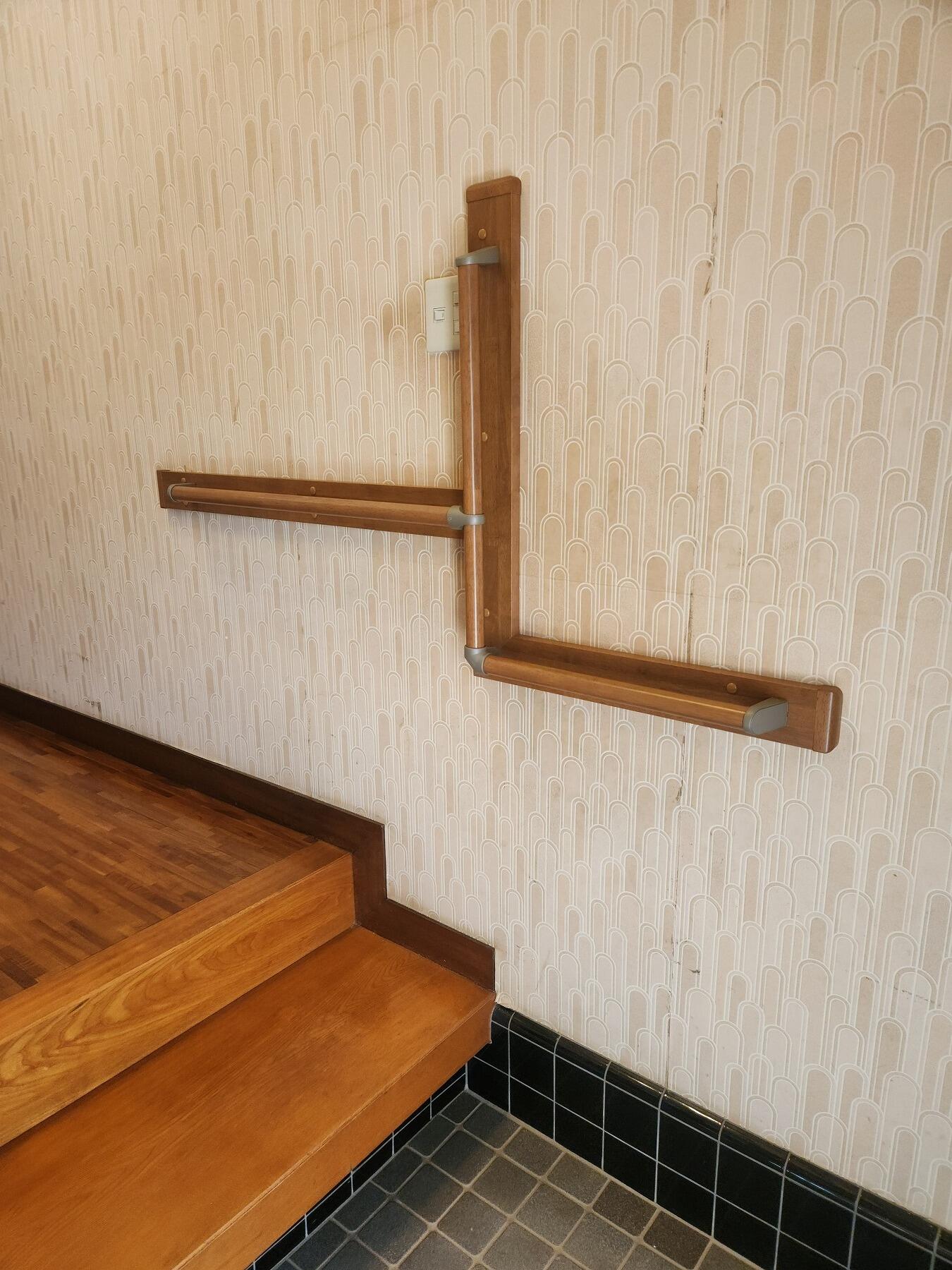 靴の脱ぎ履き、立ち上がりをサポートするため、 玄関・トイレへ手すりを取り付けしました。 玄関は式台分の段差を考慮し、縦と横のTL型へ。 トイレは立ち座り用にL型タイプ。 両方とも後付けのベース材料を使い、 壁の下地板が無い所にも取付が出来ます。 工事後はお施主様・奥様共、毎日手すりを使っていて、 取付して良かった。とのお声をいただきました。