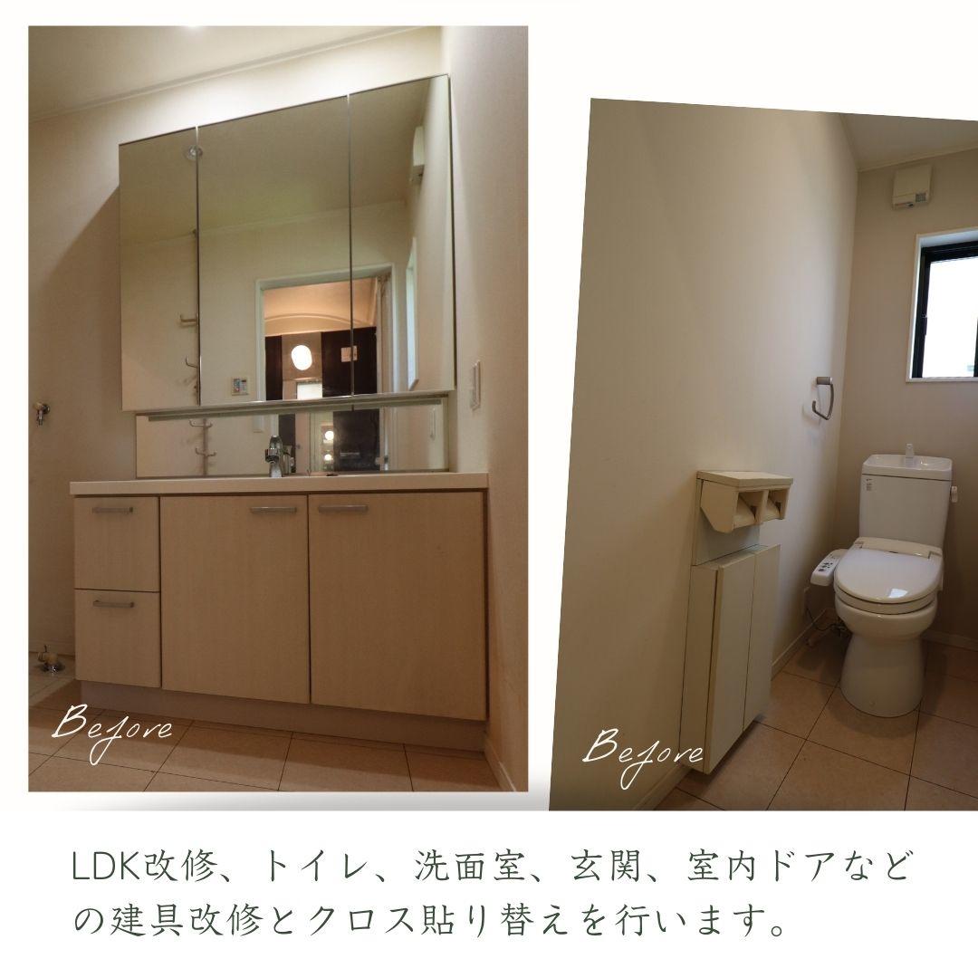 LDK改修、トイレ、洗面室、玄関、室内ドアなどの建具改修とクロス貼り替えを行います。