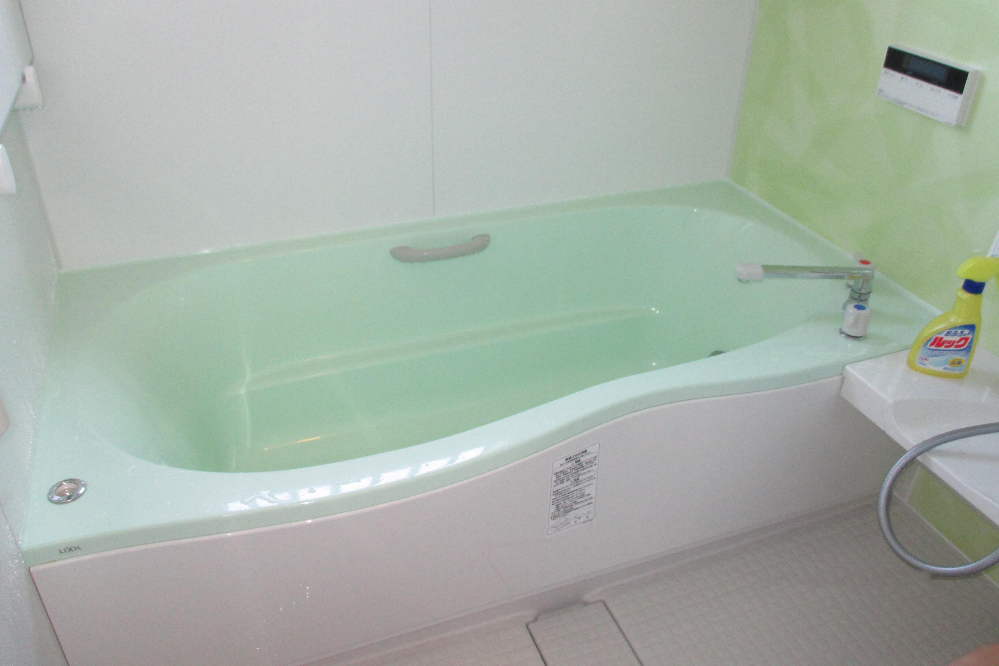 ユニットバスのリフォームです、壁・浴槽をグリーンでまとめ、さわやかな浴室になりました。