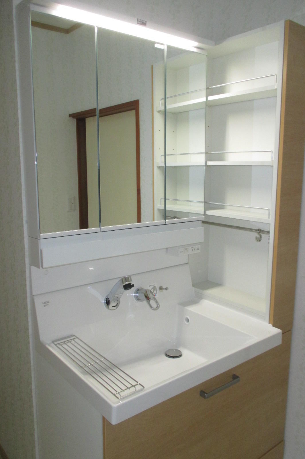 キッチン周りは白で統一し、浴室はタイルからユニットバスへ、洗面も化粧台の交換とクロスの貼り替えを行いました。