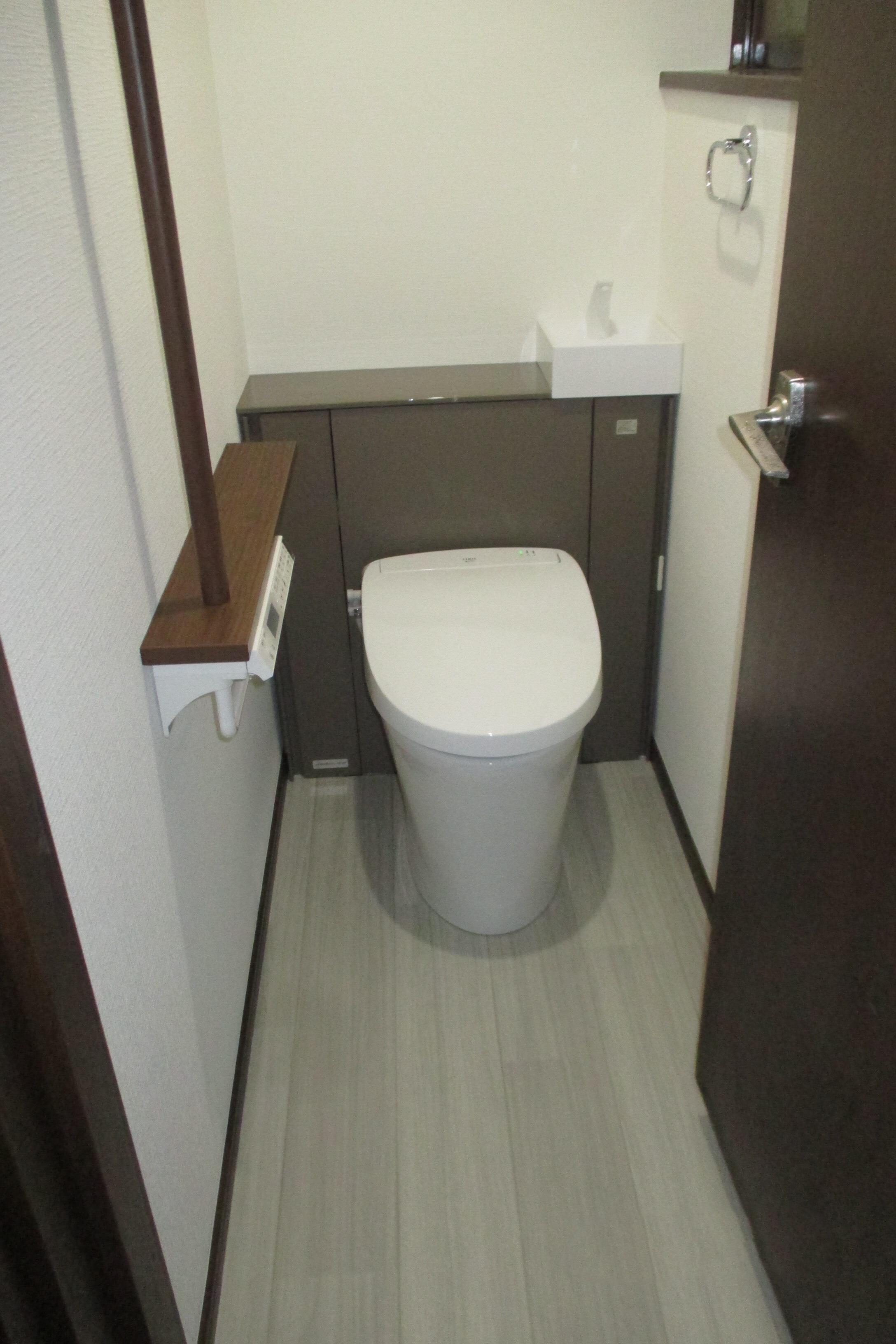 1階のトイレはキャビネット付のLIXILのリフォレを設置。 クロスや床も新しく張り替える事で一気にトイレが明るくなります。 床はクッションフロアなので、水に強く、ラクにお掃除が出来ます。