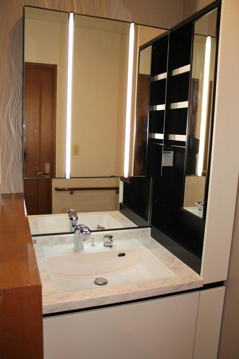 ホテルのような洗面空間をイメージしているLIXILの洗面化粧台 「ルミシス」を設置、幅は90cmです。 高級感あふれる人造大理石カウンターや縦に配置したLED照明は顔全体を照らし 影ができにくいので、使う人がうれしい設計となっています。