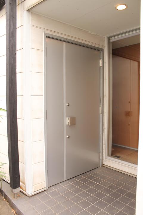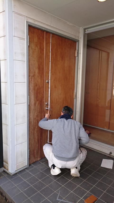 表面が傷んだ木製ドアをアルミのドアへと交換しました。 建具屋さんが採寸しオーダーメイドで制作。 ハンドルもプッシュ式で開閉も楽になり、 雨風でドアが傷む心配もなくなりました。