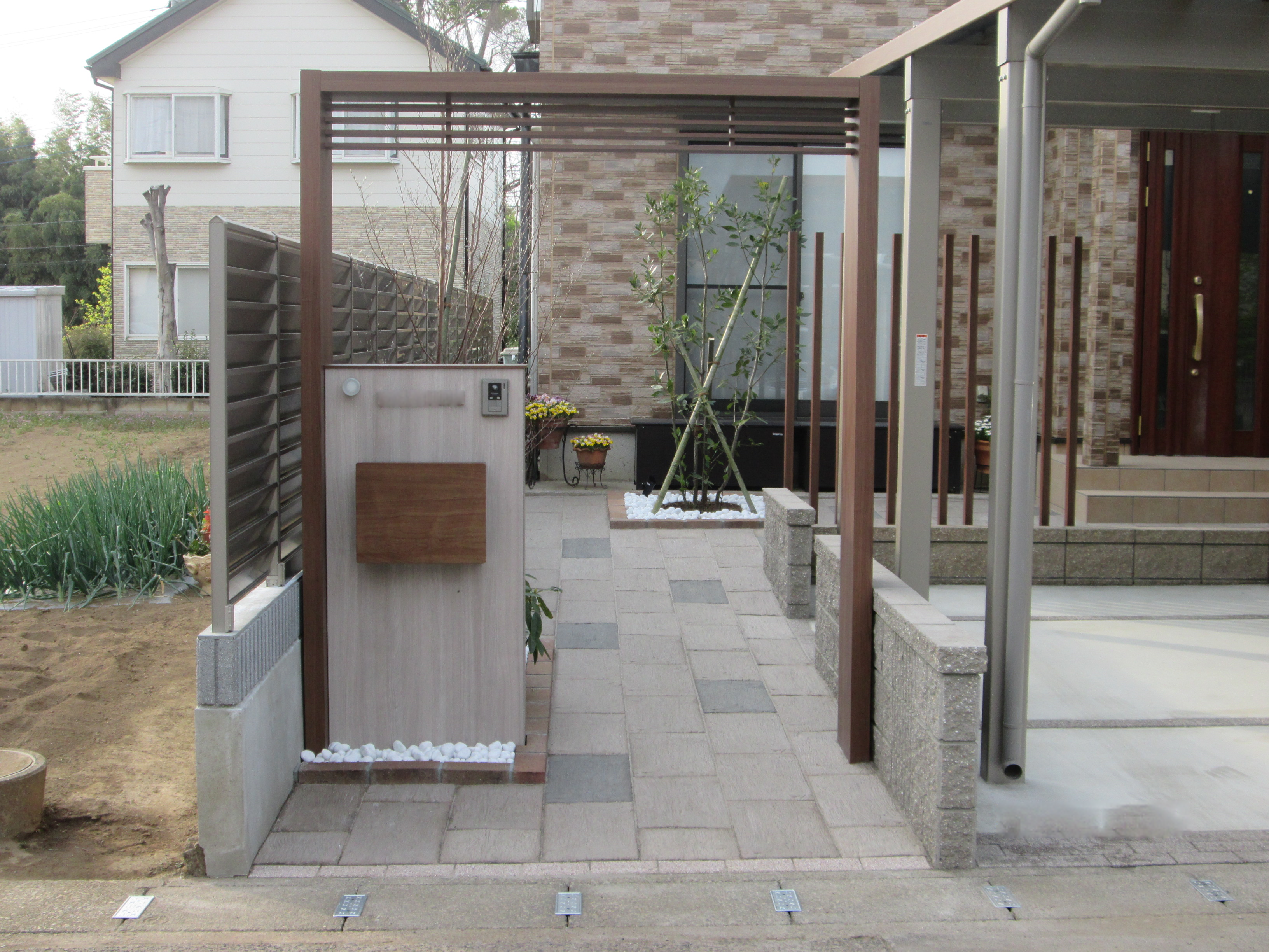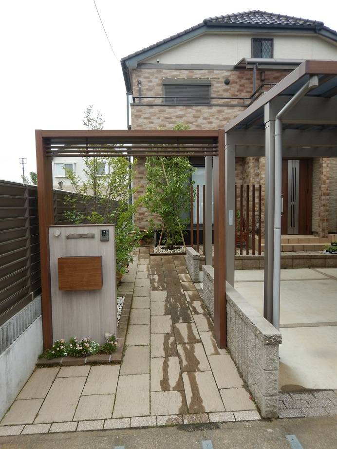 以前の外構工事も担当させていただいたのですが、シンボルツリーのオリーブの木が病気で枯れてしまい、新しいシンボルツリーに植替えたいとご依頼をいただきました。シンボルツリーには常緑樹をご希望されていたので、今回は常緑ヤマボウシをご提案いたしました。夏に白い花をたくさん咲かせてひと際目を引くのでシンボルツリーに相応しい樹木です。元々とても素敵なお宅ですが、タイル調の外壁と常緑ヤマボウシの深いグリーンがとても相性がよくお家を引き立ててくれます。また、常緑ヤマボウシは紅葉もするので秋には赤く紅葉し四季折々いろいろな景色が楽しめます。(常緑ヤマボウシは甘くてかわいい実もつけますよ)