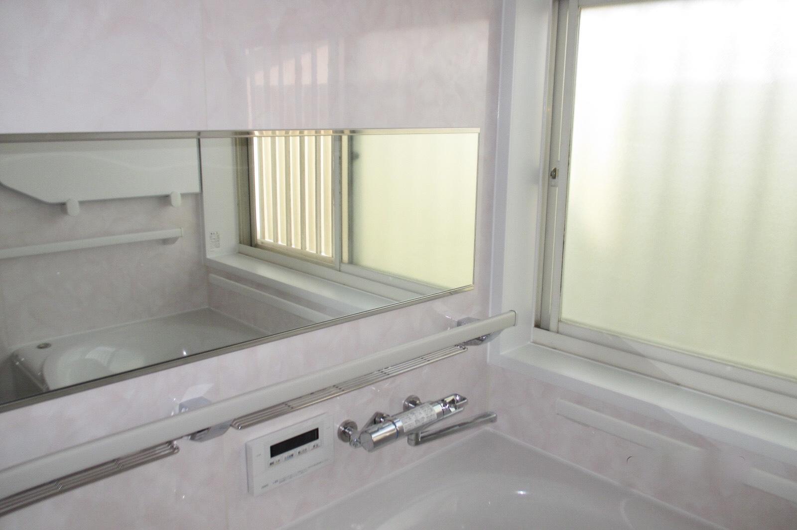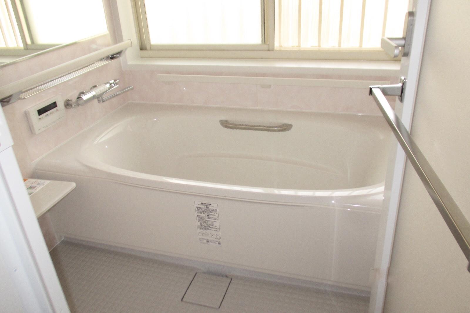 大人気の浴室、LIXILリデアBタイプの1坪サイズです。 淡いピンクの壁パネルは奥様がお選びに なりました。手すりもつき、ドアの段差も低くなりましたので、 体への負担も少なく、安心して入浴が出来ることと思います。