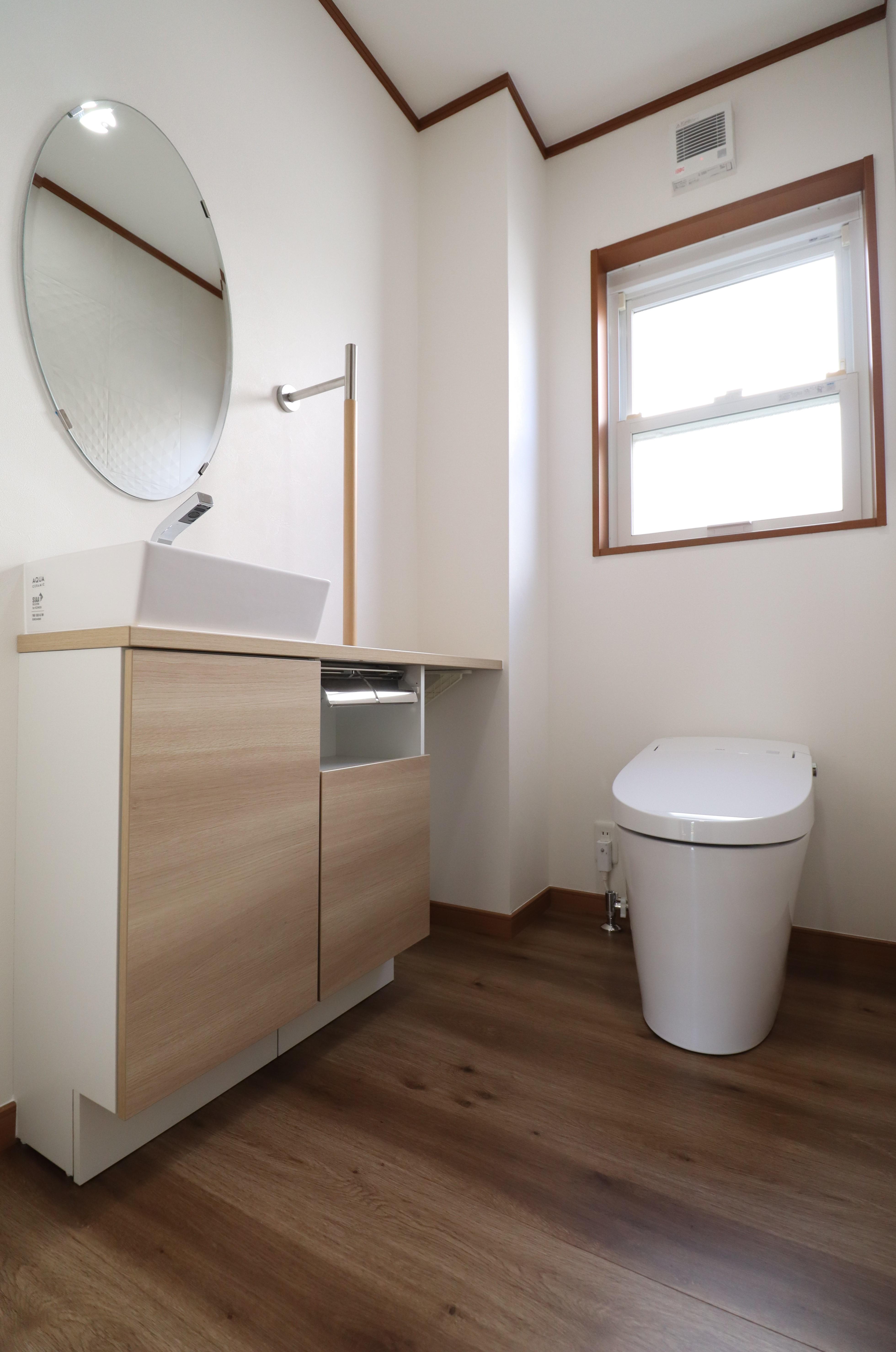 コンパクト設計で空間を有効活用でききる形状のタンクレストイレサティスSに手すり付きの角型シンプルデザインの手洗キャビネット、キャパシアを設置。水栓は使用時手元を照らすライトがついています。