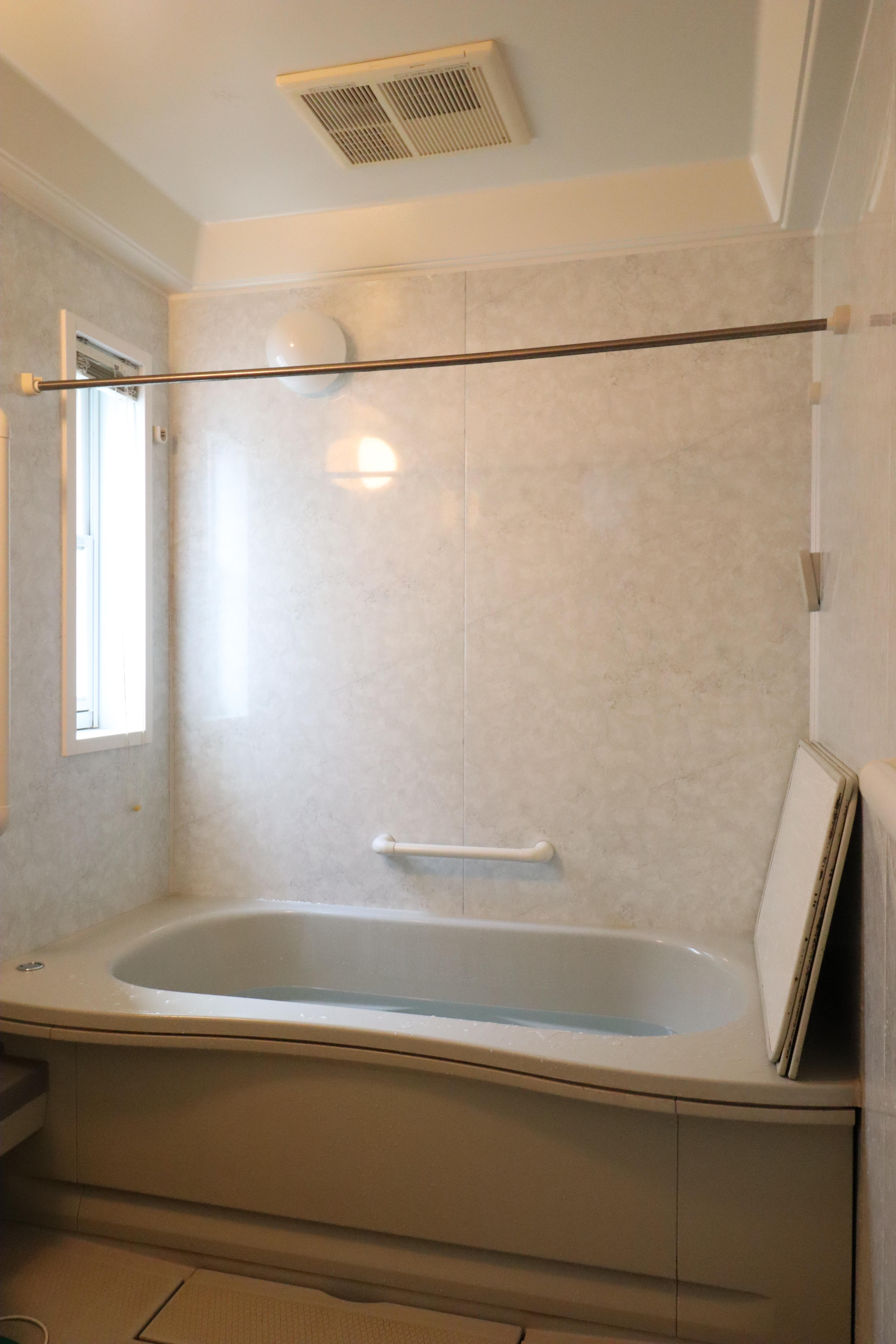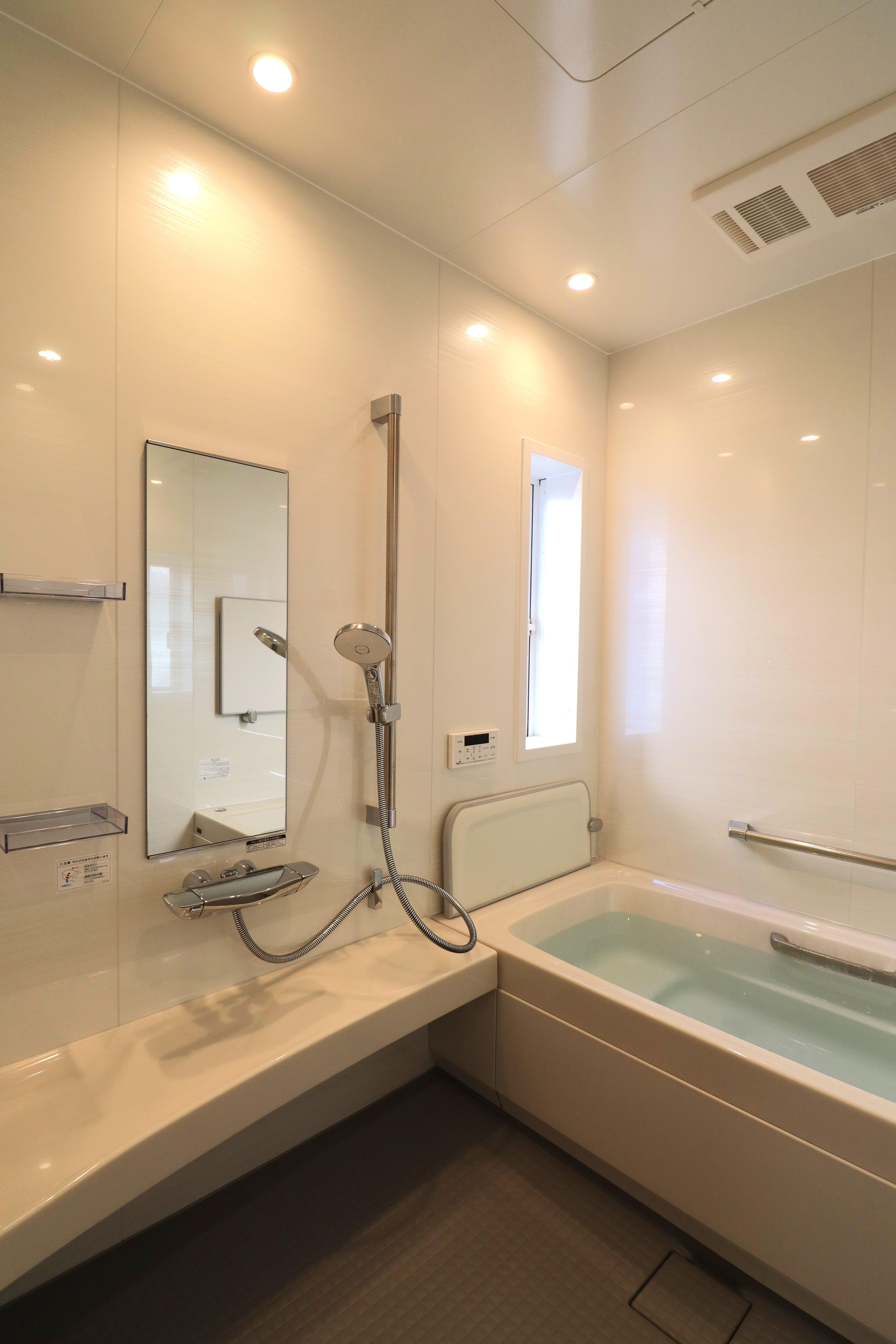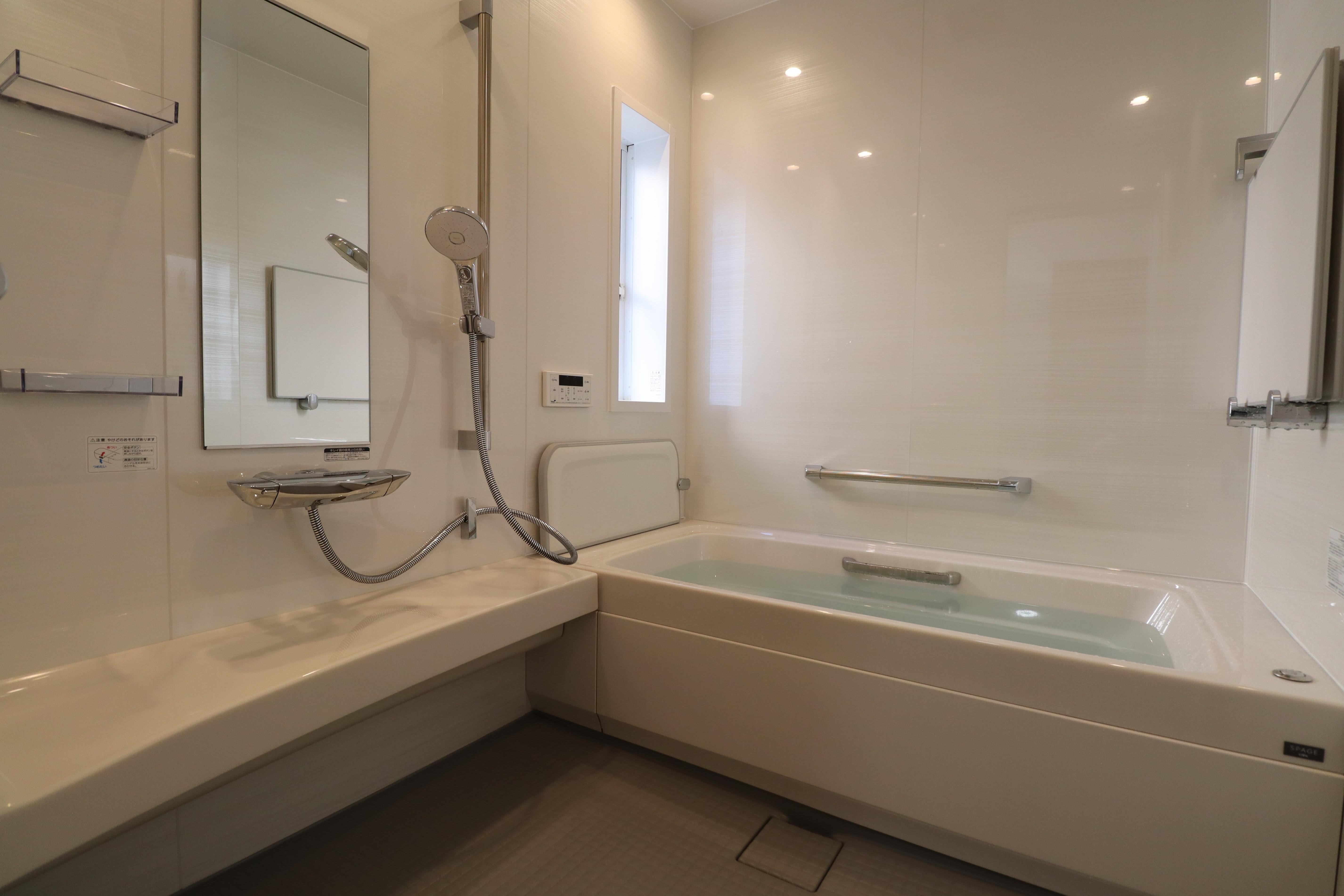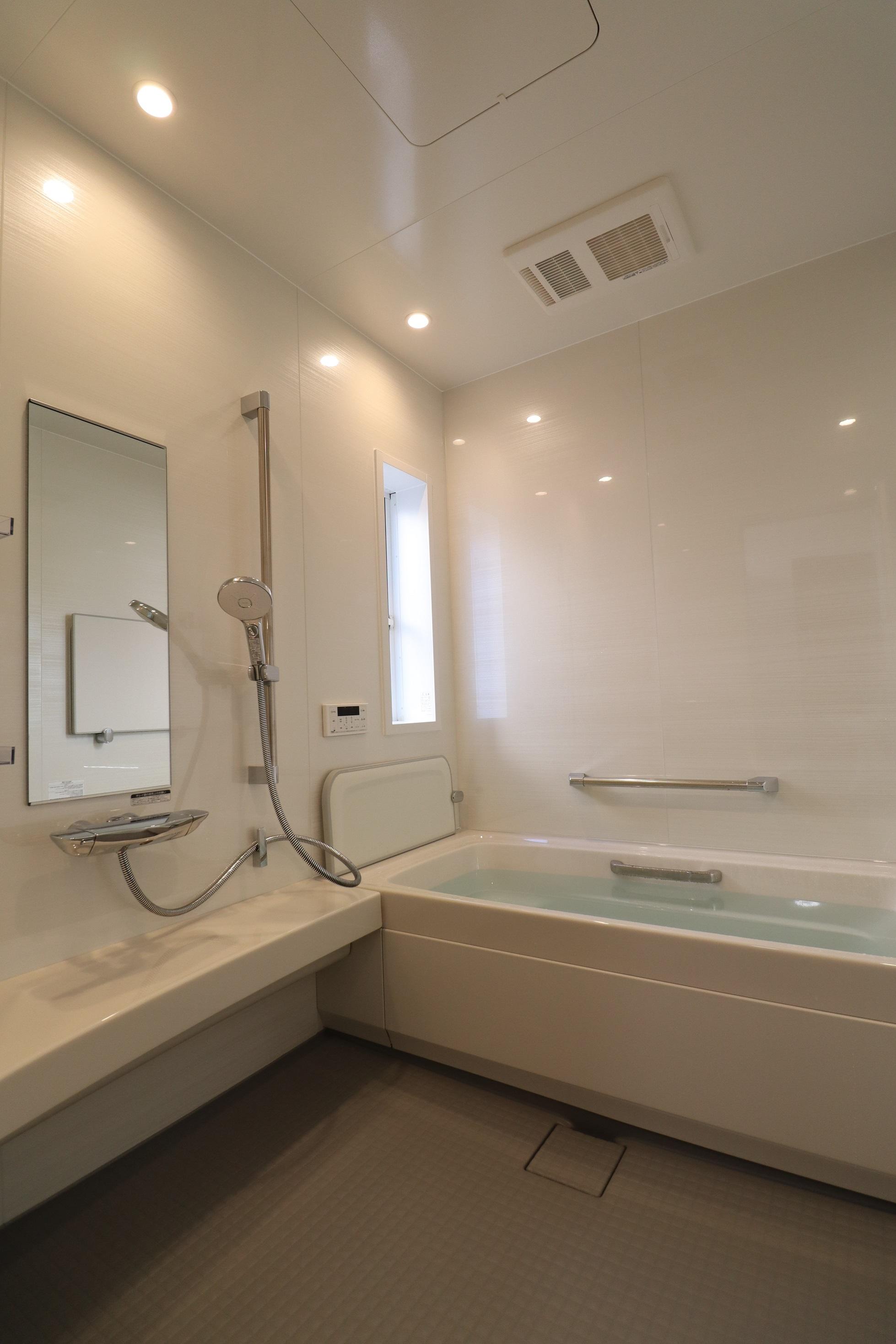 高気密浴槽のシステムバスルーム スパージュの浴槽は人造大理石、滑らかな手触りアクリル鏡面仕上げの「グランザ」、壁パネルをはじめエプロンも明るいホワイト色に。フロアは落ち着きのあるグレーをお選びいただきました。