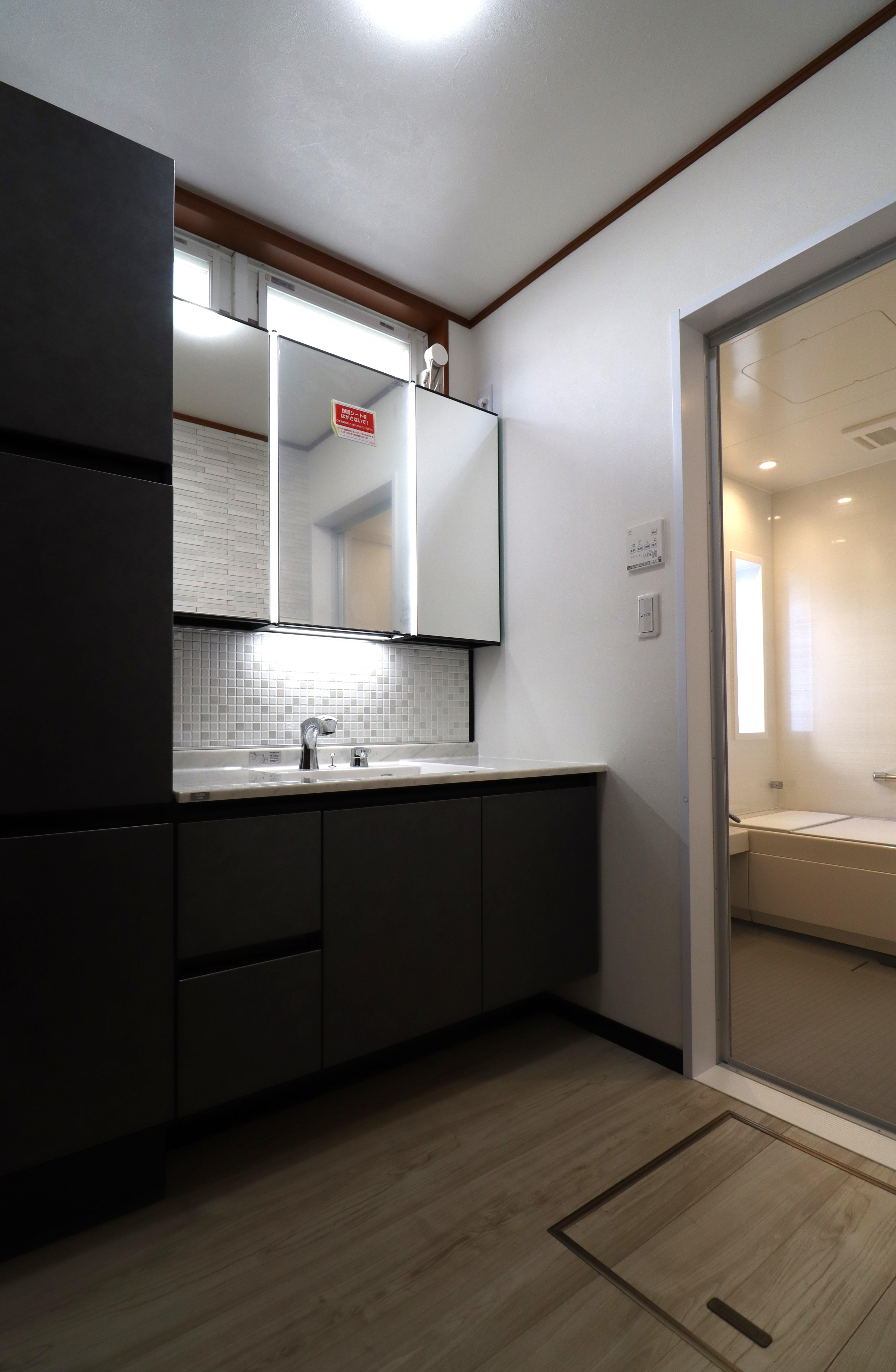 洗面化粧台はボウルとカウンターが一体型のお掃除ラクラクのルミシス。扉カラーは、グレインブラックと、ホワイトカラーのボウルにモザイクタイル製のバックパネルで洗練された仕上がりに。タッチレススイッチで照明や水栓を手を触れずオン・オフができます。