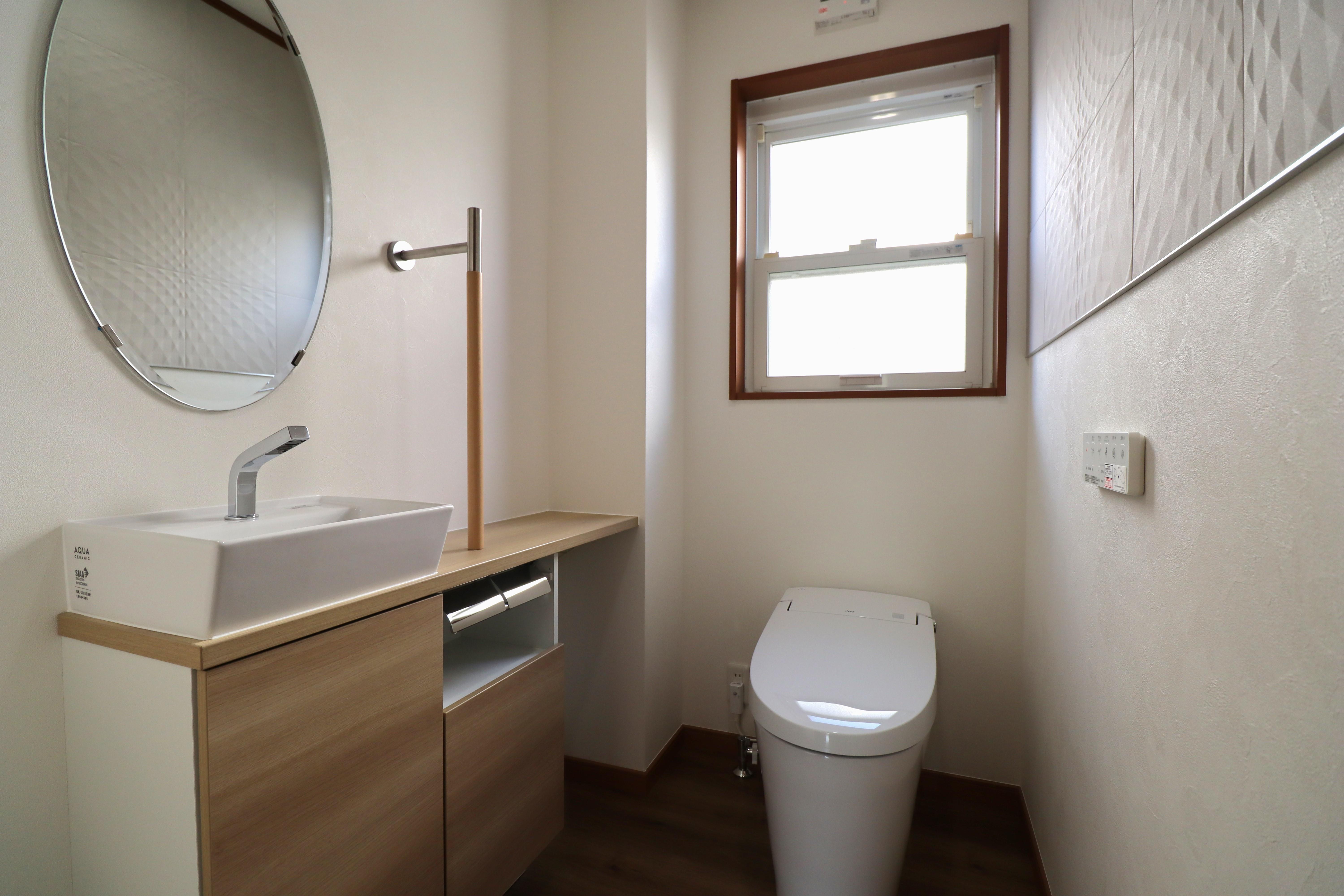 キャビネットの対面壁に設置されたエコカラットのベージュと清潔感のあるオフホワイトのトイレとが清潔感のある空間に。