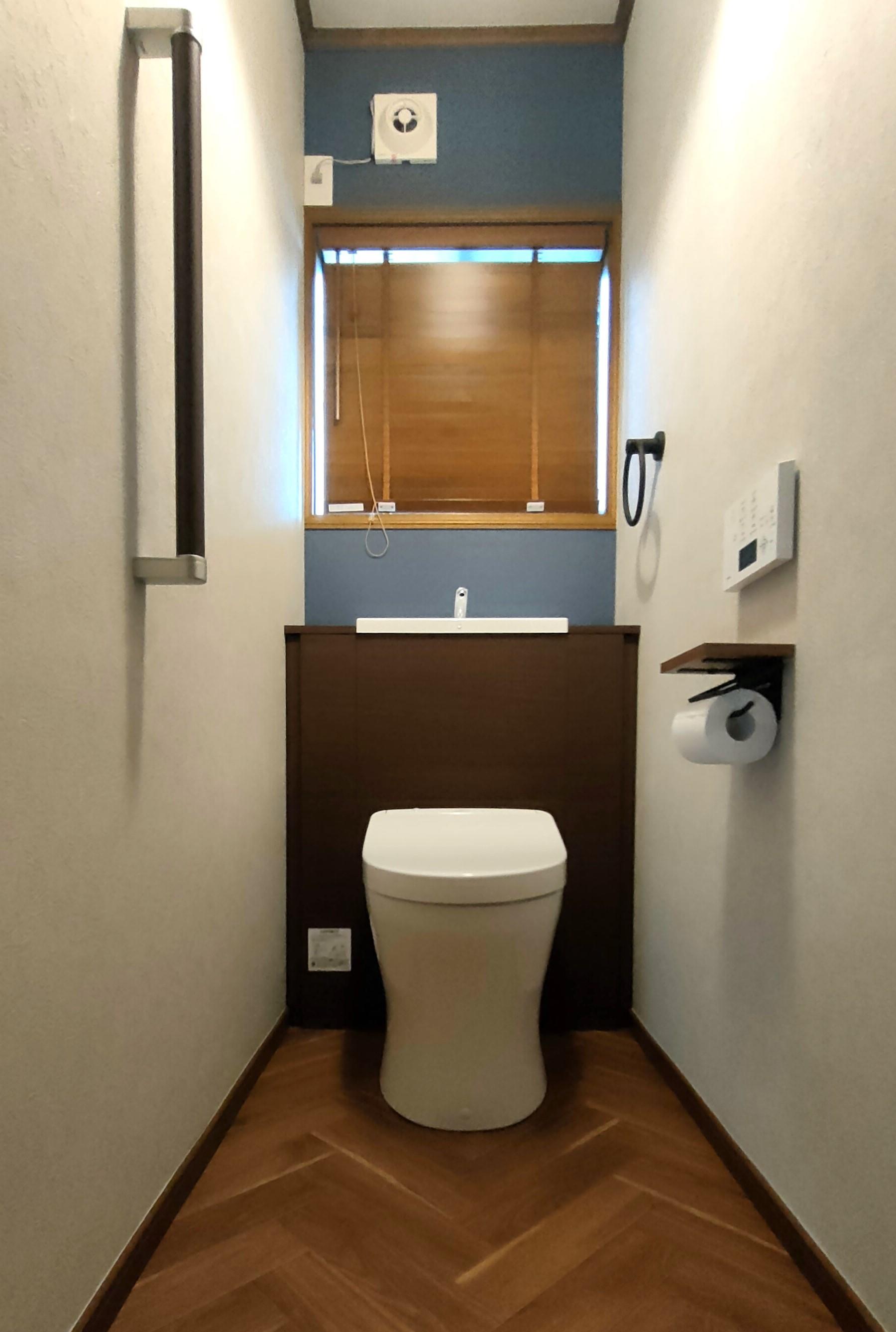 便座からの水漏れによる改修依頼がありました。お客様のご希望商品がありましたので、 壁や床の補強をご提案させて頂きました。クロスやクッションフロアにつきましては オーナー様、手書きのパースを見せて頂き、イメージに合った内装に仕上げにしております。 アクセントにはネイビー・ベースはグレーのクロス、床はヘリンボーン調のクッションフロアとなっております。 またタオルリングや紙巻き器、照明にブラックを取り入れ、上質な空間となりました。 オーナー様御支給品のブラインドも良いアクセントとなっております。 リフォーム後に水道料金について「水の使用量がだいぶ減りました」と報告がありました。 とても嬉しいご連絡、いつもありがとうございます。