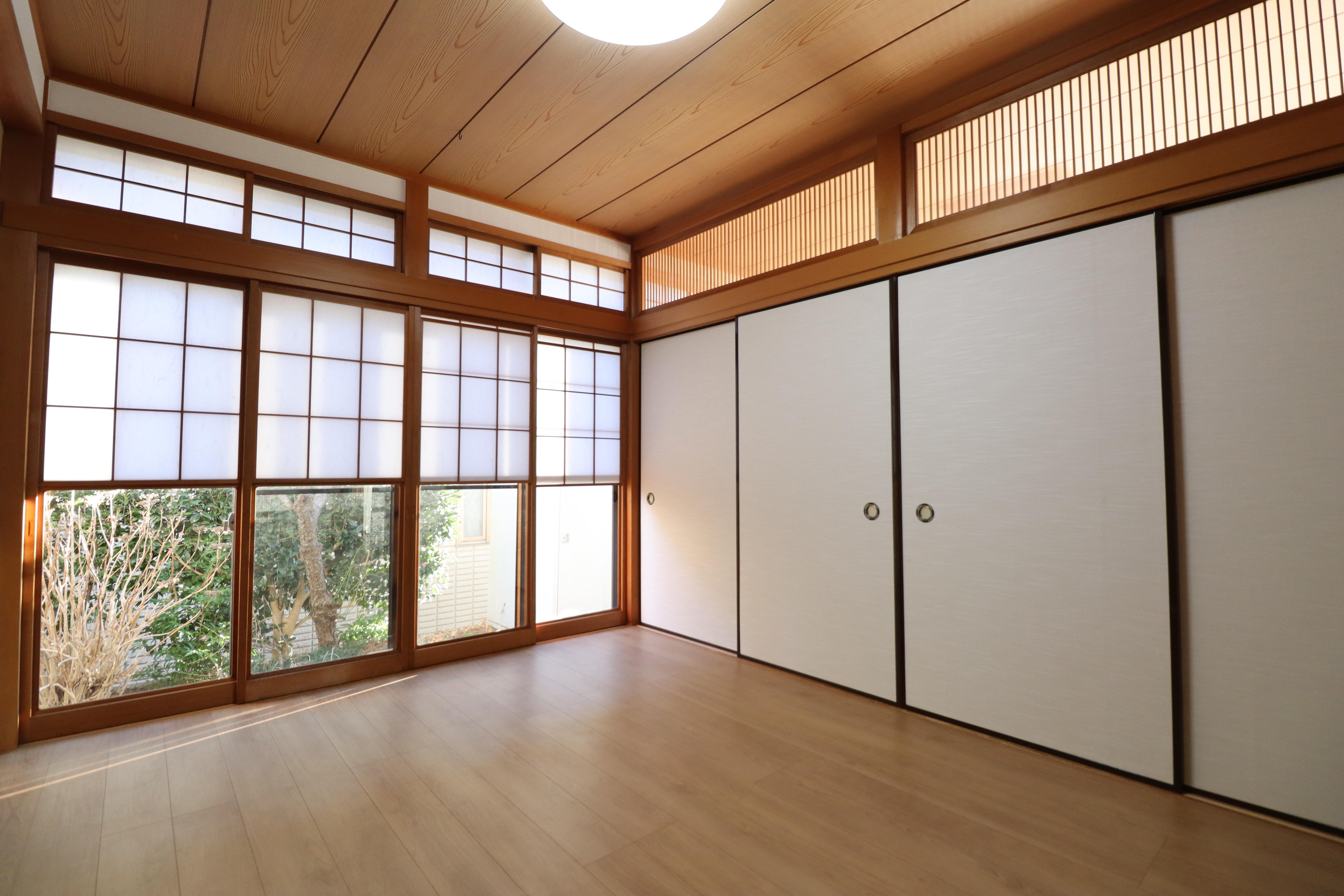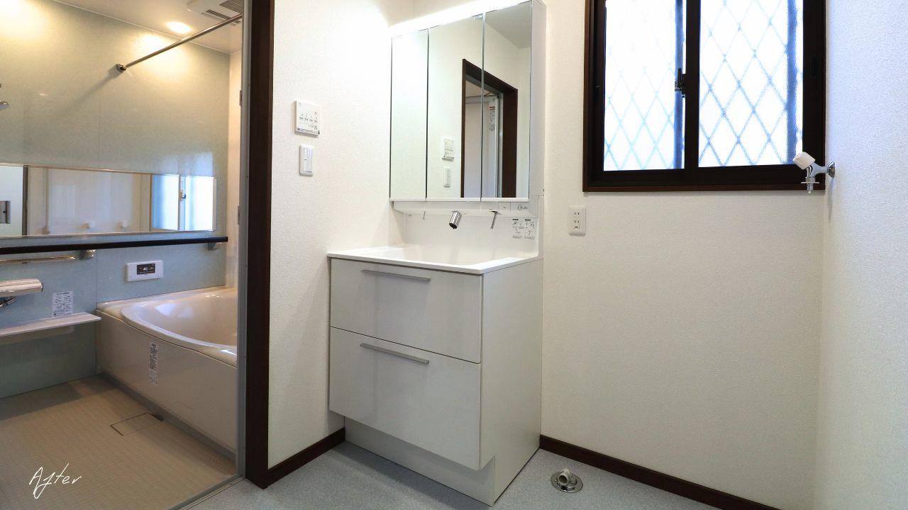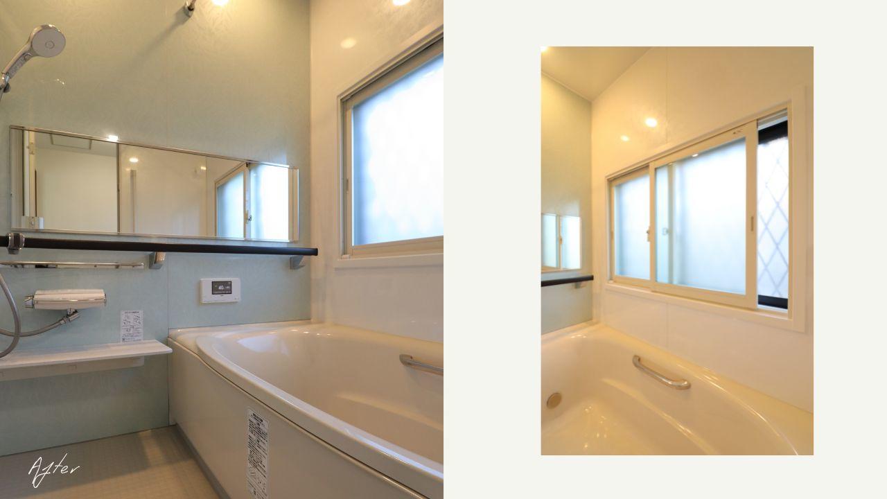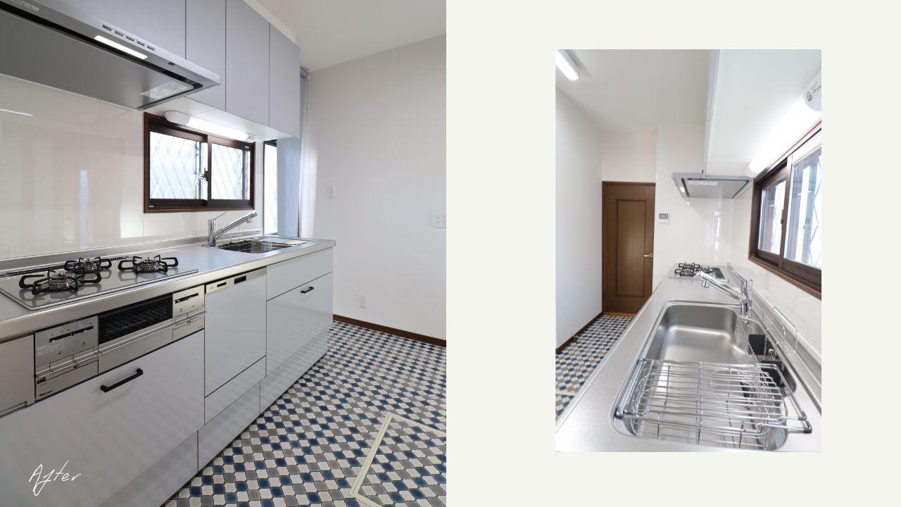 住まわれている二世帯住宅の雰囲気を継承されたいとご希望を伺いました。 フルリノベーションのため決めることが沢山あるなかでまずとりかかられたのは、 ダイニングキッチンでした。システムキッチンはLIXIL シエラS。シルバーグレーの扉カラーとステンレスシンクに、鮮やかなブルーが美しいコラベルモザイク柄の床がアクセントに。 システムバスはLIXIL リデアを採用されました。水廻りも淡いブルーをメインカラーとした爽やかな仕上がりに。 2間続きの和室は、1部屋を祖父母様世帯で使用されていた雪見障子を生かした和モダンな洋室にされました。 また、お子様世帯におすすめされ、取り付けられた内窓断熱のインプラスを北側のキッチンと西側のバスルーム・洗面室に加え、居室に施した床断熱で非常に暖かく、快適になられたとお喜びの声を頂いております。