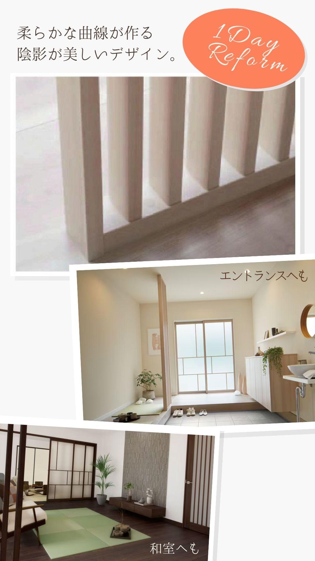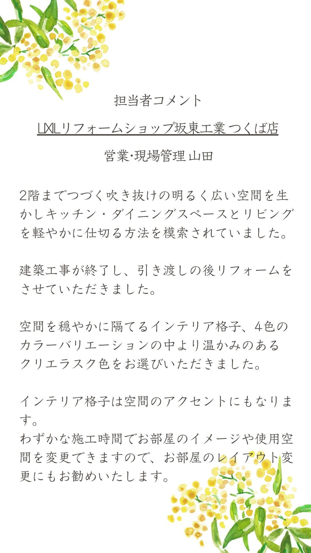 2階までつづく吹き抜けの明るく広い空間を生かし キッチン・ダイニングスペースとリビングを軽やかに仕切る方法を模索され 引き渡しの後リフォームをさせていただきました。 空間を穏やかに隔てるインテリア格子、4色のカラーバリエーションの中より 温かみのあるクリエラスク色をお選びいただきました。 インテリア格子は空間のアクセントにもなります。 わずかな施工時間でお部屋のイメージや使用空間を変更できますので、 お部屋のレイアウト変更にもお勧めいたします。
