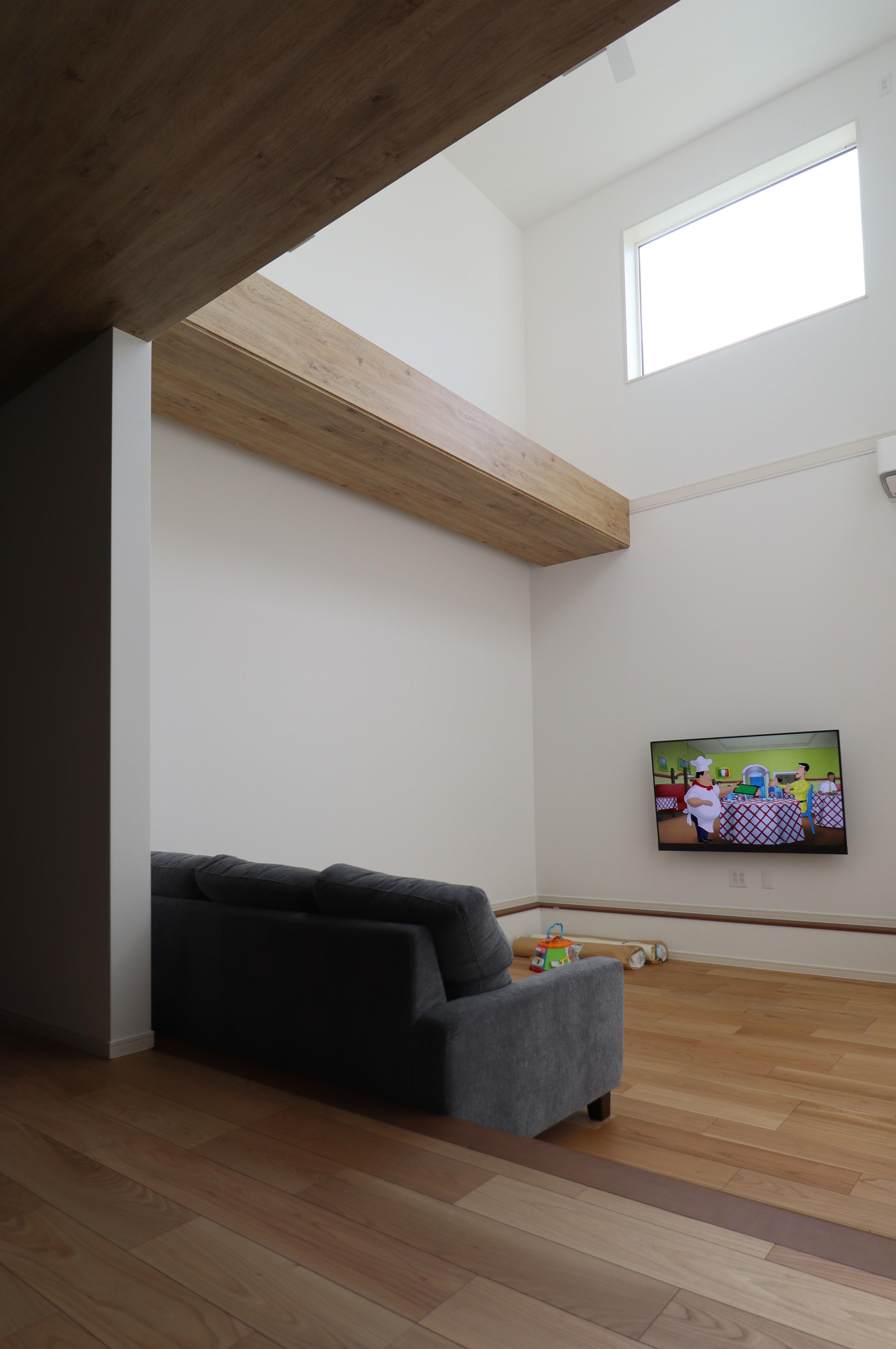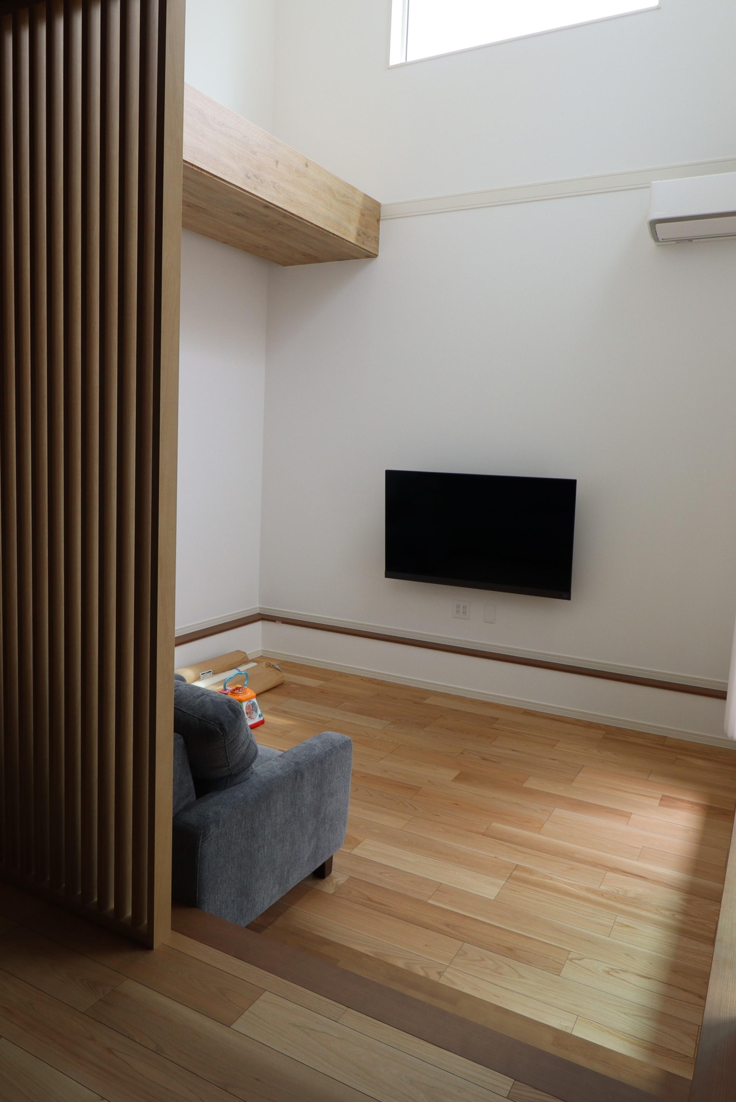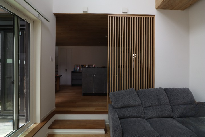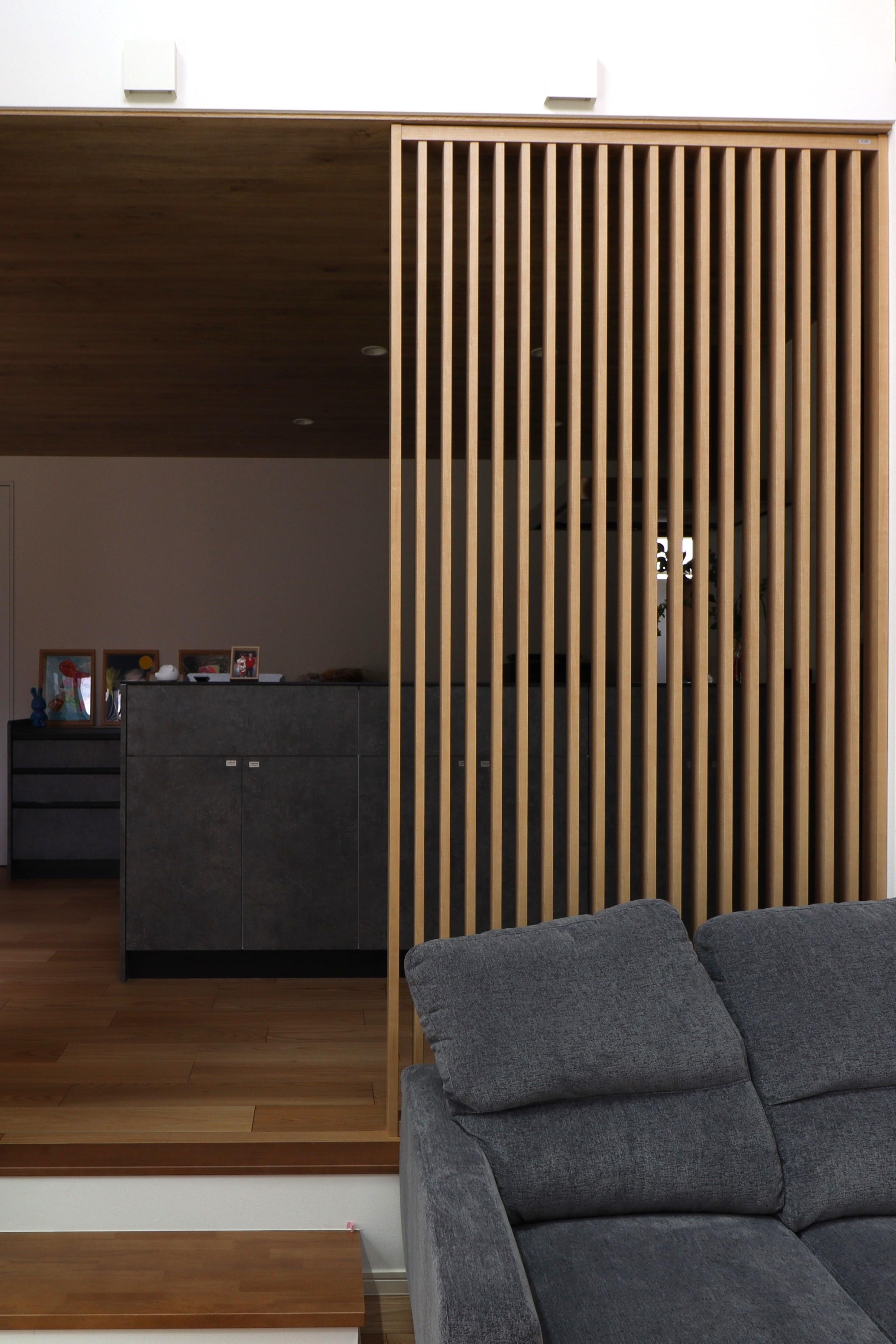 新築戸建物件を建築中にリビングとダイニングをつなぐ空間に2階までつづく吹き抜けからの明るい開放感を保ちつつ、穏やかに仕切りをされたく検討され、引き渡し後にリビングとダイニングをつなぐステップにインテリア格子を設置されました。