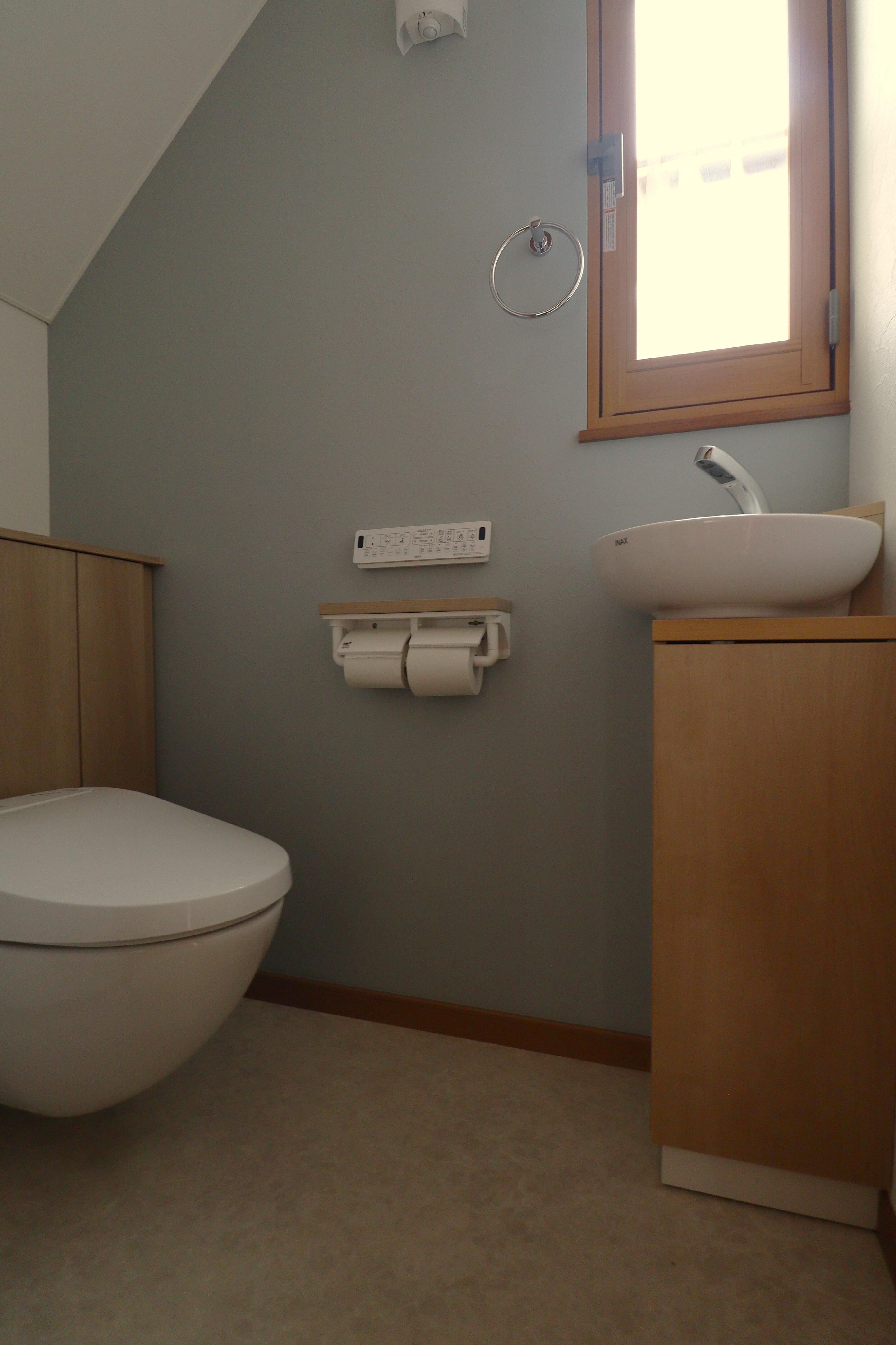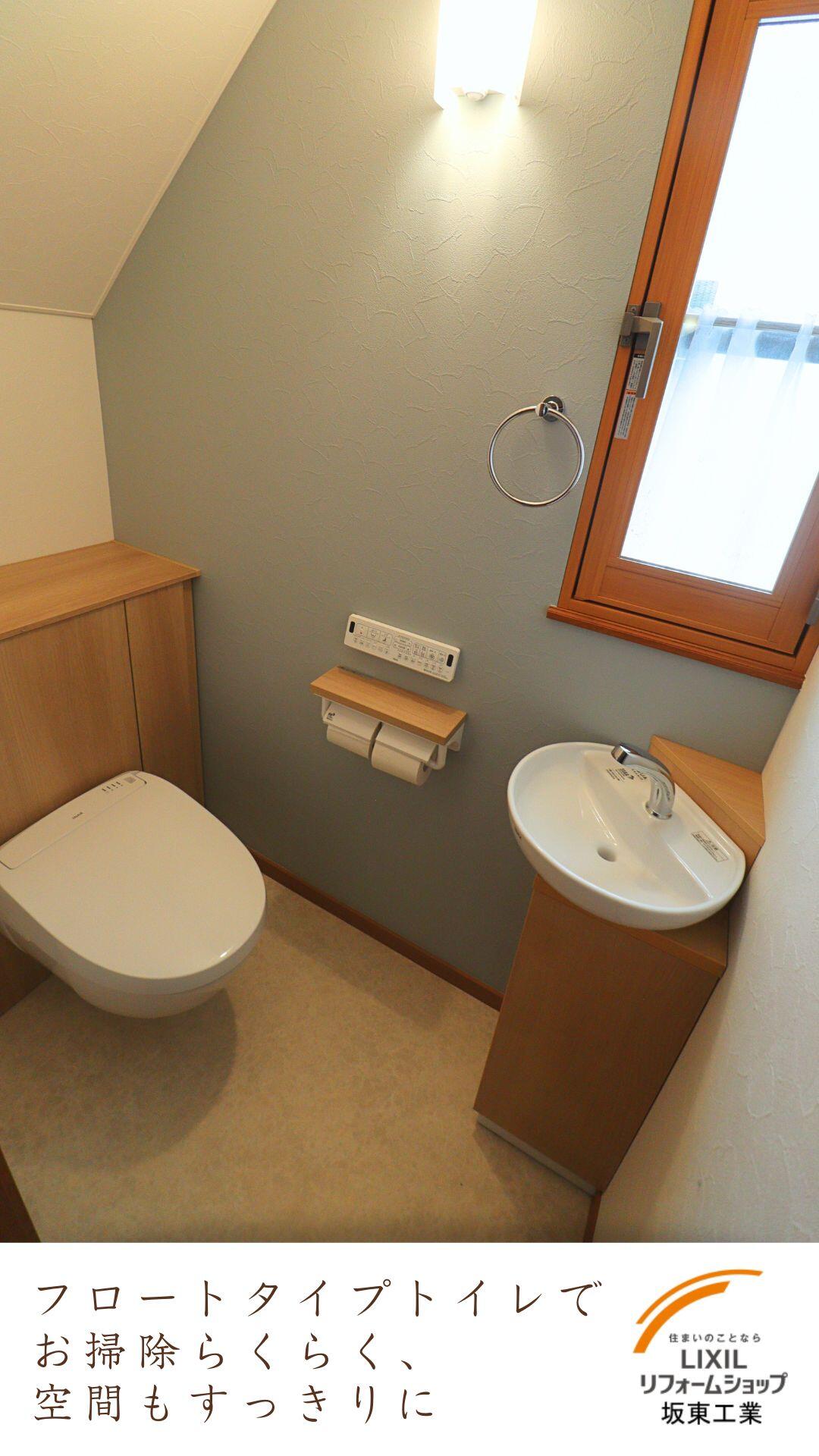 トイレの老朽化、タンクの清掃のしずらさと北側にトイレがあるため、冬の寒さ対策も考慮し内窓設置工事を含めたトイレリフォームをされました。 トイレは床から浮いているためお掃除のしやすいのはもちろん、節水・節電にも優れているキャビネット付フロートトイレを選定されました。 やや暗い印象でした室内は淡いグレーのアクセントクロスに木目調の建具を組み合わせ、明るく温もりのある空間に仕上がりました。 また、新設した手洗いキャビネットは空間を有効的に使えるコーナー置きに。充実の収納力奥行のあるキャビネットでお掃除道具やトイレットペーパーをしっかり収納でき、ほのかライト付きの自動水栓でゆったり手洗いができます。 寒さ対策のため設置した内窓は開き窓Low-Eグリンガス入り、元々ついていた両上げ下げ窓(ダブルハングウインドウ)に開き窓(たてすべり出し窓)Low-E複層ガラス グリーン(高遮熱仕様)アルゴンガス入りの内窓を設置しました。