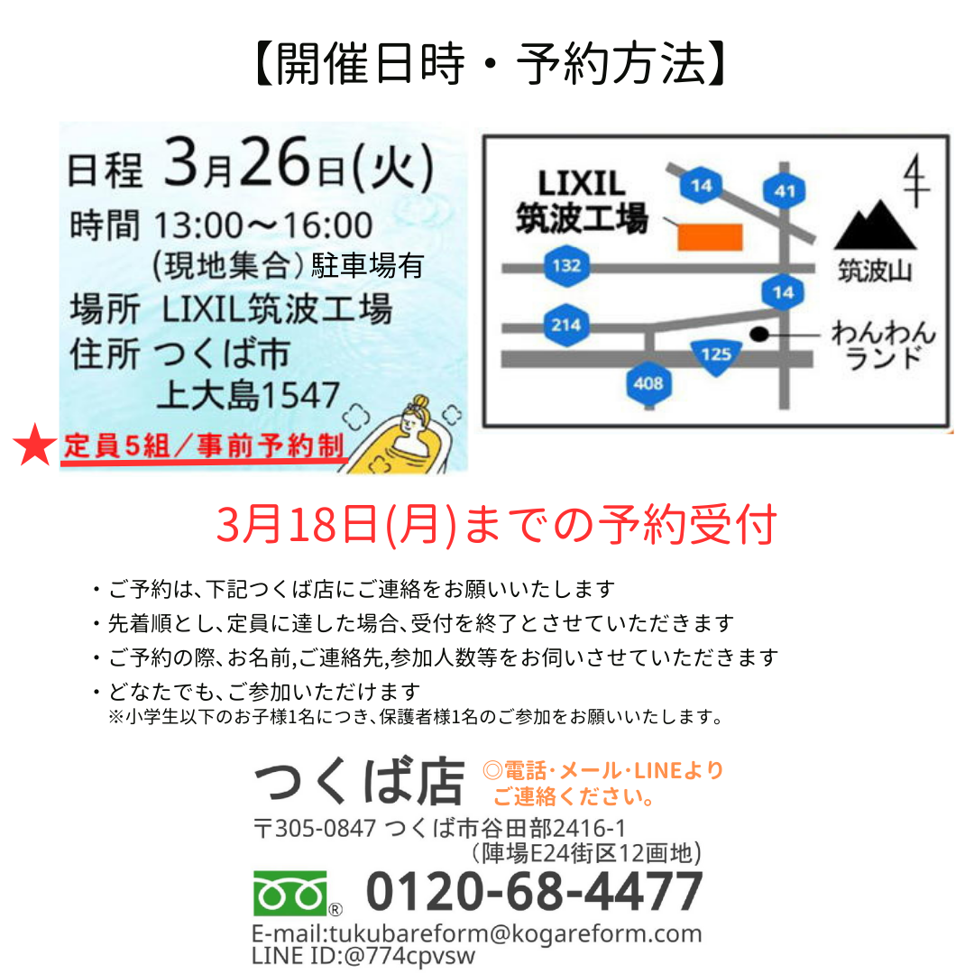 LIXILリフォームショップ坂東工業presents 第2回 "LIXIL筑波工場 工場見学と体験入浴会"のお知らせ