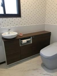 手洗いと便器の配置も変更し、壁際に手洗器付収納キャビネット(キャパシア:LIXIL)