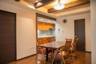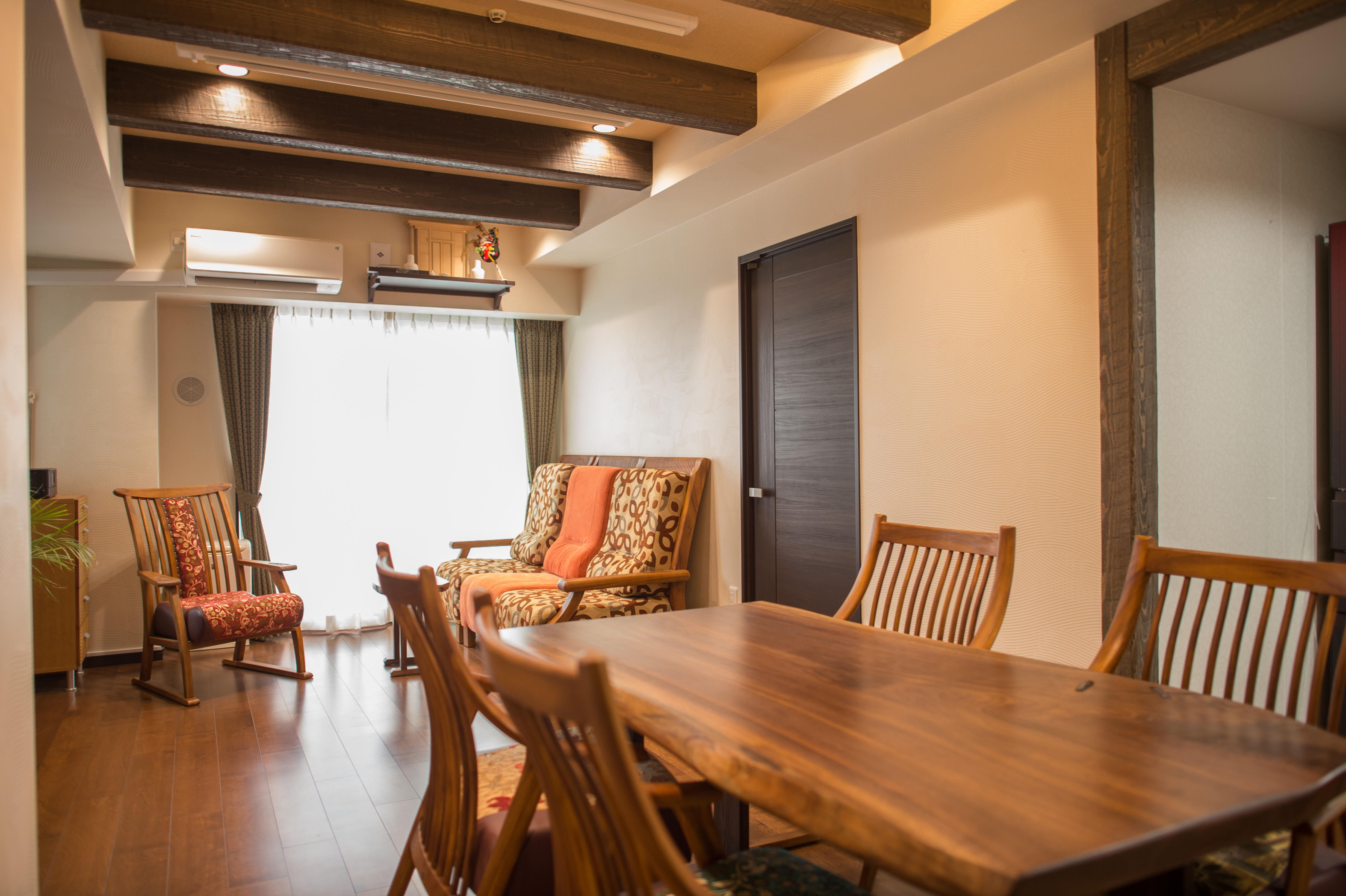 見せ梁のある折上げ天井にすることで、のびやかな広がりのあるリビングとなりました。
