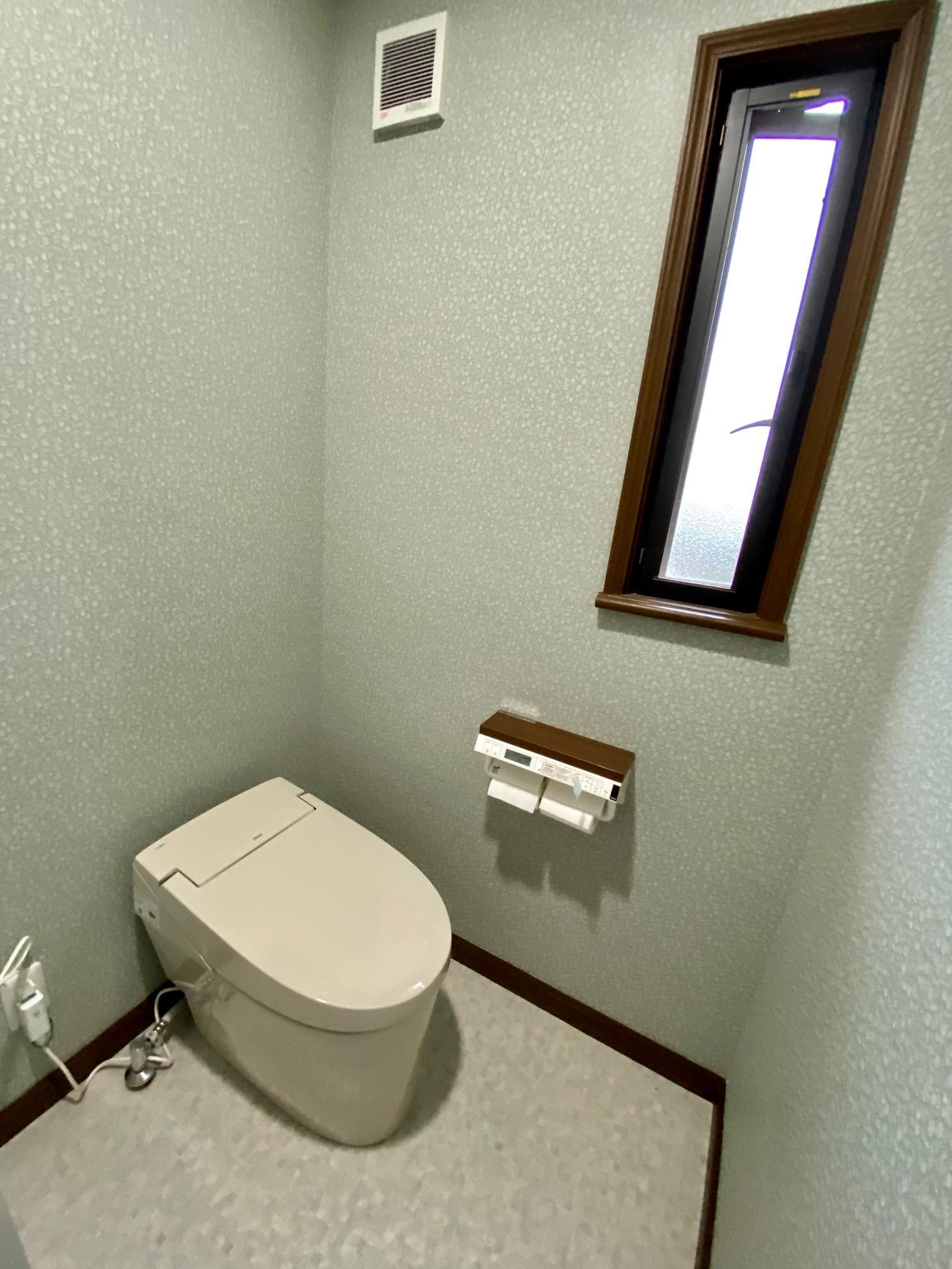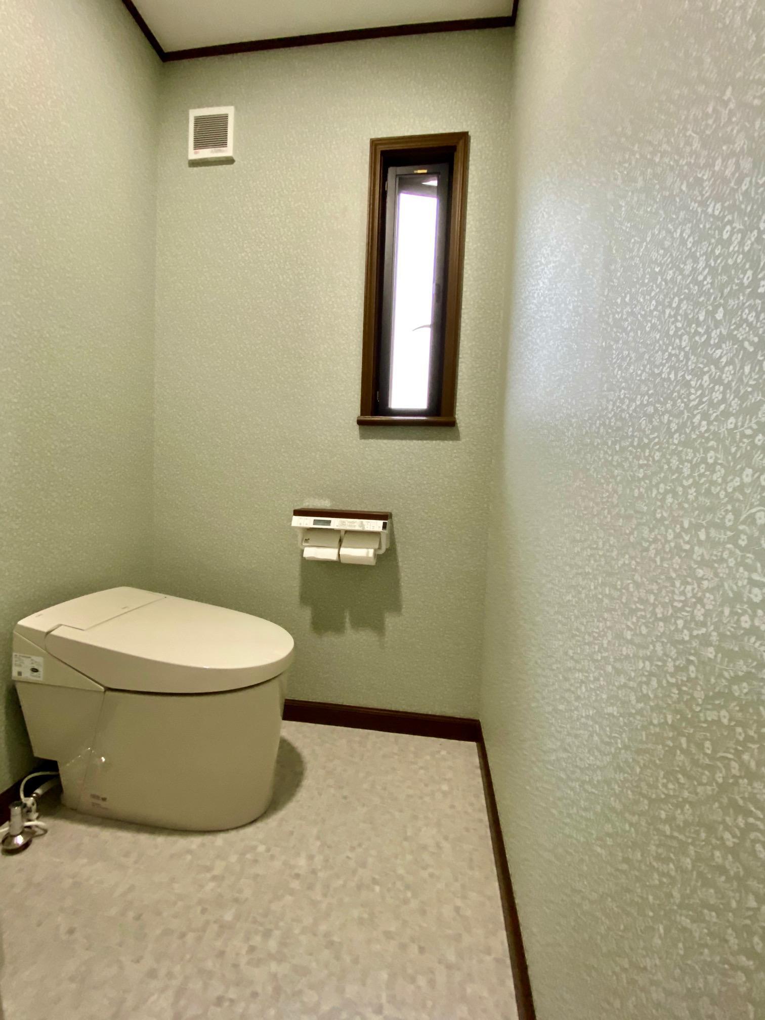 グリーンがかった花柄の壁紙とナチュラルホワイトなトイレが優しい印象に☆タンクレスなサティスSとミニマムなリモコンが空間を広々と感じさせてくれます。床と壁がどちらも柄ではありますが、うるさくならない印象の仕上がりがお客様のセンスを感じます☆彡