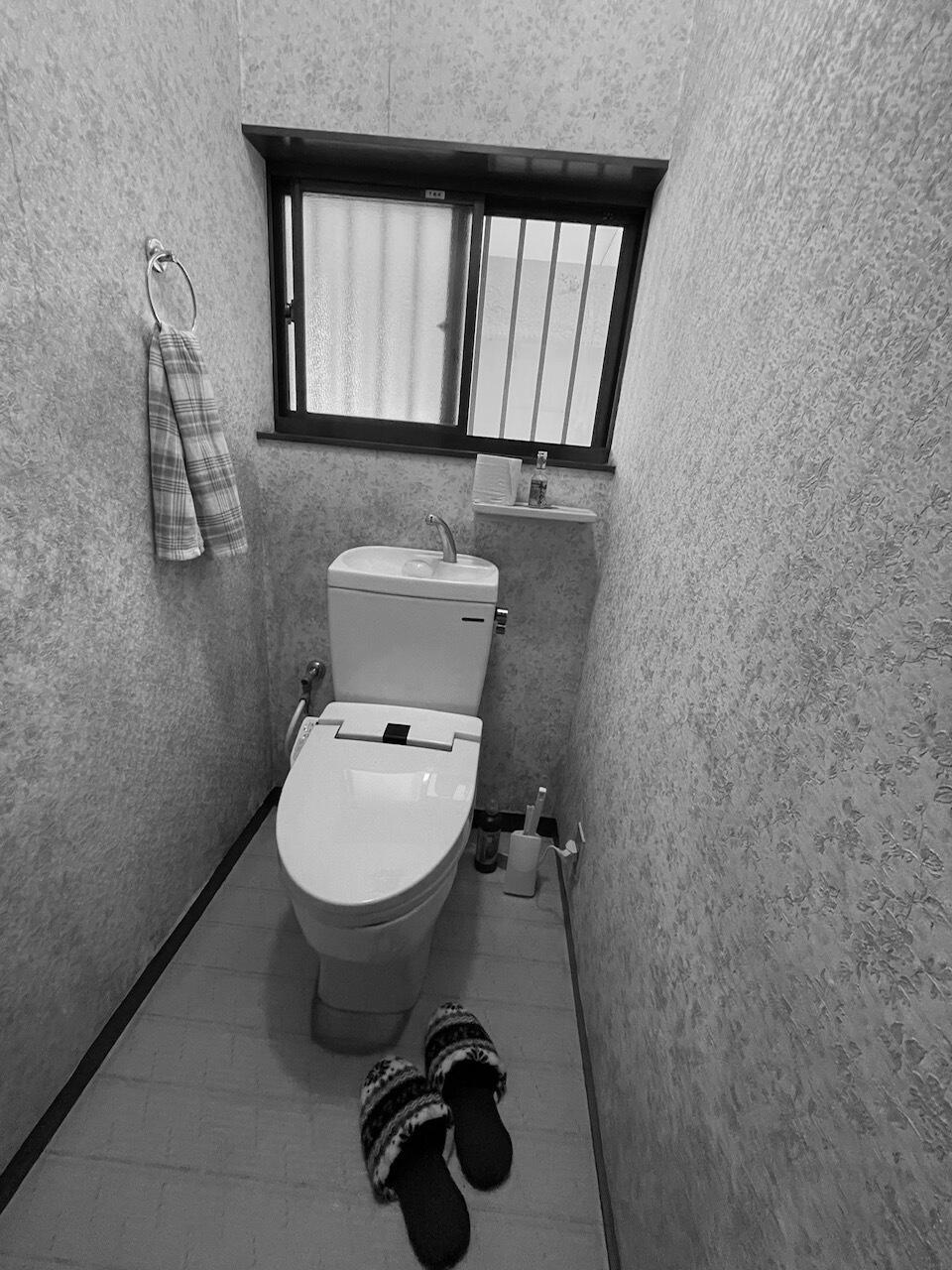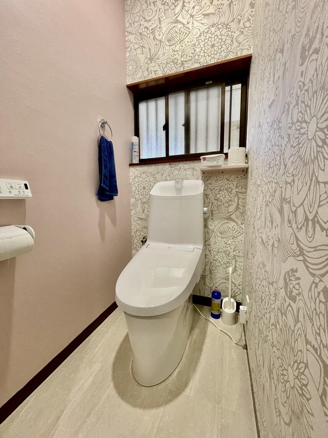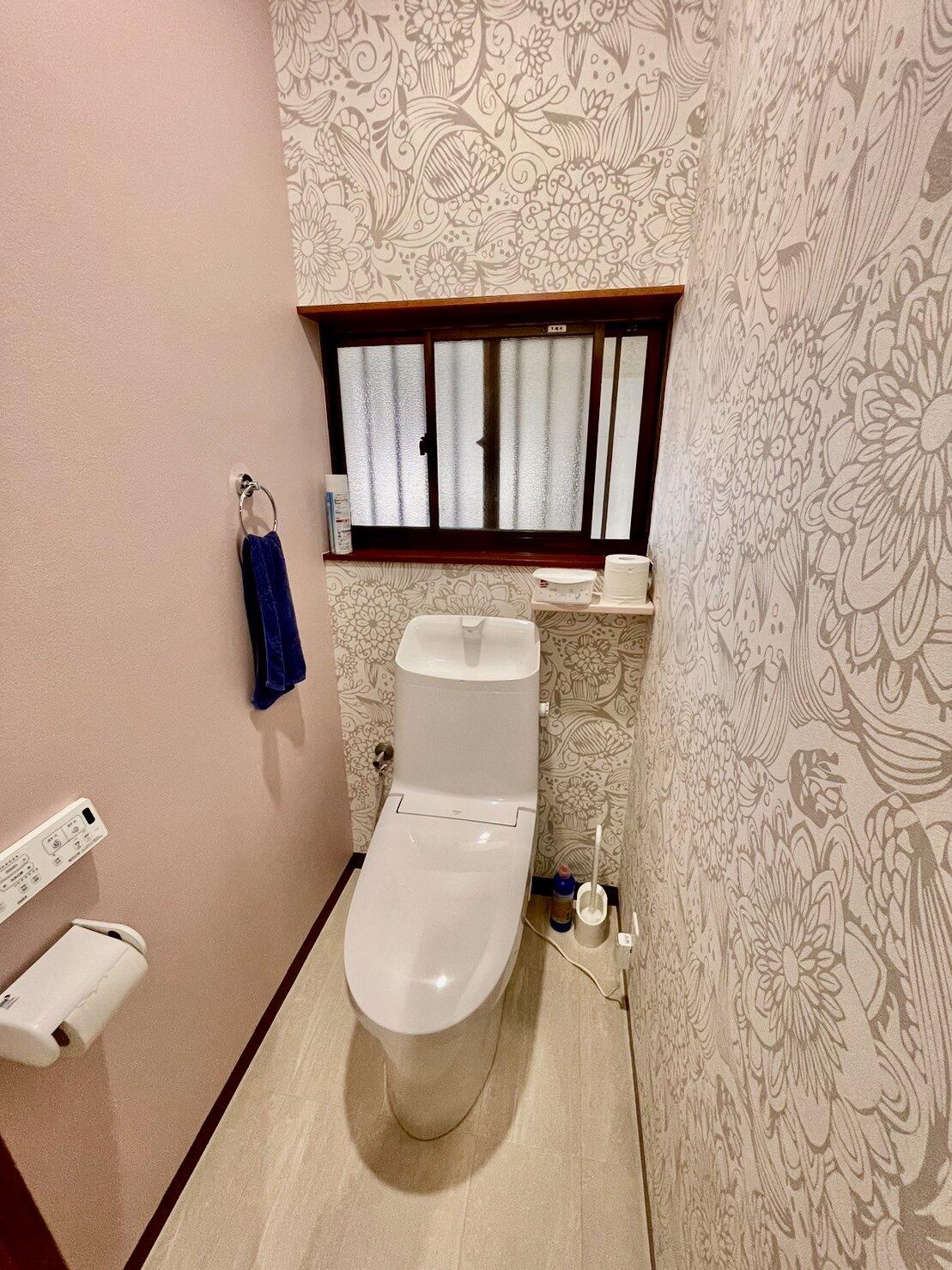S様邸ではトイレ空間だからこそ出来る、遊び心のある壁クロスで、施工前よりも明るく、華やかな印象に♪