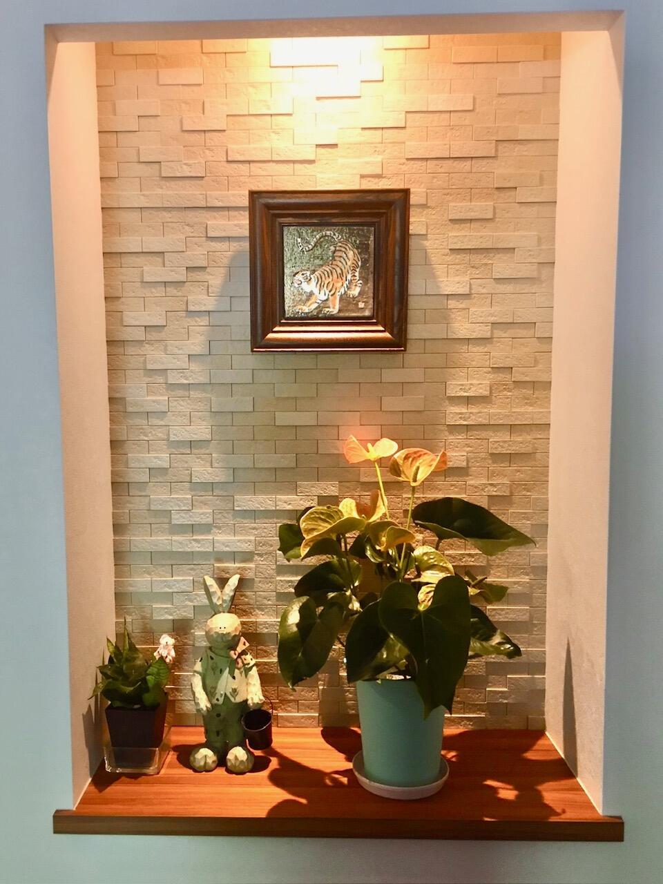ストーン調の壁紙は落ち着い印象で、間接照明との相性も良く、帰宅時に心休まる玄関空間が、