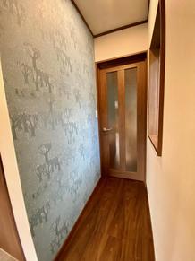 スモーキーブルーの【アクセントクロス】が魅力的なウッド調玄関