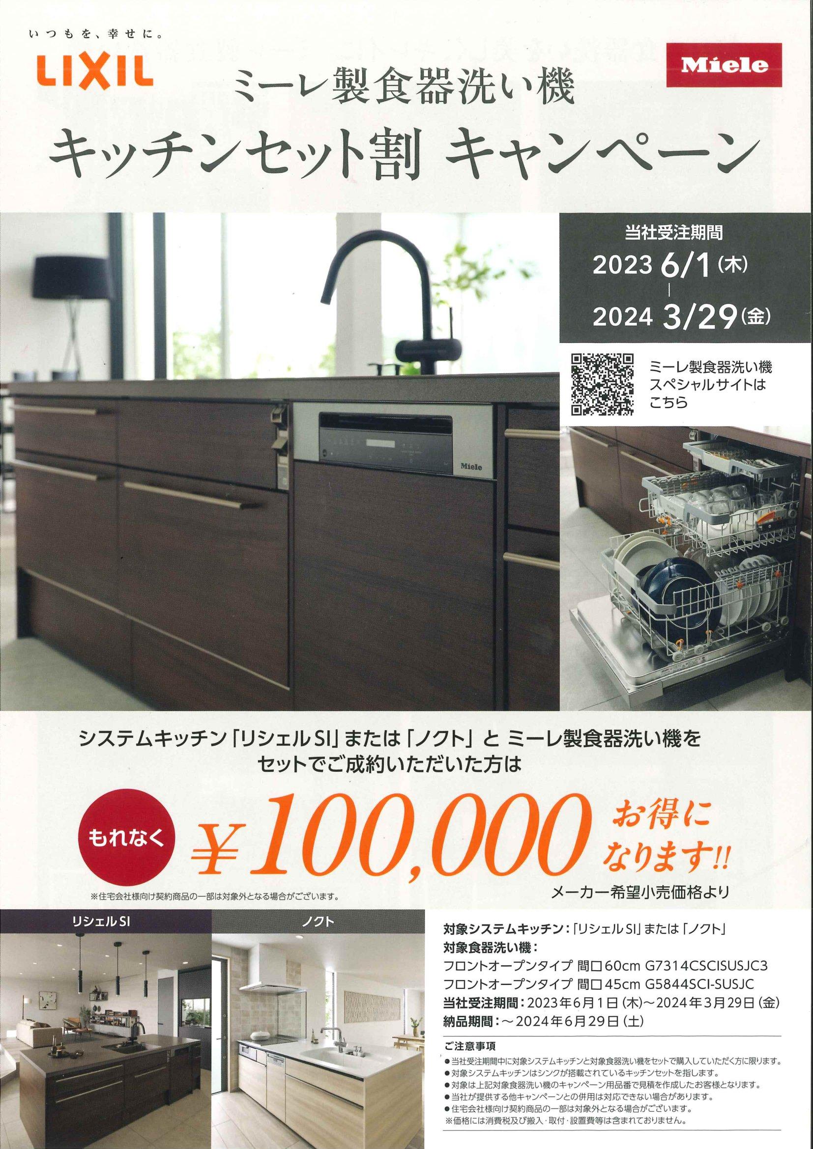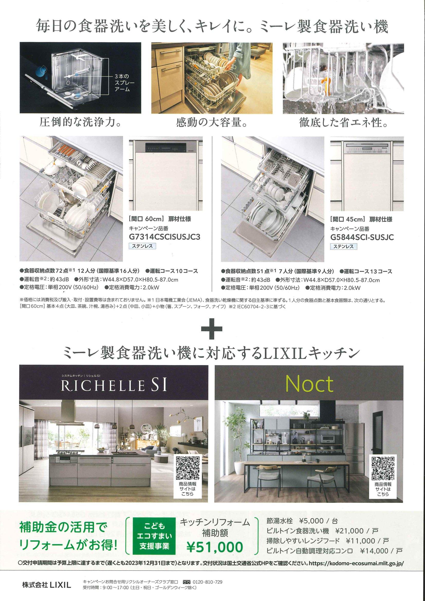 期間中にLIXILのシステムキッチン「リシェルSI」「ノクト」と合わせてミーレ製の食器洗い機をご成約いただくことで、